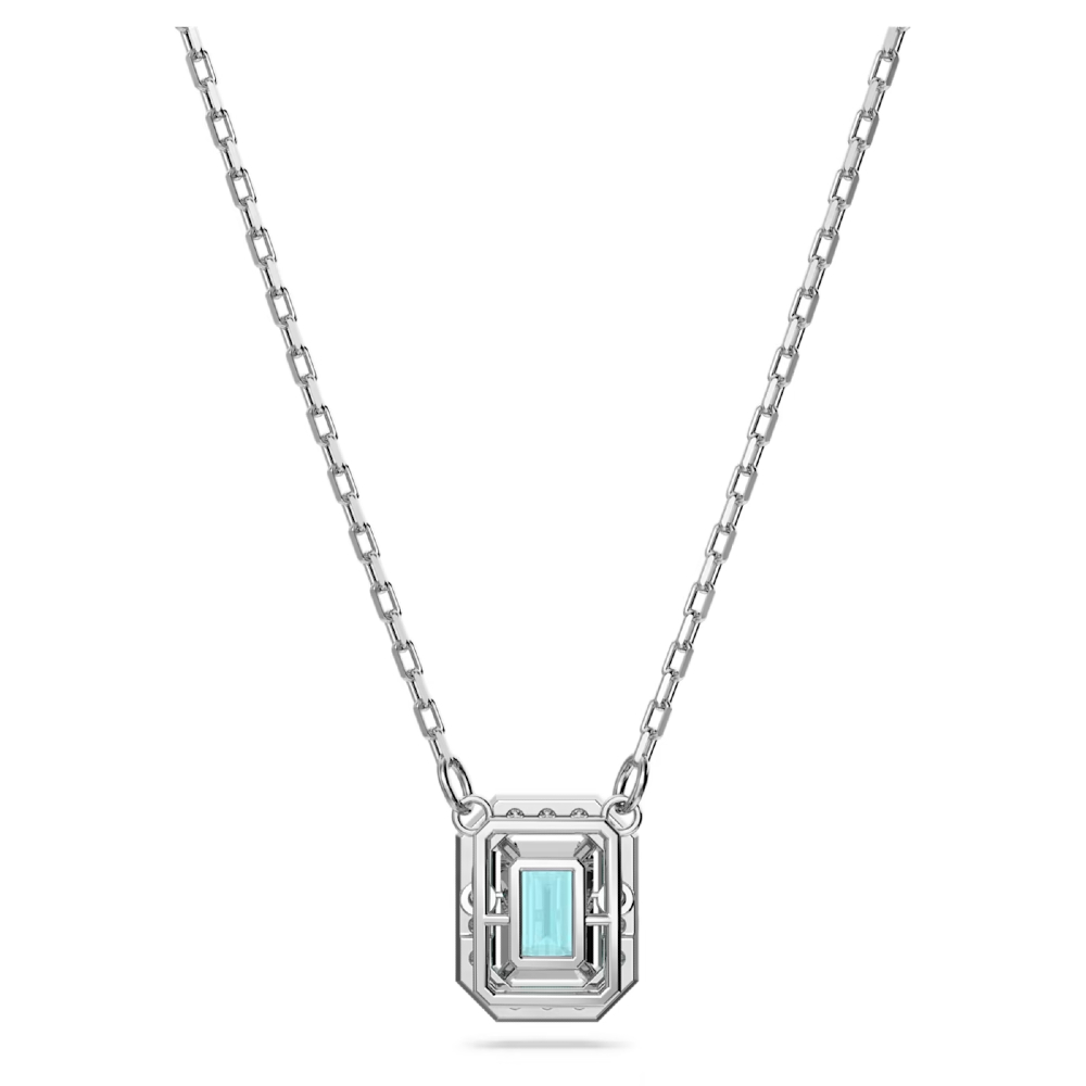 綠色的八角形切割寶石以較小的透明寶石為框架,將其串接在一條光滑的鍍銠鏈條上。
