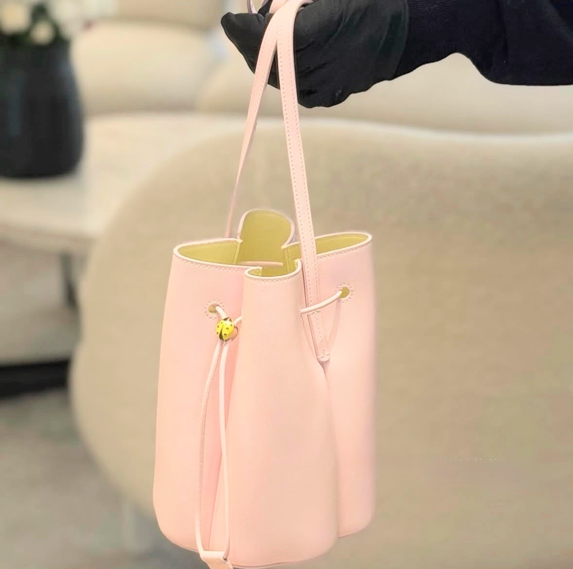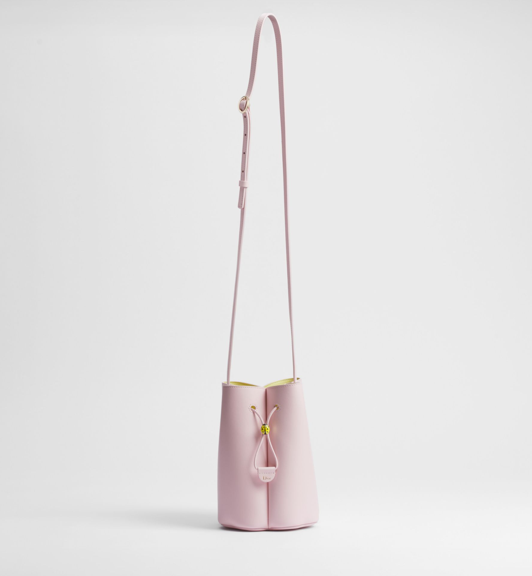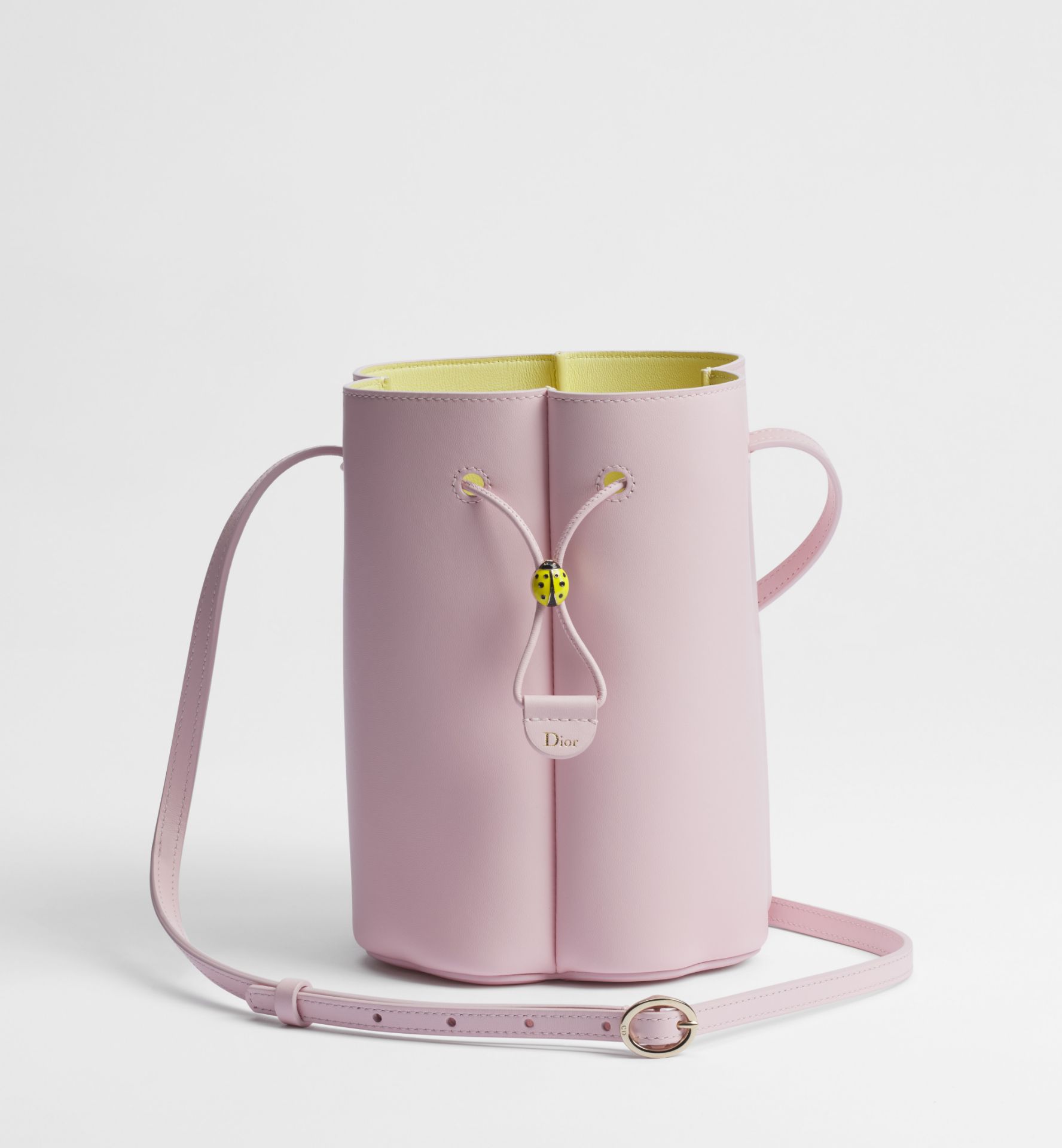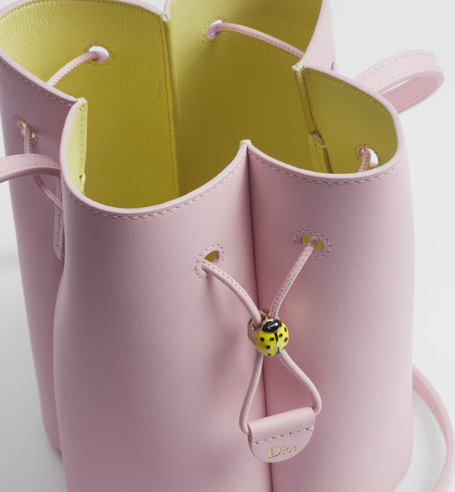 Petit Trèfle 迷你水桶包以奇幻迷人的設計為品牌的幸運符號注入一股清新氣息,並點綴琺瑯金屬瓢蟲。光滑小羊皮款式搭配 Dior Clover 幸運草標誌的陽光黃色(Buttercup)內層,可容納所有必需品,並可使用背帶肩背或斜背。