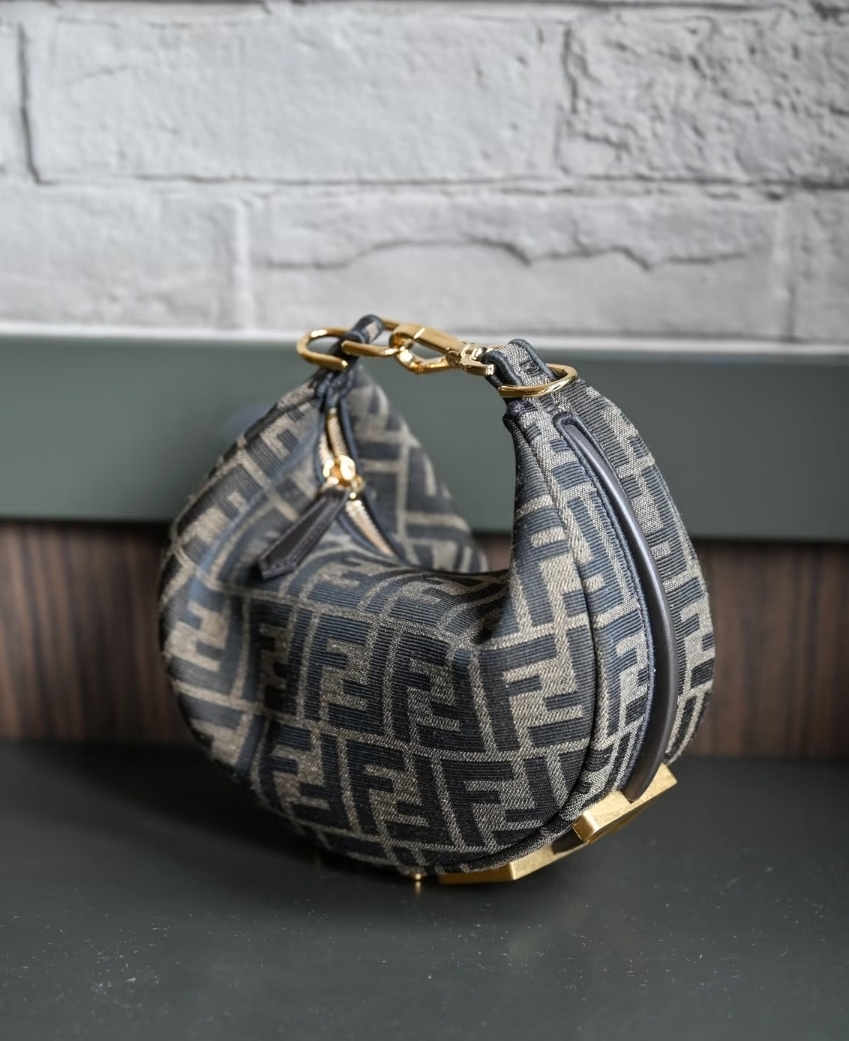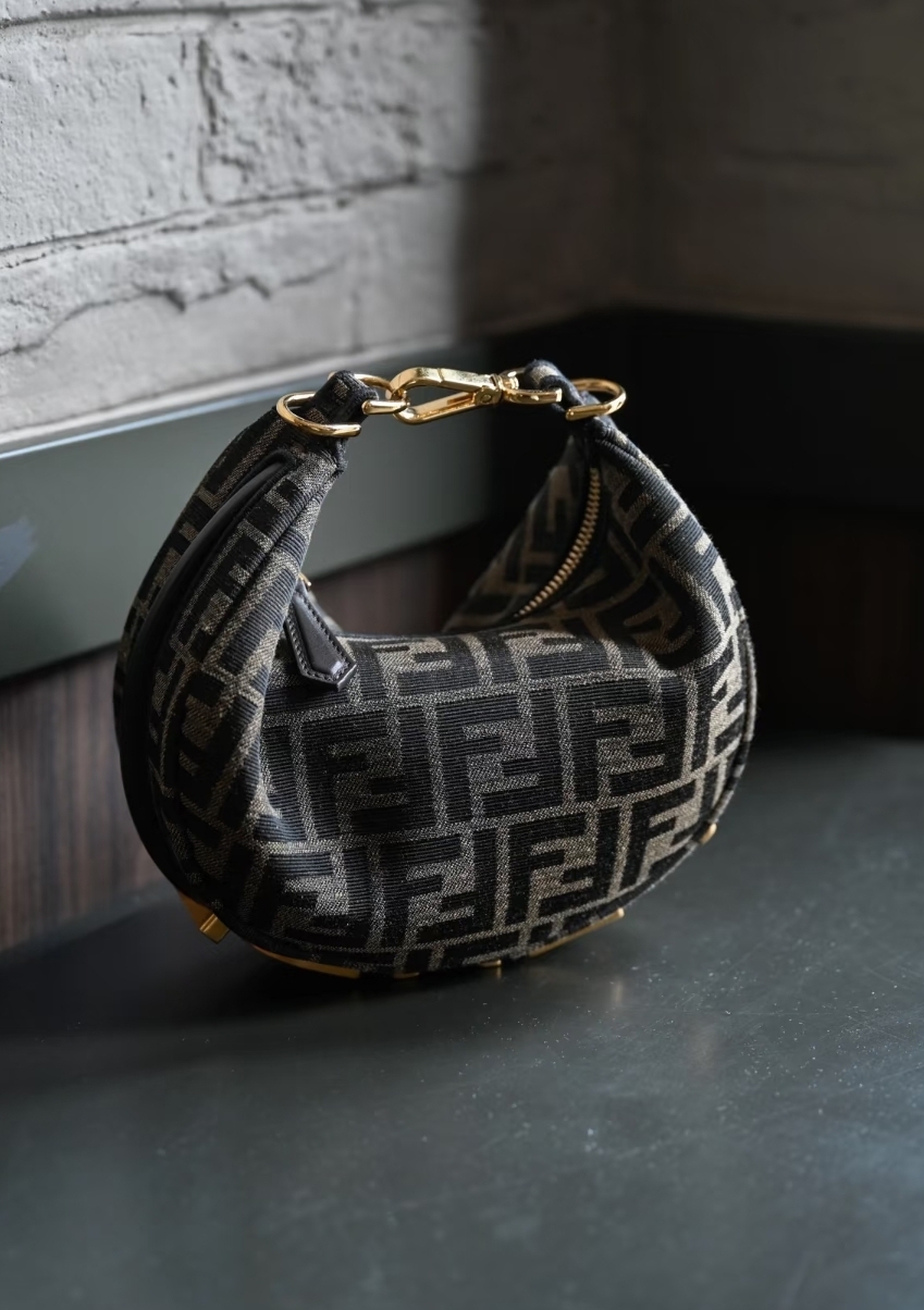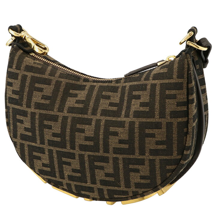 迷你半月包,以棕色FF提花圖案布料製成,飾有復古金色金屬FENDI字樣。