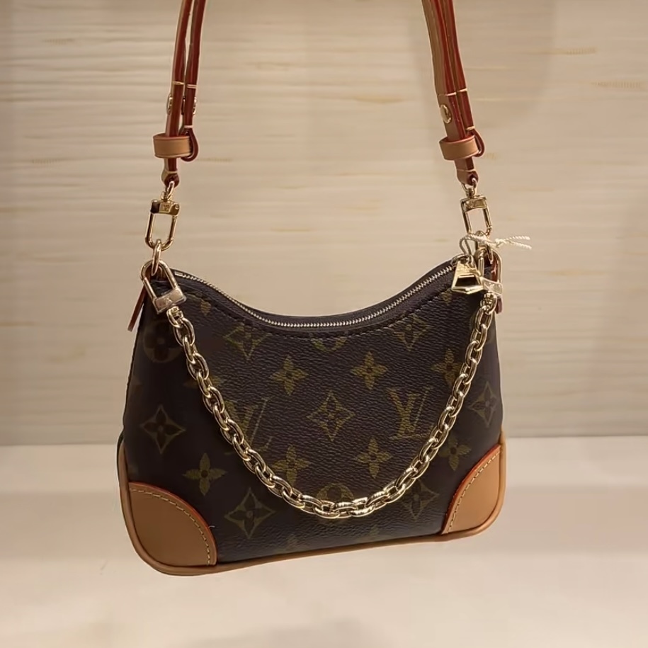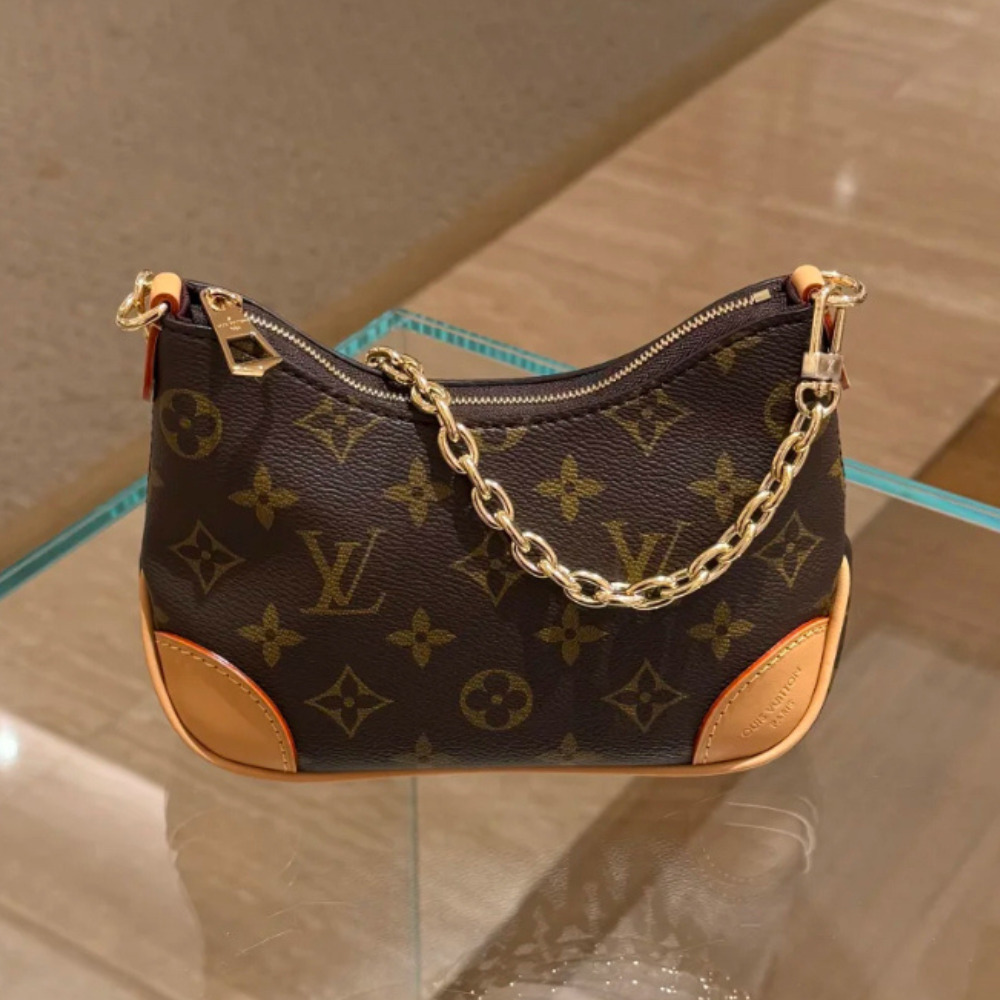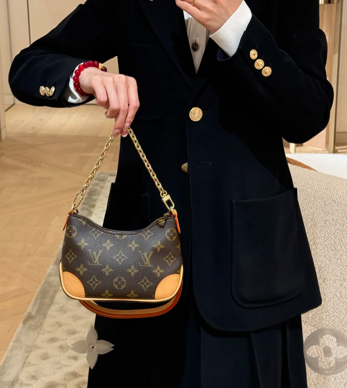 這款Nano Boulogne以標誌性的Monogram帆布打造日夜場合皆宜的季節性袋型,向品牌的標誌性傳統致敬。款式飾有對比鮮明的皮革飾邊,並以可按個人喜好拆除的金色鏈條完美點綴。這款包包尺寸小巧卻格外實用,能容納各種日常必需品,並可作多種不同方式攜帶。