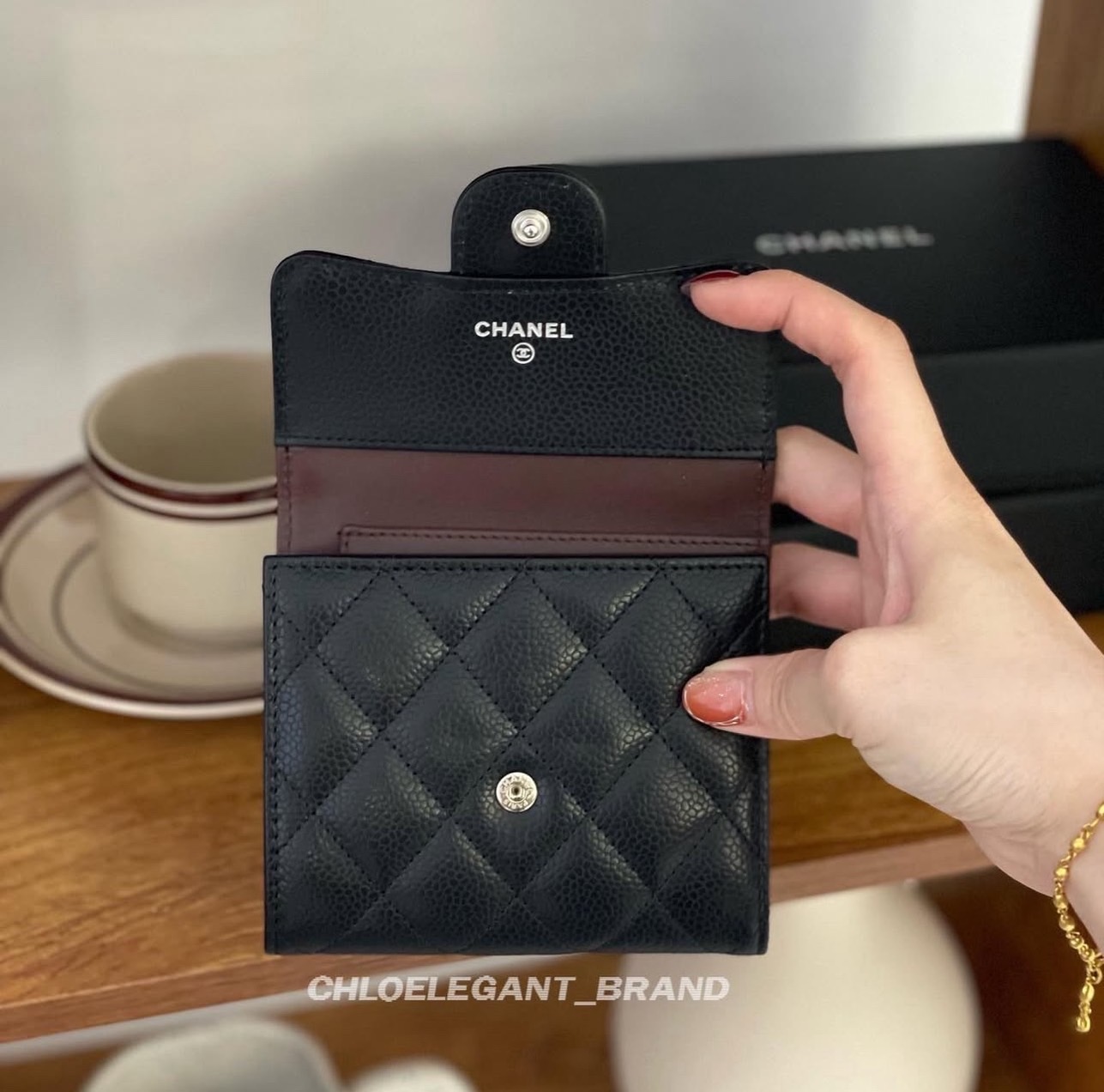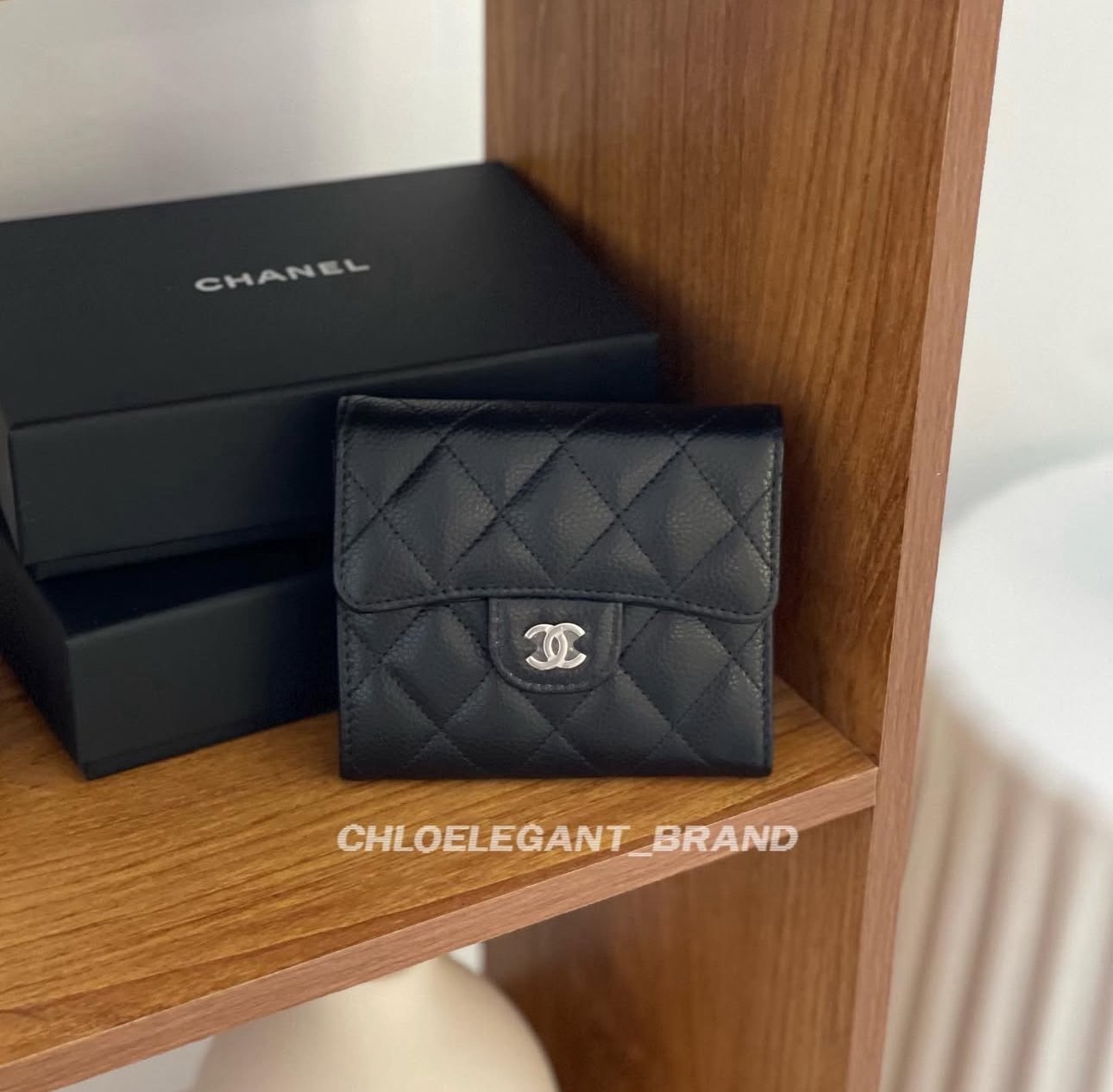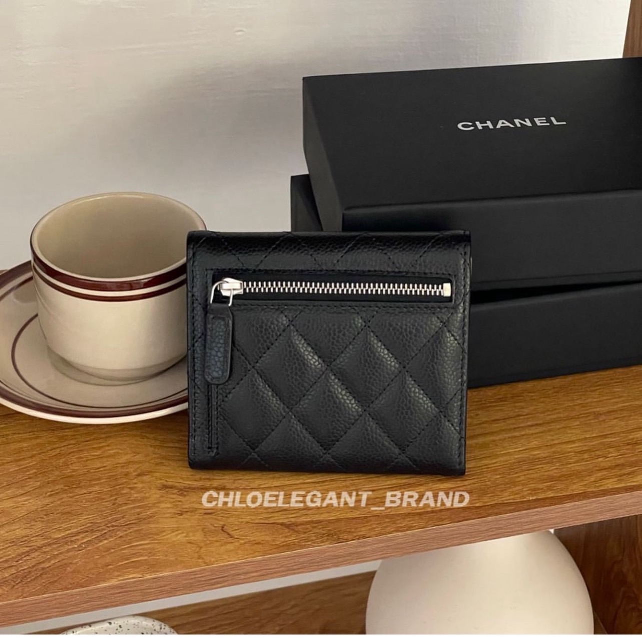香奈兒經典菱格紋小型短夾,採用黑色荔枝皮(Caviar Leather) 搭配金色雙C Logo,質感高雅又耐刮 設有多個卡槽與鈔票夾層,收納實用又不厚重,是日常最百搭的入門款小香精品配件 💫