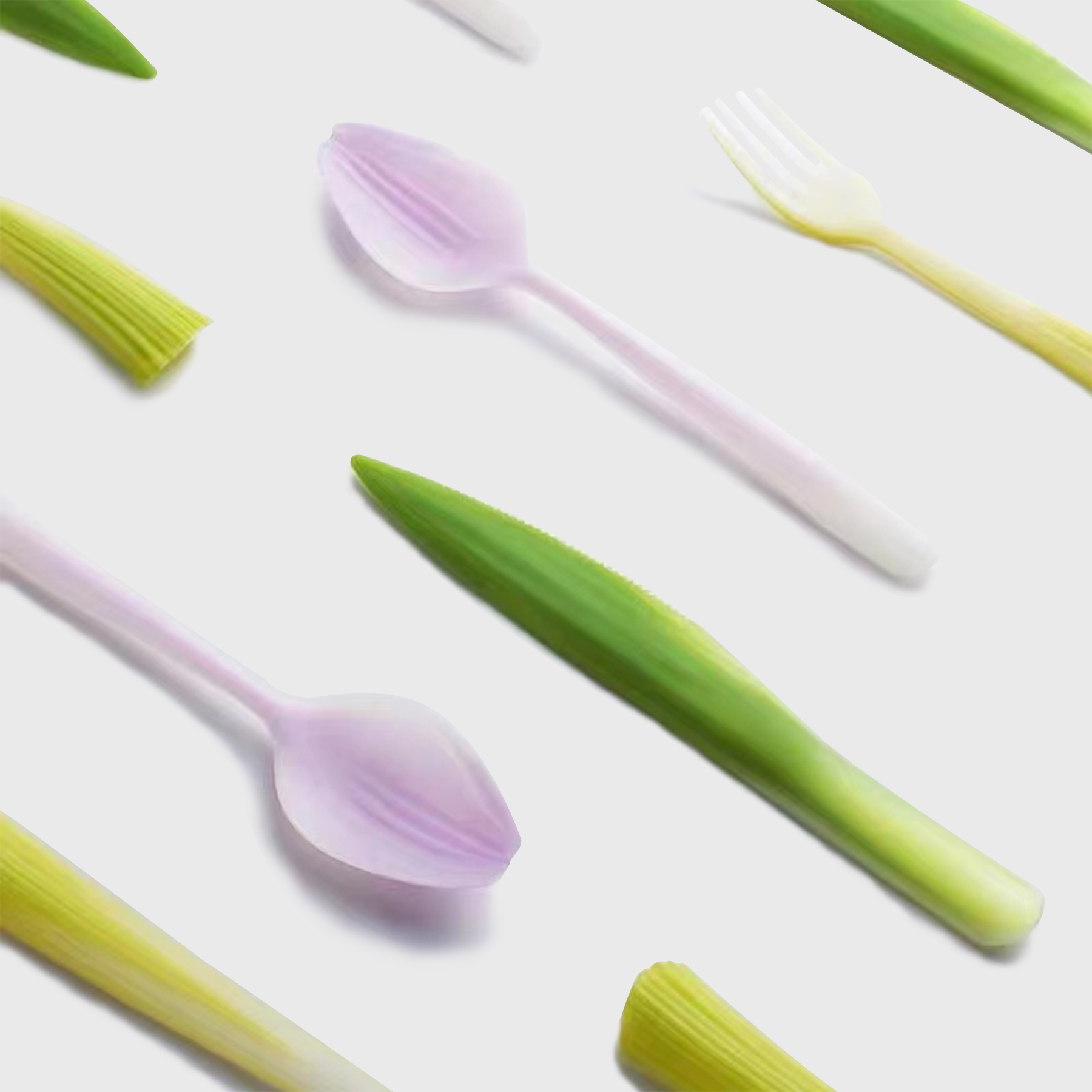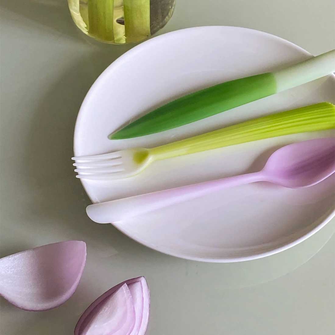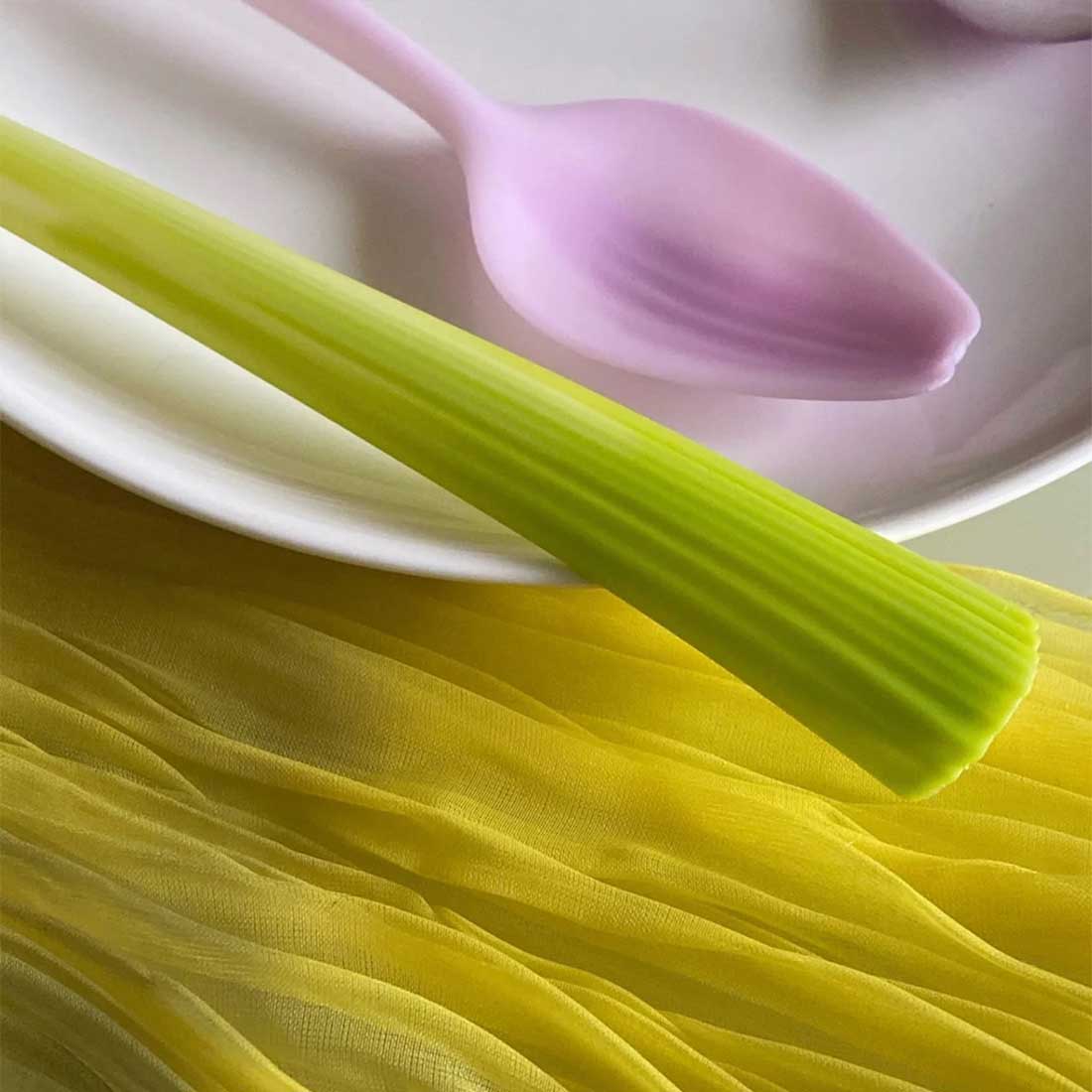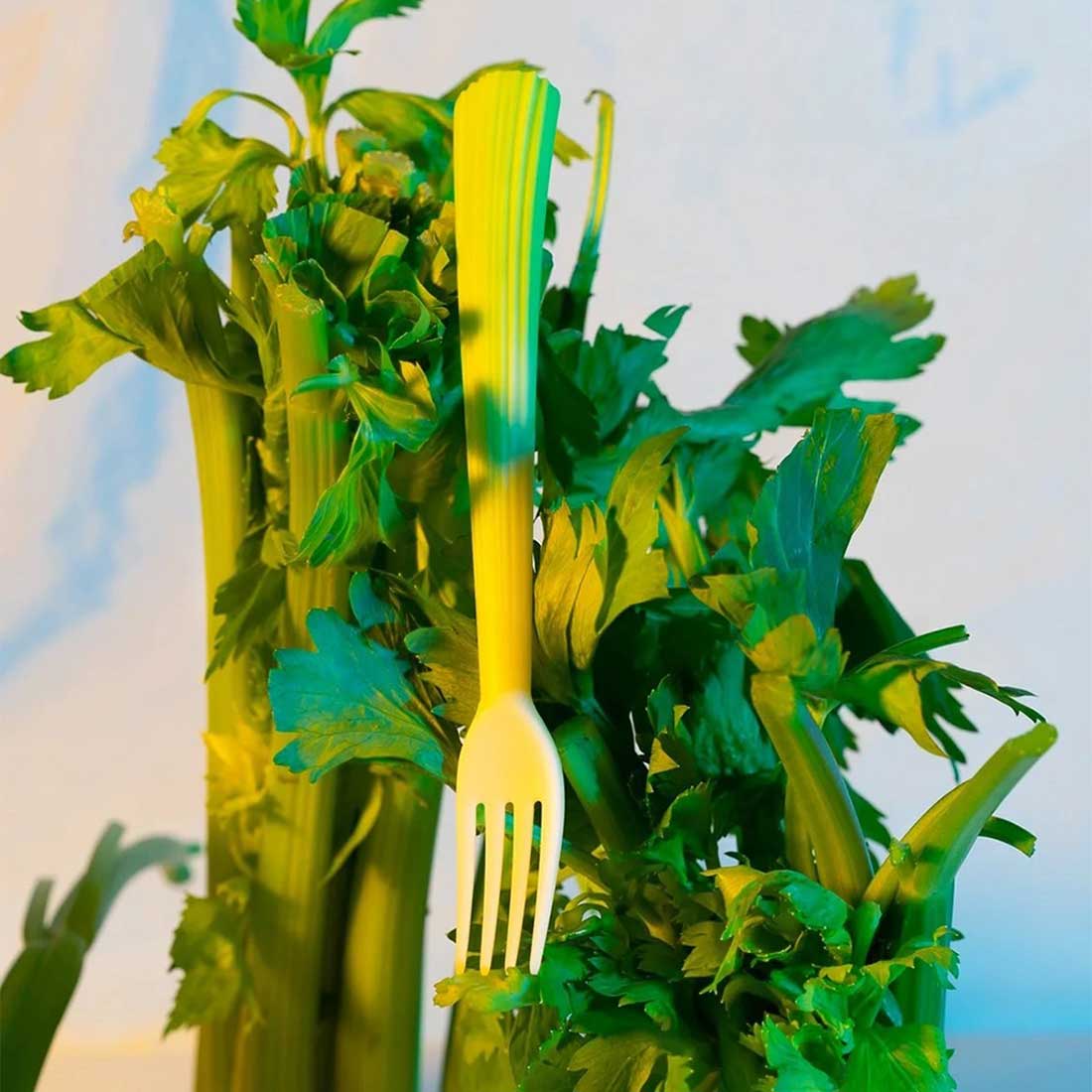 嫁接系列餐具由生物塑料聚乳酸製成,來源於可再生資源並且可以完全生物降解。設計從食材的表皮獲得靈感,在產品上重現其植物來源——芹菜握柄嫁接在餐叉上,朝鮮薊的花瓣轉化成湯勺,帶齒的菠蘿葉成為餐刀。一次性塑料製品對環境造成的污染已經不容忽視,除了化石基塑料本身難以分解這一因素以外,人們長久養成的 「即用即棄」的生活方式也是主要原因。如何扭轉人們對塑料廉價和不耐用的刻板印象,同時開始關注材料的來源及去向,是這一項目的關鍵。一種來源於玉米、甘蔗或木薯等植物的塑料聚乳酸PLA,可以通過工業堆肥的方式實現完全生物降解再生和降解速度都比傳統塑料快得多。這些用 PLA製作的餐具帶有植物一樣的表皮,向人們發問:你還會輕易地把它們拋棄嗎?借此,希望人們減少使用一次性產品,而選擇可以長久使用的產品。