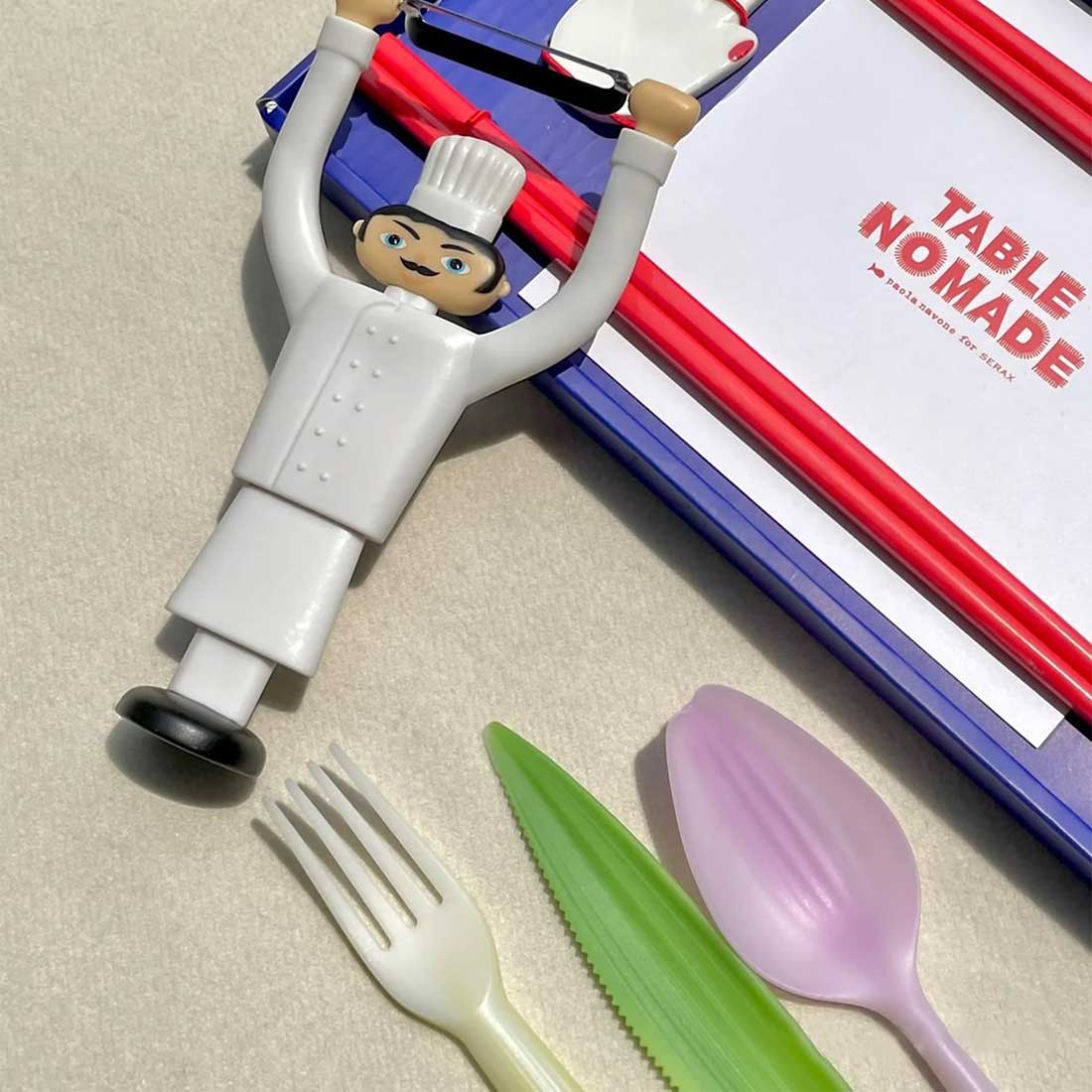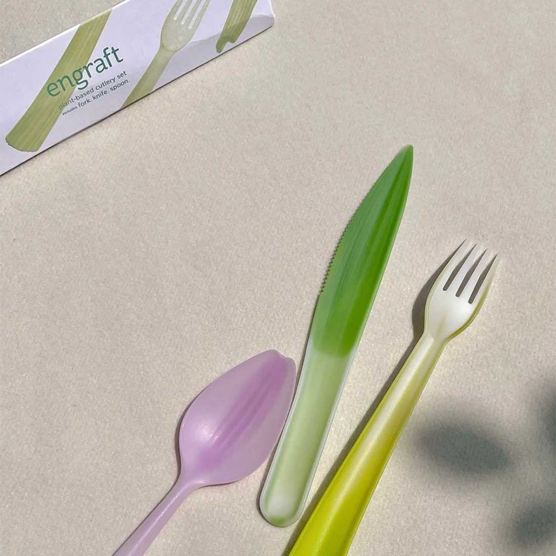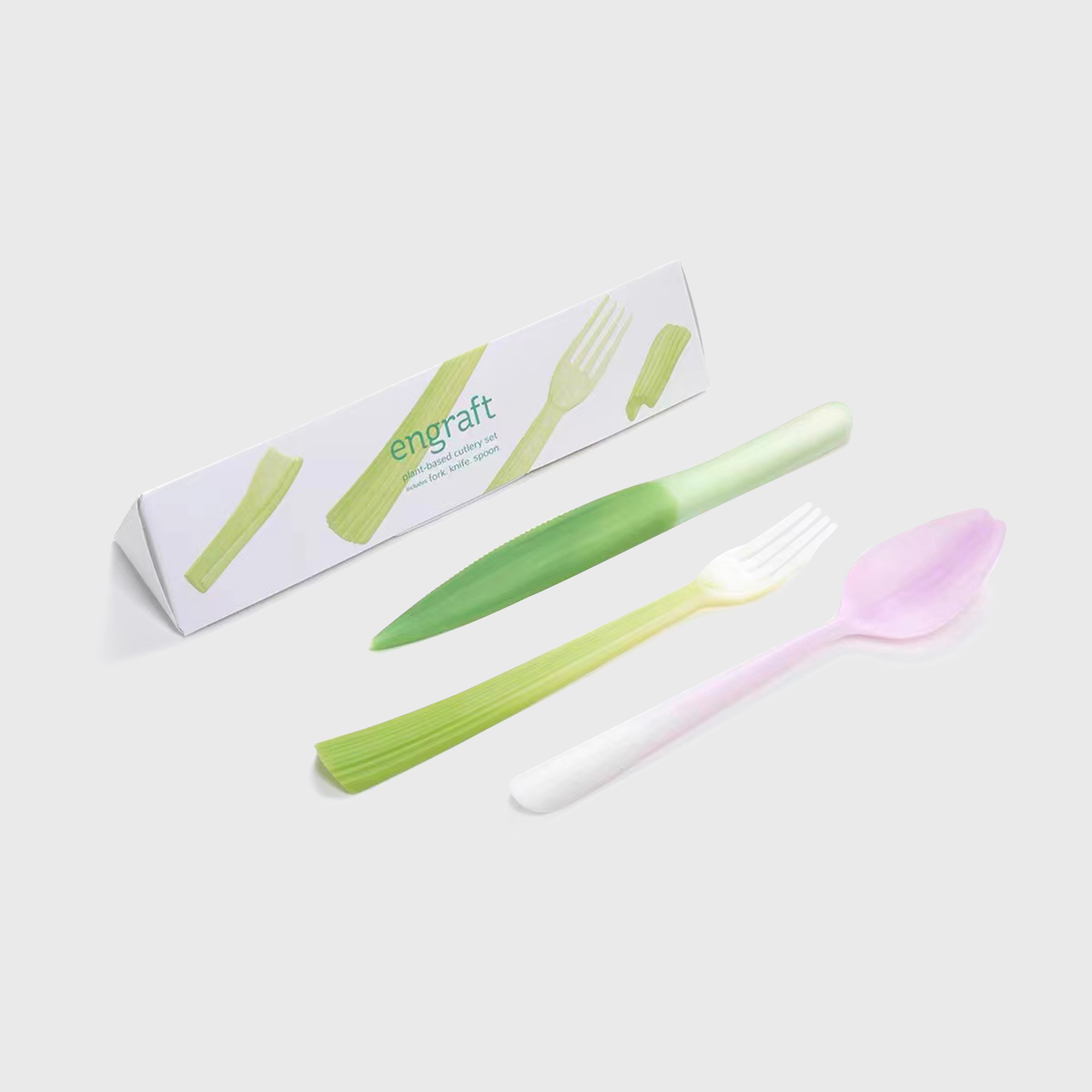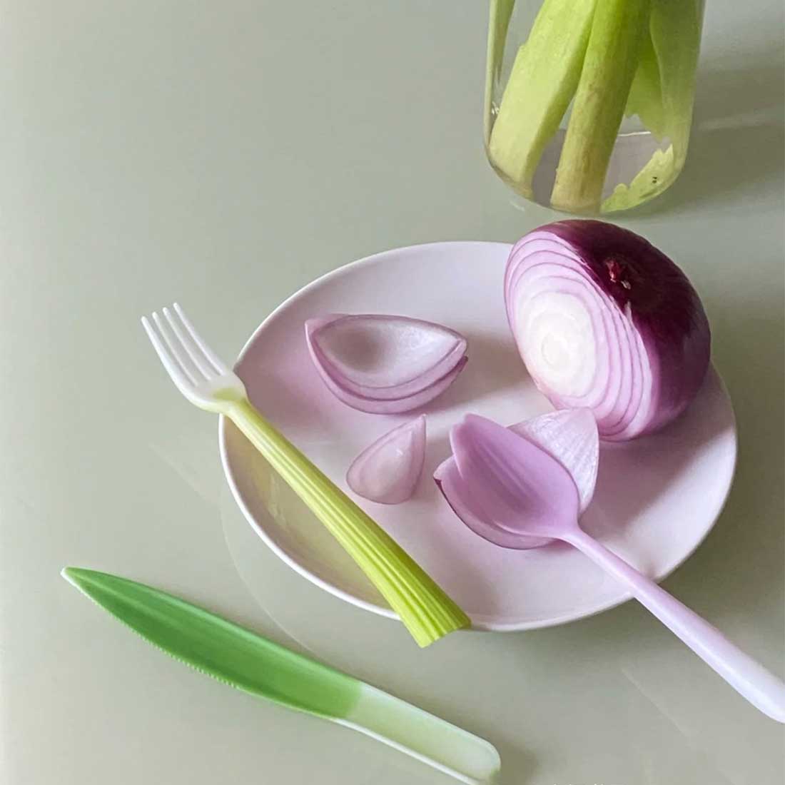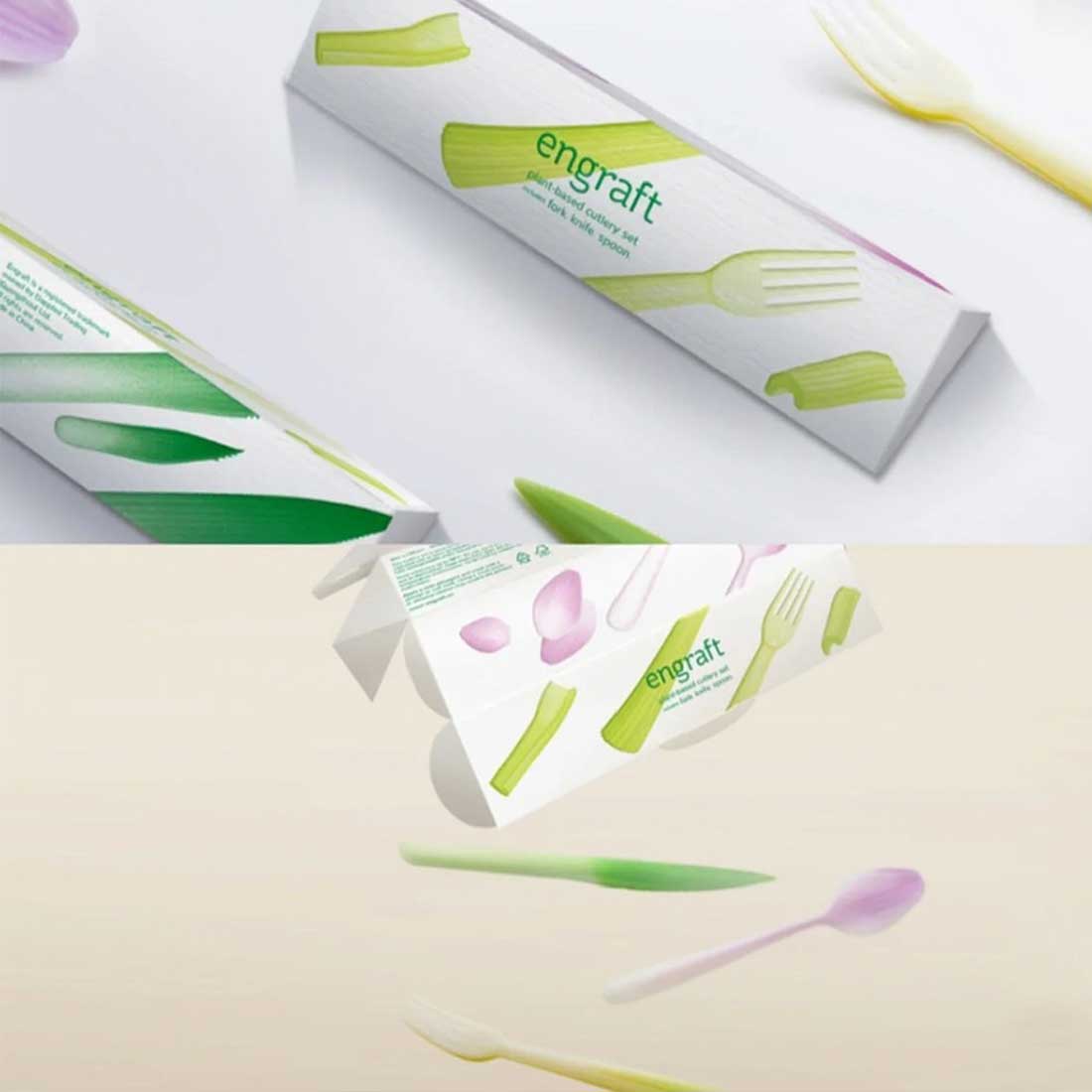 嫁接系列餐具由生物塑料聚乳酸製成,來源於可再生資源並且可以完全生物降解。設計從食材的表皮獲得靈感,在產品上重現其植物來源——芹菜握柄嫁接在餐叉上,朝鮮薊的花瓣轉化成湯勺,帶齒的菠蘿葉成為餐刀。一次性塑料製品對環境造成的污染已經不容忽視,除了化石基塑料本身難以分解這一因素以外,人們長久養成的 「即用即棄」的生活方式也是主要原因。如何扭轉人們對塑料廉價和不耐用的刻板印象,同時開始關注材料的來源及去向,是這一項目的關鍵。一種來源於玉米、甘蔗或木薯等植物的塑料聚乳酸PLA,可以通過工業堆肥的方式實現完全生物降解再生和降解速度都比傳統塑料快得多。這些用 PLA製作的餐具帶有植物一樣的表皮,向人們發問:你還會輕易地把它們拋棄嗎?借此,希望人們減少使用一次性產品,而選擇可以長久使用的產品。