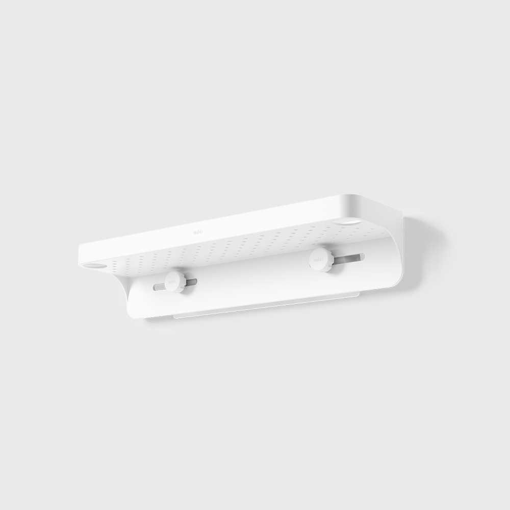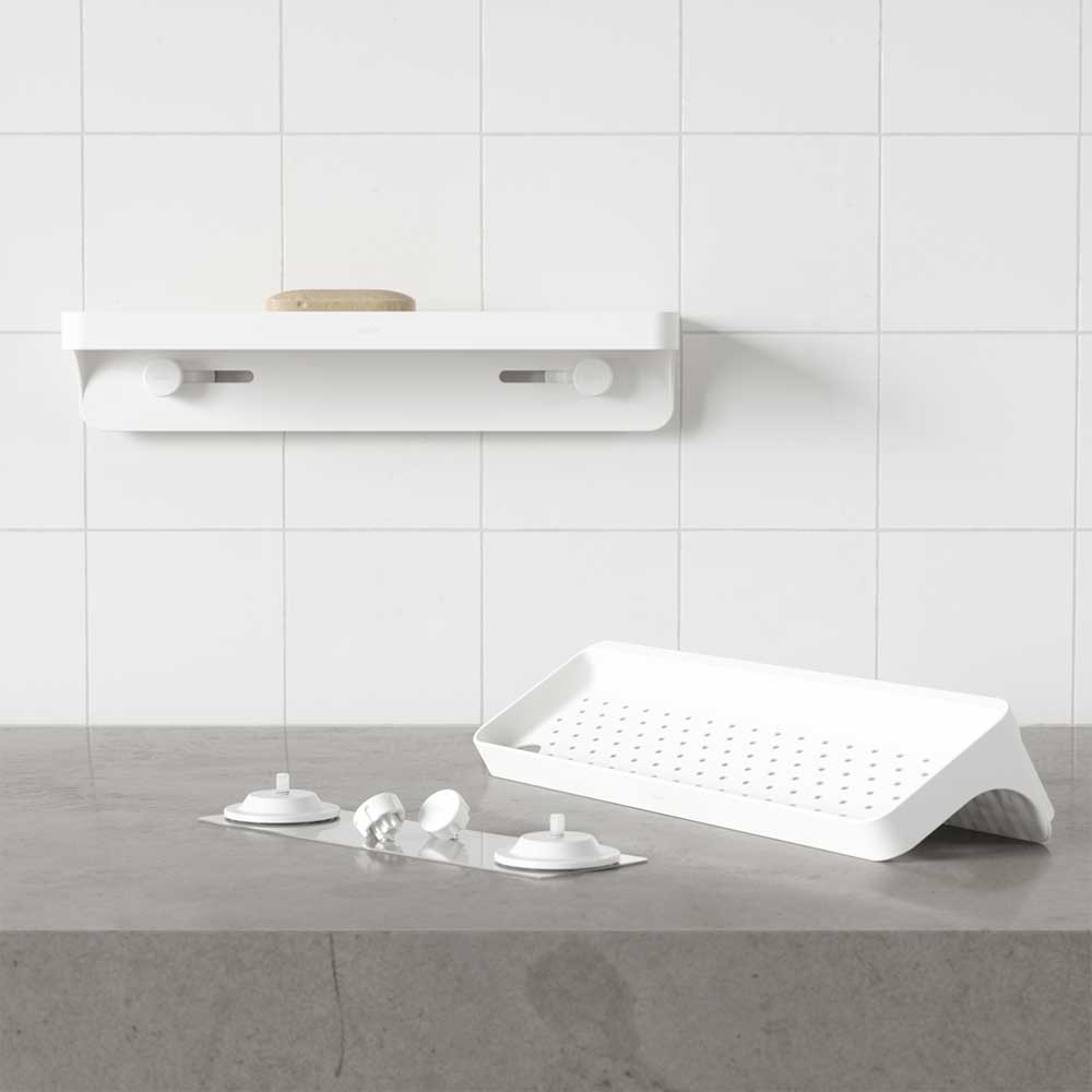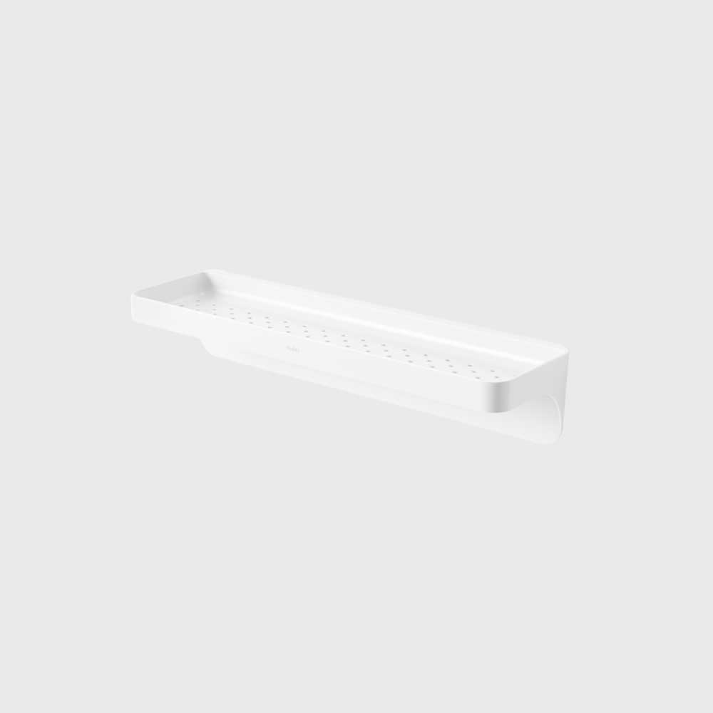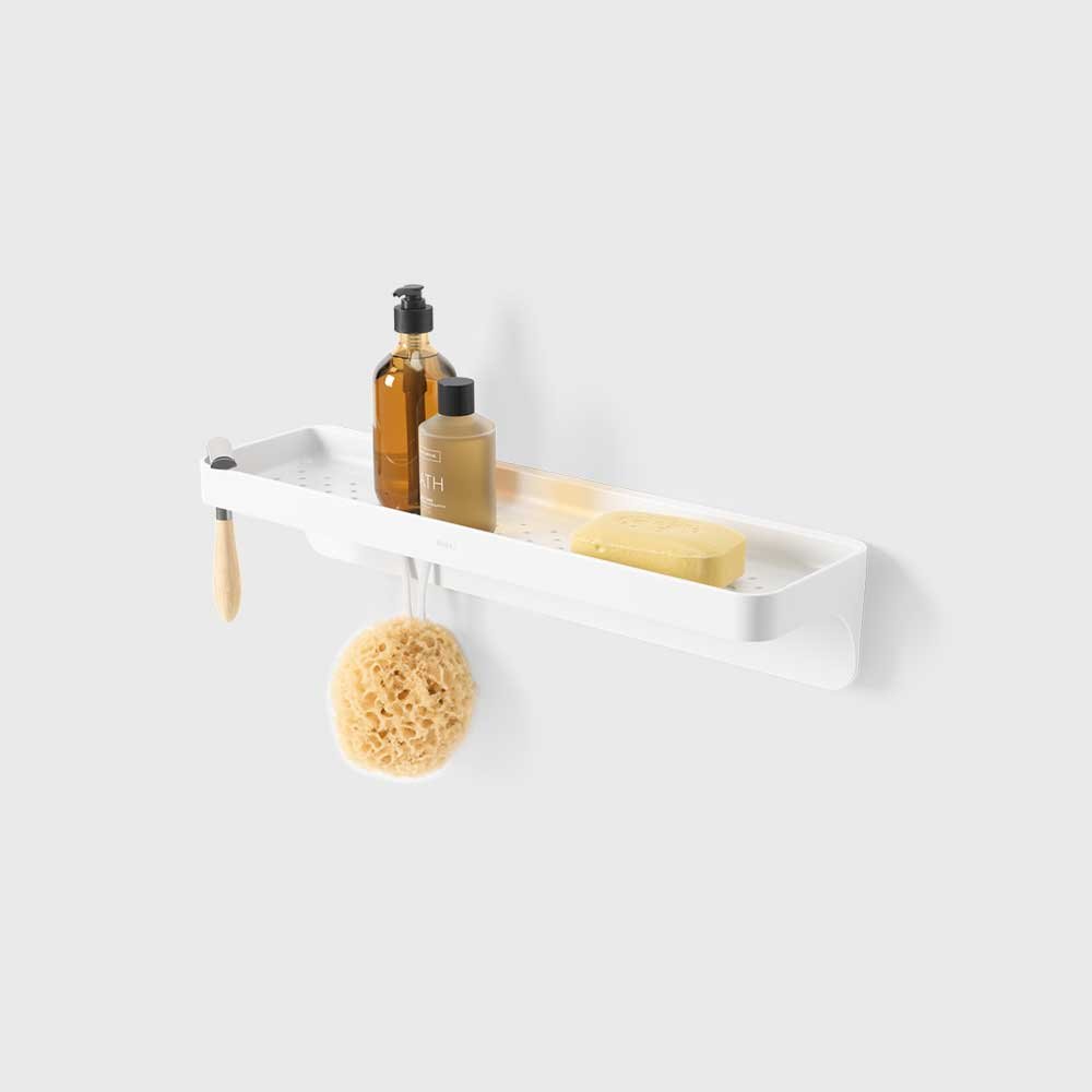 FLEX 菲樂黏鉤免釘置物架可有效的整理衛浴空間及檯面。易於安裝,內含無損防水黏合條,可黏貼在磁磚、混凝土等表面上(不適用於多孔表面)。這款現代浴室架子可容納瓶罐或肥皂,還設有兩個孔洞,方便存放刮鬍刀。 Flex 黏合架防鏽並附有整合式排水孔。尺寸為41 x 11.7 x 8.6 公分,最多可容納4.5 公斤。