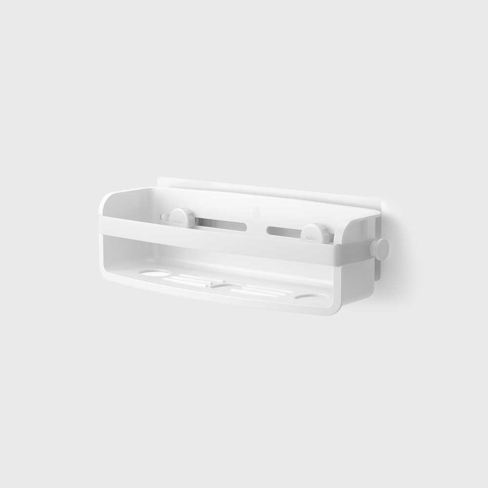 Flex 收納箱易於安裝,內含無損防水黏合條,可黏貼在磁磚、乾牆、混凝土等各種表面上(不適用於多孔表面)。 Flex收納箱可存放洗髮精、沐浴乳、肥皂瓶等物。整合排水孔有助於保持箱內整潔。 Flex 收納箱尺寸32.7 x 11.7 x 8.6 公分。