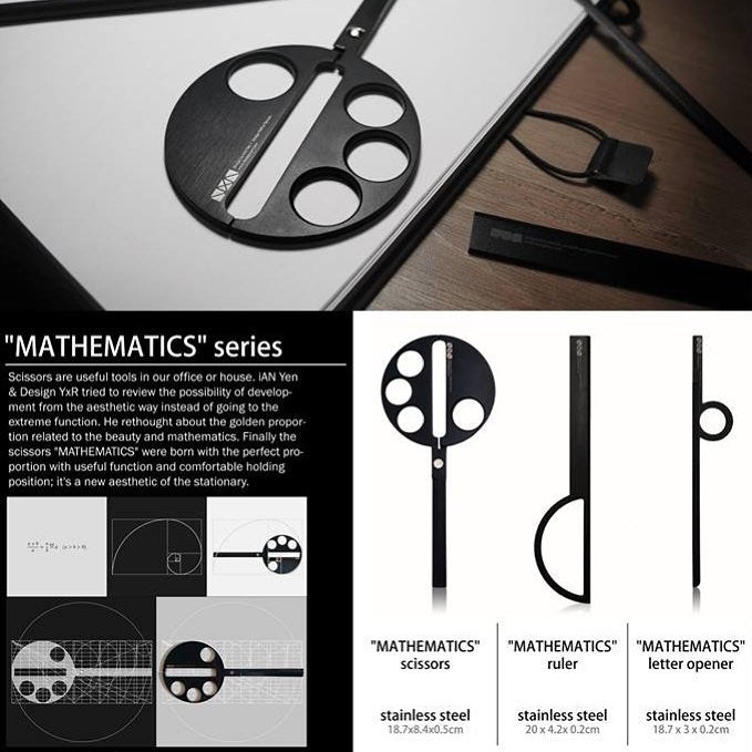 YEN OBJECT 由思想出發,取材於東方哲學思考,藉由推演與轉譯重新演繹設計。在過去,東方歷史中並未專注談論設計一門學問,更多的是潛移默化於藝術當中。而現在,YXR 藉由東方設計思考,以"思想概念"為結構,打破對於型態的框架,重新塑造新東方美學。 我們能在日常生活感受到初衷的美是什麼?這種美來自於何方?為什麼第一眼就令人心動不已。將數學常數中 1:1.618 的黃金比例應用在思考物件的定義上,透過比例的分割設計出數學剪刀、數學拆信器及數學尺儀三件作品的巧妙造形。數學系列藉由不可解的美學構成找到簡約和創新的型態,在長度、寬度與圓弧角度上衍生純粹而有想法的物件。YEN OBJECT衍物在審視物件的型態過程中,帶領思考和重新領略事物間「美」的存在。