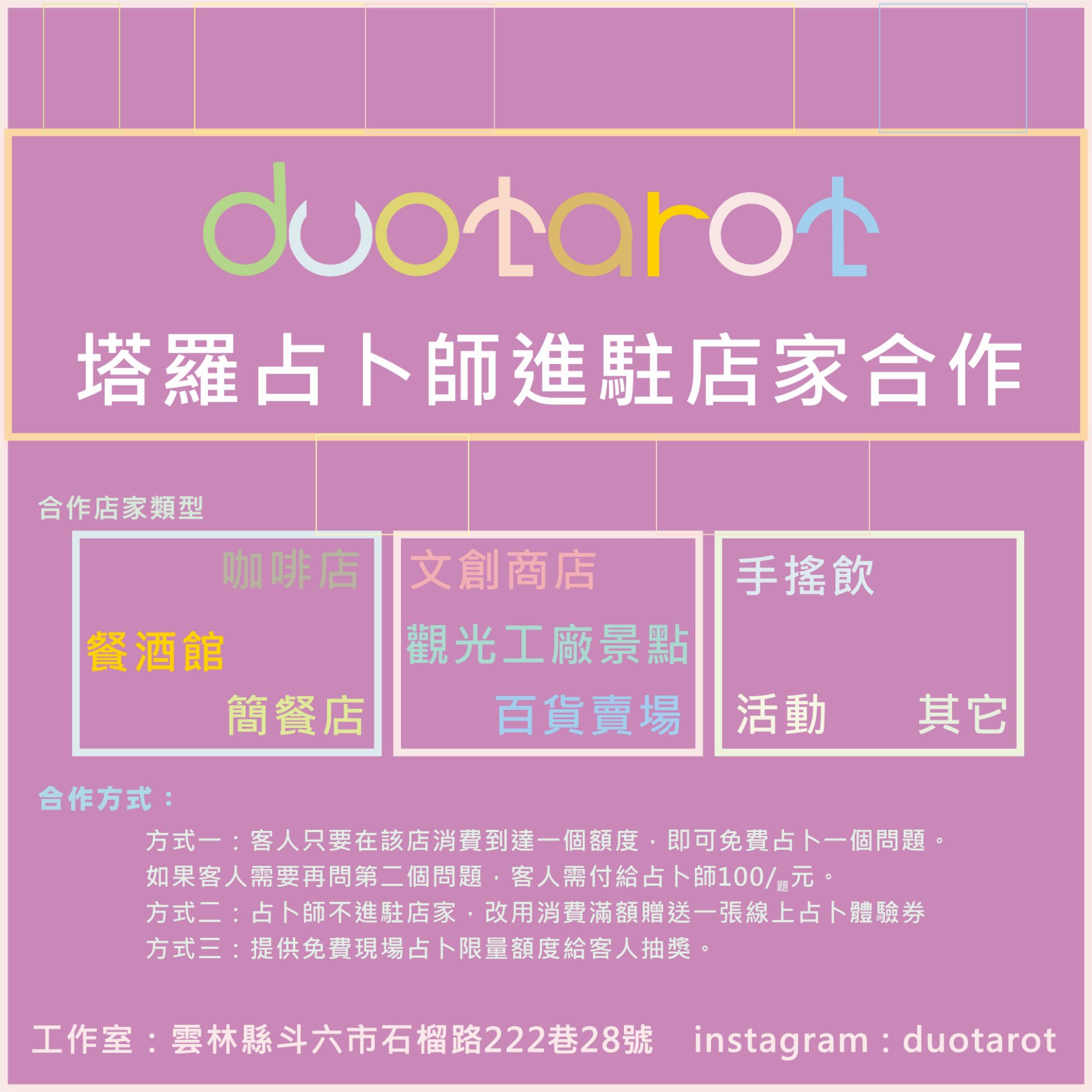 工作室地址:雲林縣斗六市石榴路222巷28號占卜師:陳宇宥 IG:duotarot