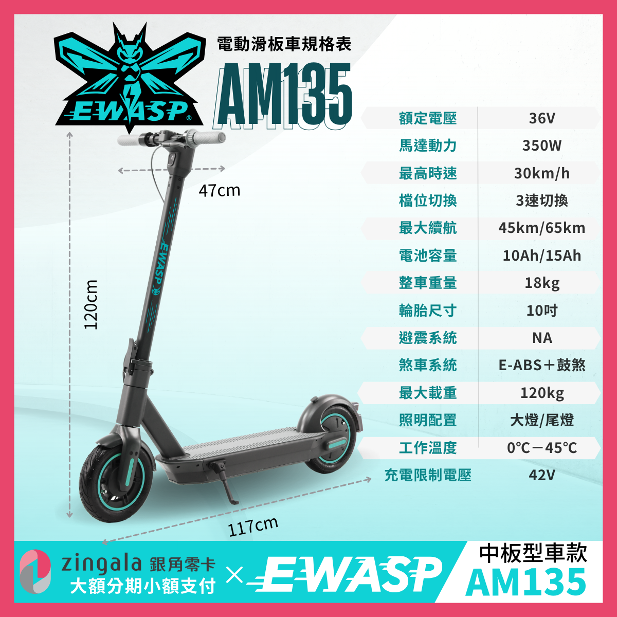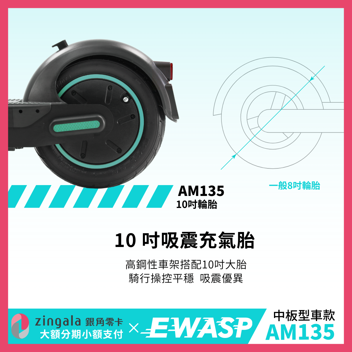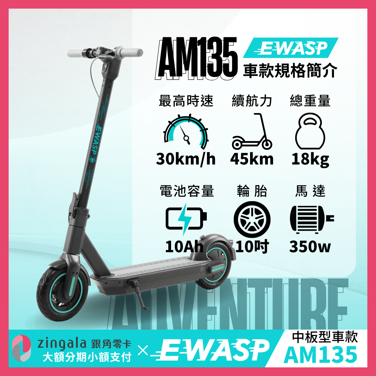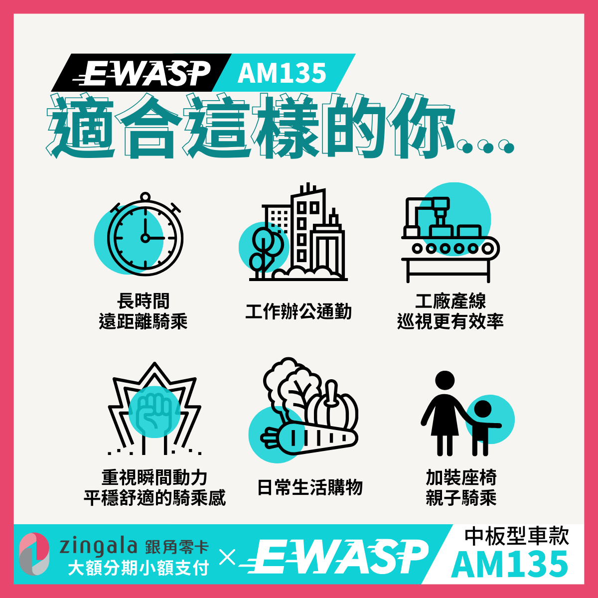 EWASP電動滑板車A系列的AM135中版型車款,為中型電動滑板車,續航力約30至65公里,特色為平穩路感、騎乘操控優異靈活、收折後方便攜帶、適合遠程往返代步。AM135適應的族群包含上班族通勤、電動滑板車代步、男女各族群、四處玩樂享受騎乘樂趣、結合大眾運輸交通工具、鄰近採購、河堤兜風、放在汽車後車廂代步等,EWASP有專業的團隊嚴格控管所有生產環節,一手包辦設計、製造、OEM代工、零售甚至是售後保固,以快速收折、輕巧移動、戶外活動的設計理念融入生活中。