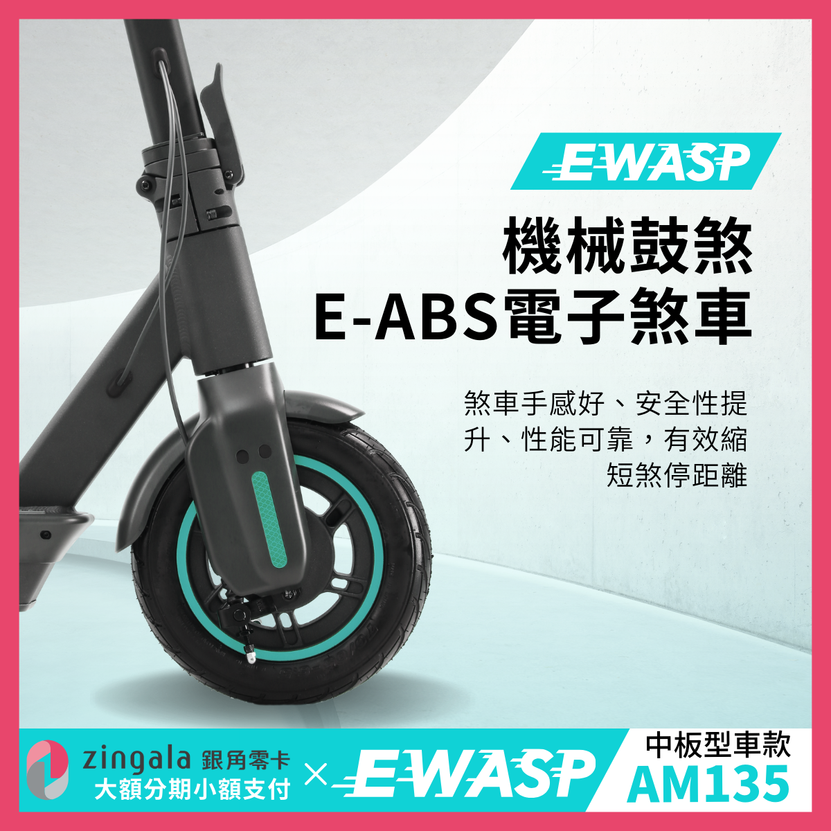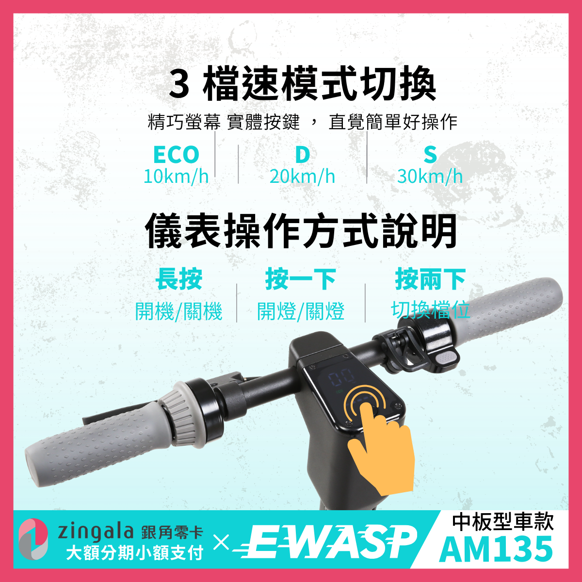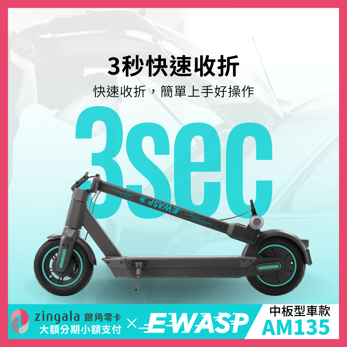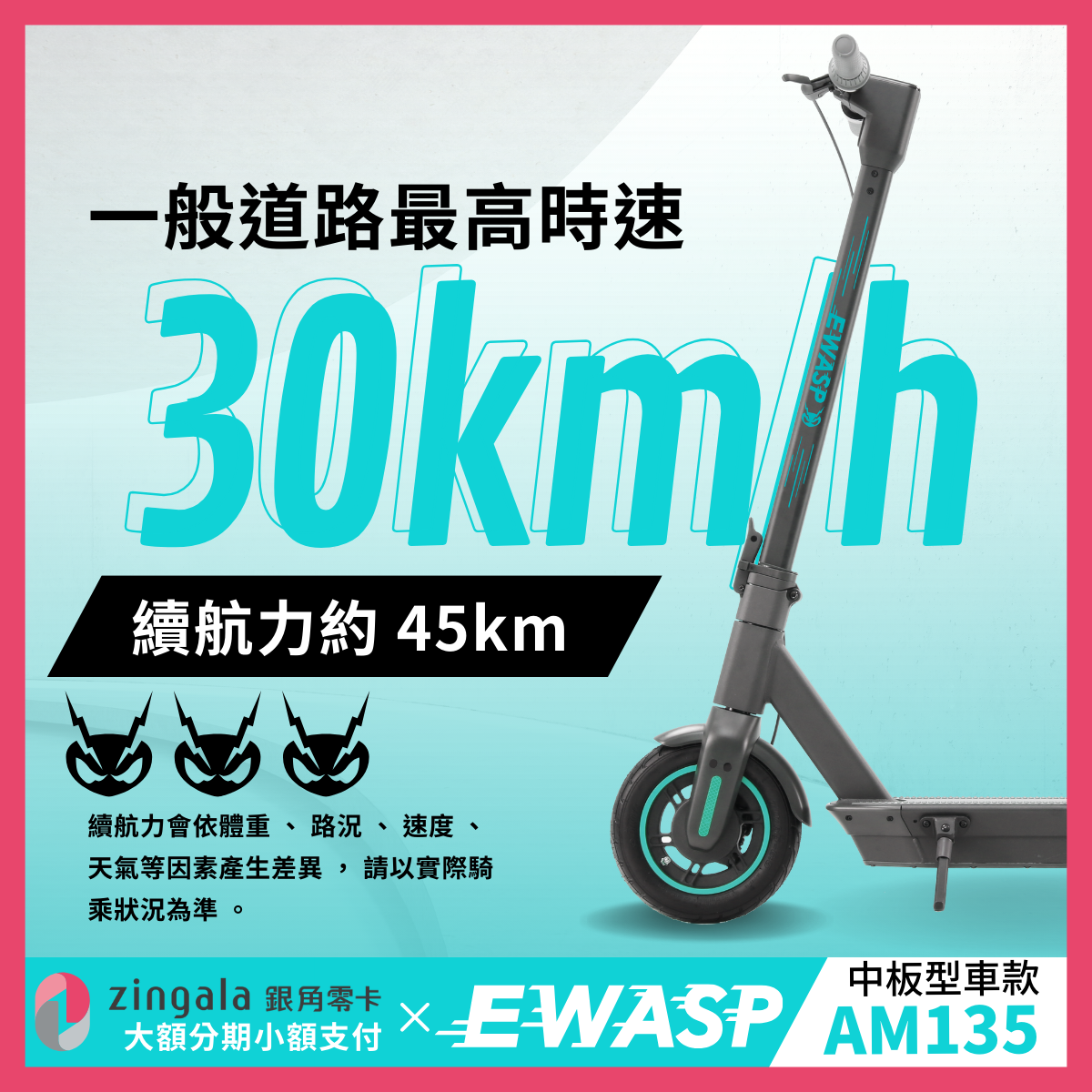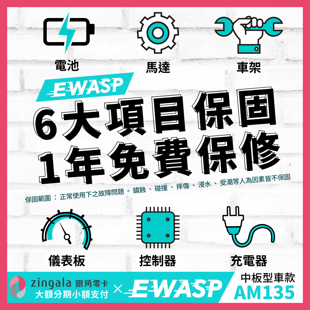 EWASP電動滑板車A系列的AM135中版型車款,為中型電動滑板車,續航力約30至65公里,特色為平穩路感、騎乘操控優異靈活、收折後方便攜帶、適合遠程往返代步。AM135適應的族群包含上班族通勤、電動滑板車代步、男女各族群、四處玩樂享受騎乘樂趣、結合大眾運輸交通工具、鄰近採購、河堤兜風、放在汽車後車廂代步等,EWASP有專業的團隊嚴格控管所有生產環節,一手包辦設計、製造、OEM代工、零售甚至是售後保固,以快速收折、輕巧移動、戶外活動的設計理念融入生活中。