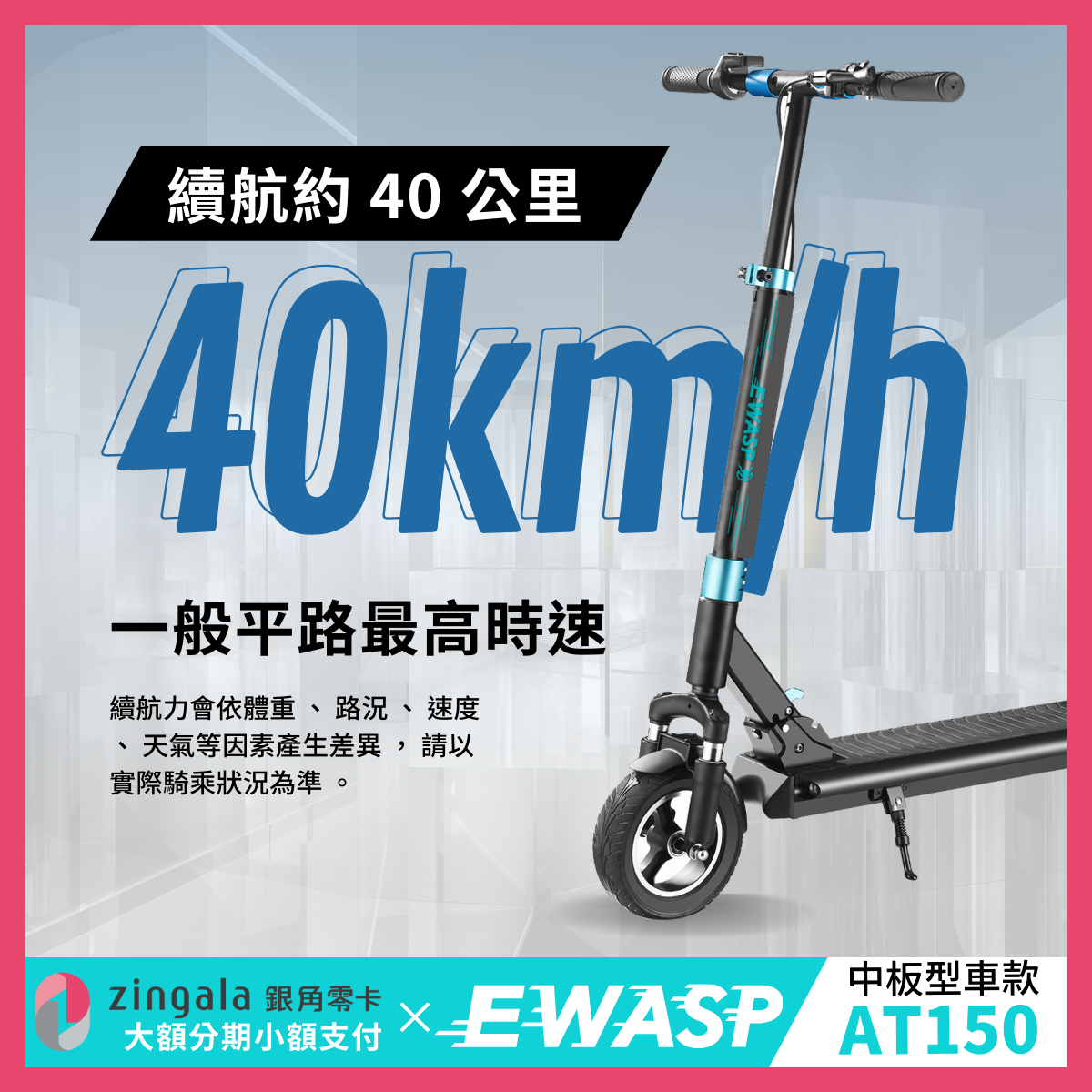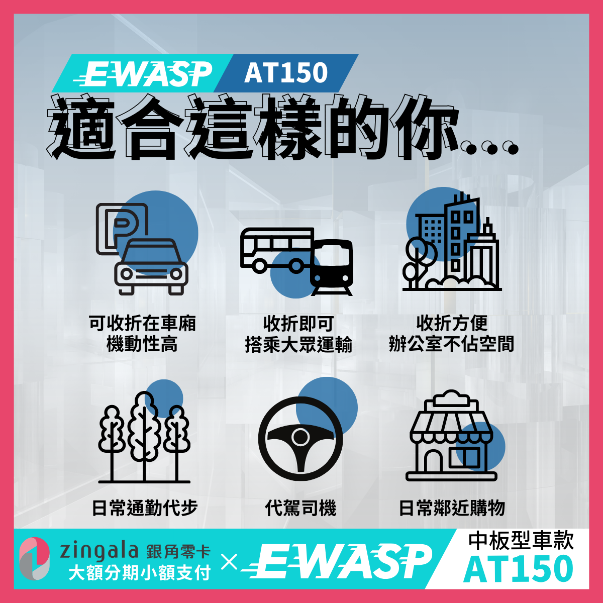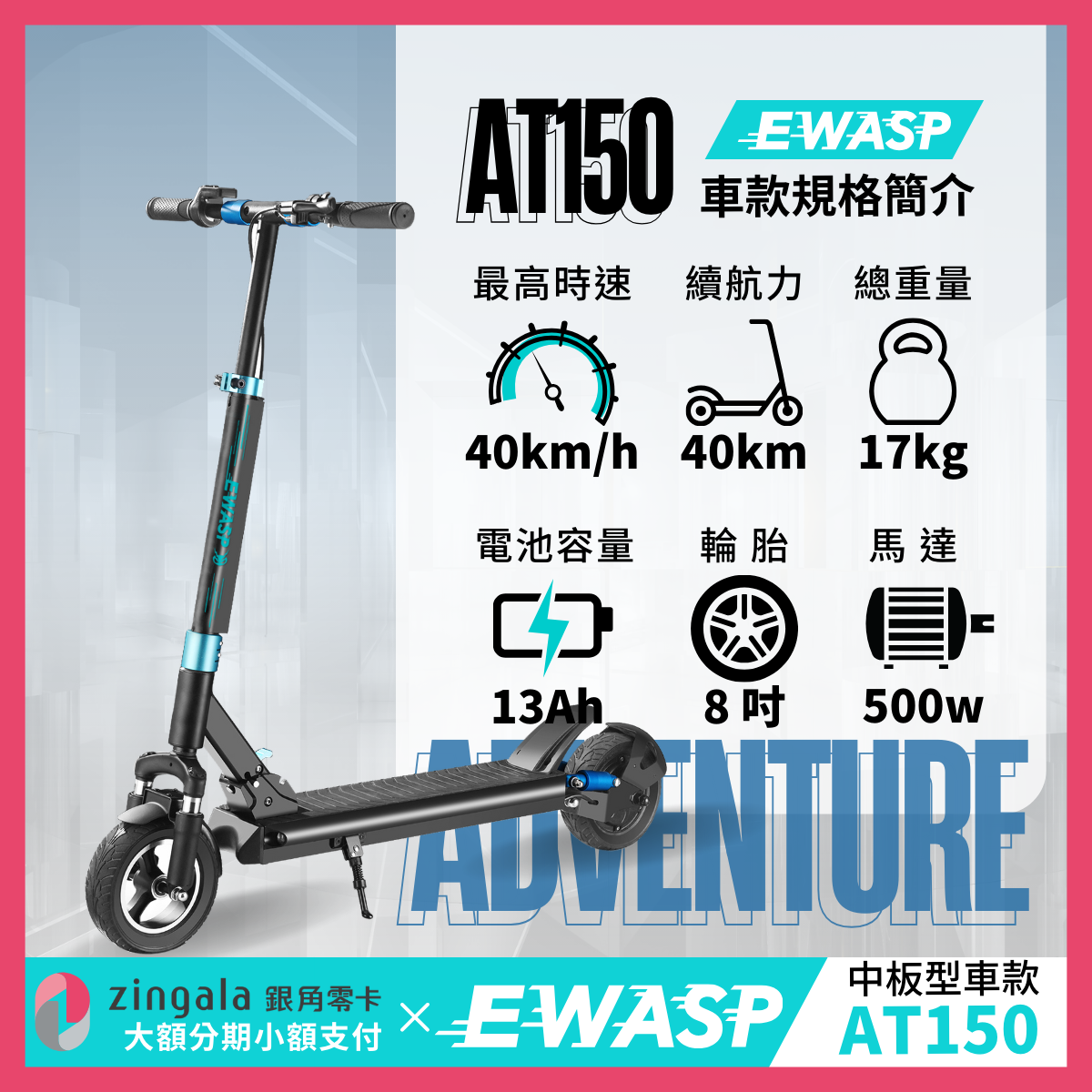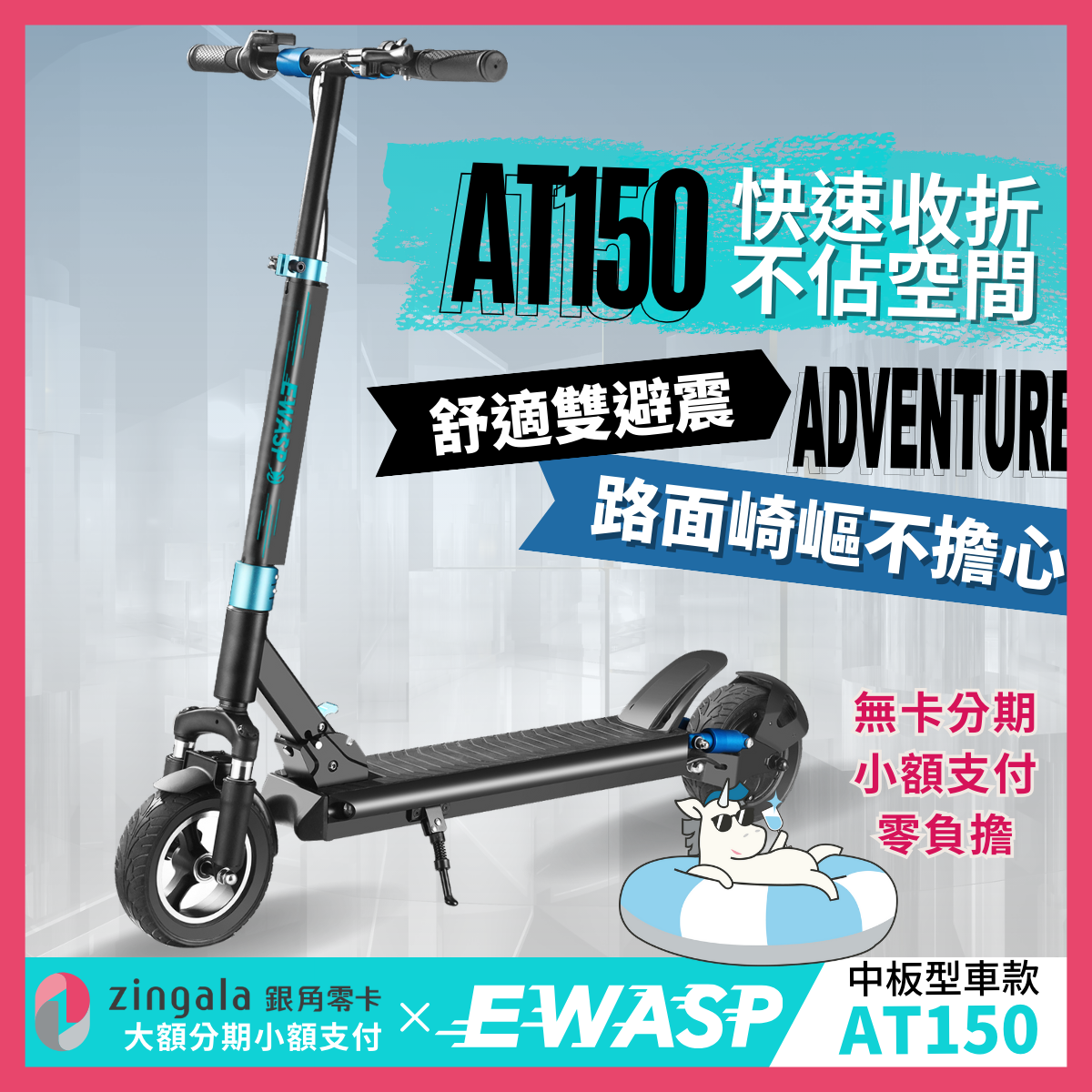EWASP電動滑板車A系列的AT150中版型車款,為中型電動滑板車,續航力約40公里,特色為平穩路感、騎乘操控優異靈活、收折後方便攜帶、適合遠程往返代步。AT150適應的族群包含上班族通勤、電動滑板車代步、男女各族群、四處玩樂享受騎乘樂趣、結合大眾運輸交通工具,鄰近採購、河堤兜風、放在汽車後車廂代步等,EWASP有專業的團隊嚴格控管所有生產環節,一手包辦設計、製造、OEM代工、零售甚至是售後保固,以快速收折、輕巧移動、戶外活動的設計理念融入生活中。