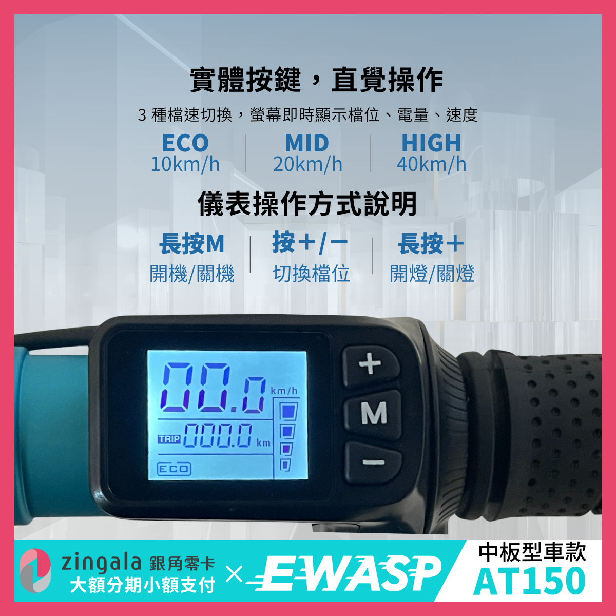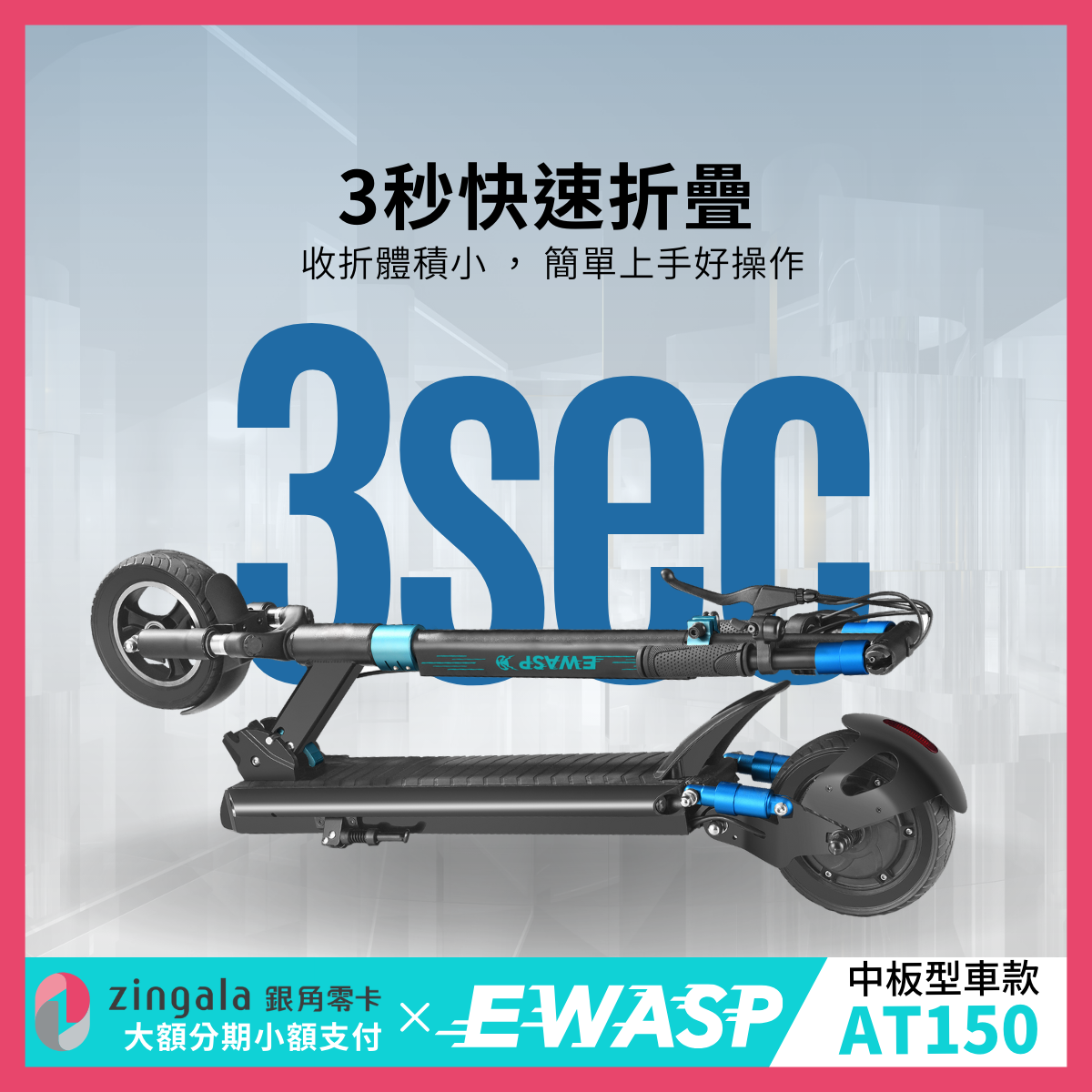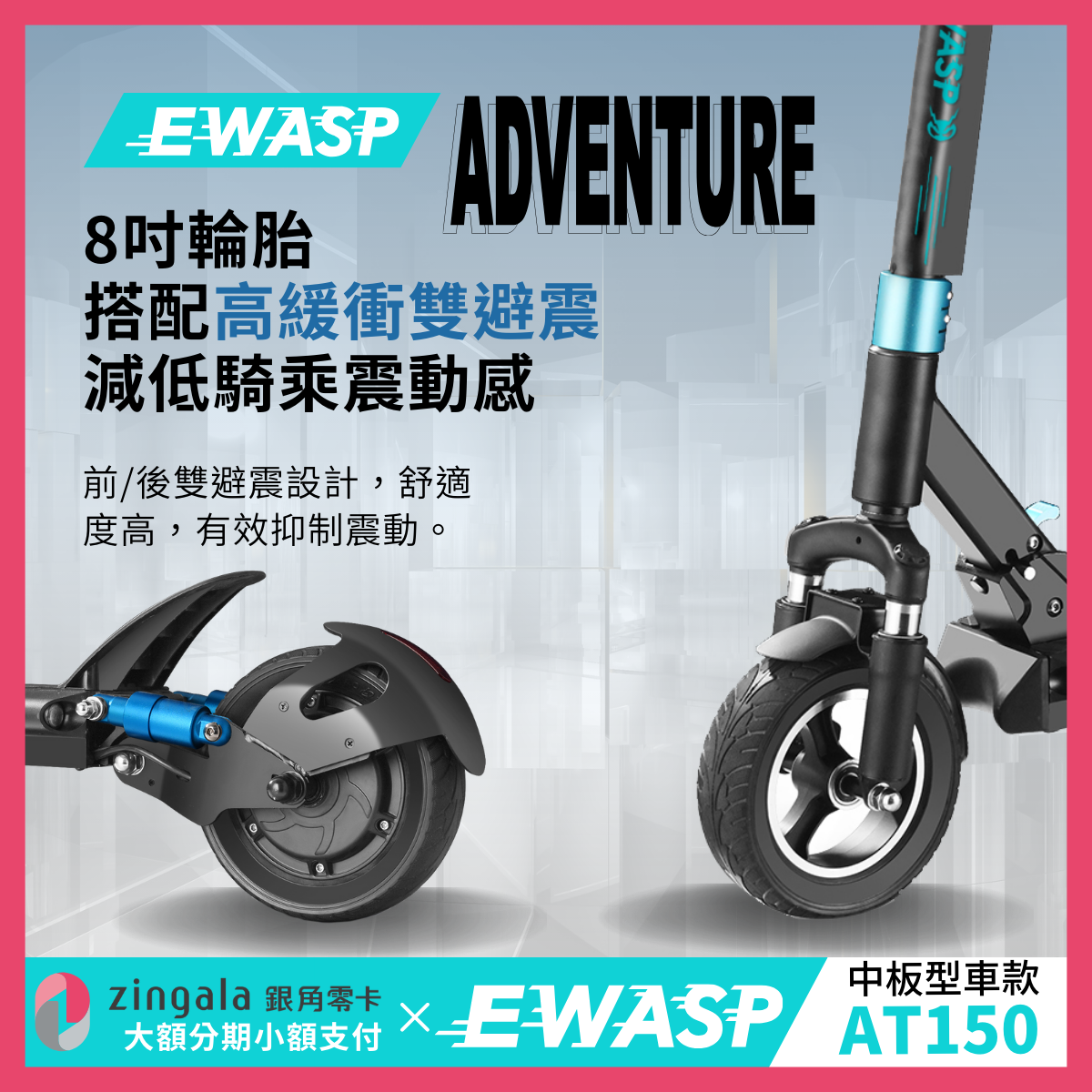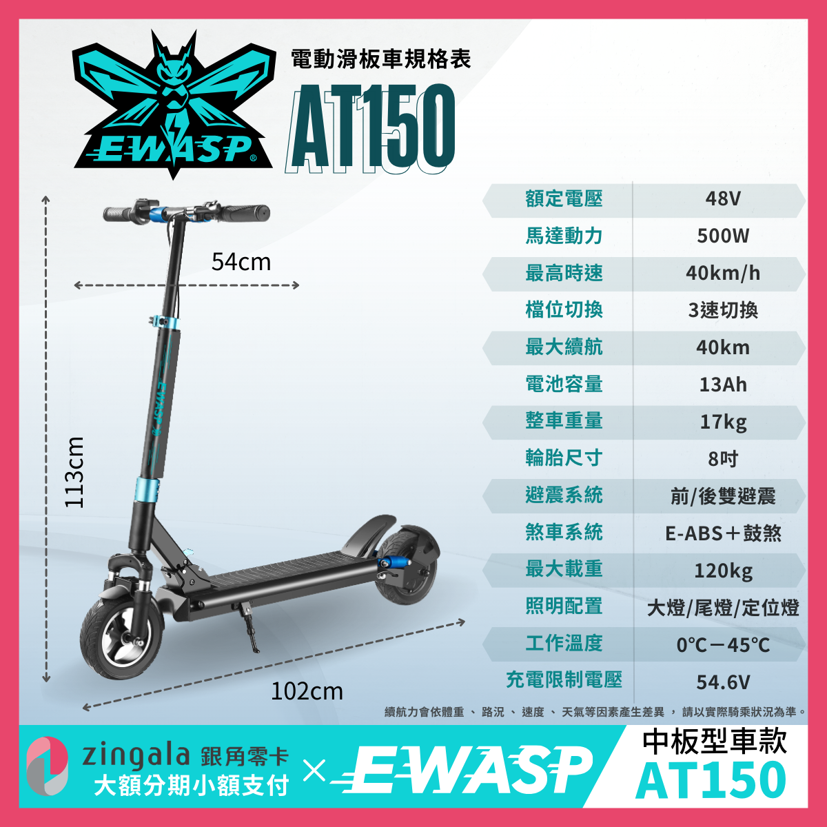 EWASP電動滑板車A系列的AT150中版型車款,為中型電動滑板車,續航力約40公里,特色為平穩路感、騎乘操控優異靈活、收折後方便攜帶、適合遠程往返代步。AT150適應的族群包含上班族通勤、電動滑板車代步、男女各族群、四處玩樂享受騎乘樂趣、結合大眾運輸交通工具,鄰近採購、河堤兜風、放在汽車後車廂代步等,EWASP有專業的團隊嚴格控管所有生產環節,一手包辦設計、製造、OEM代工、零售甚至是售後保固,以快速收折、輕巧移動、戶外活動的設計理念融入生活中。