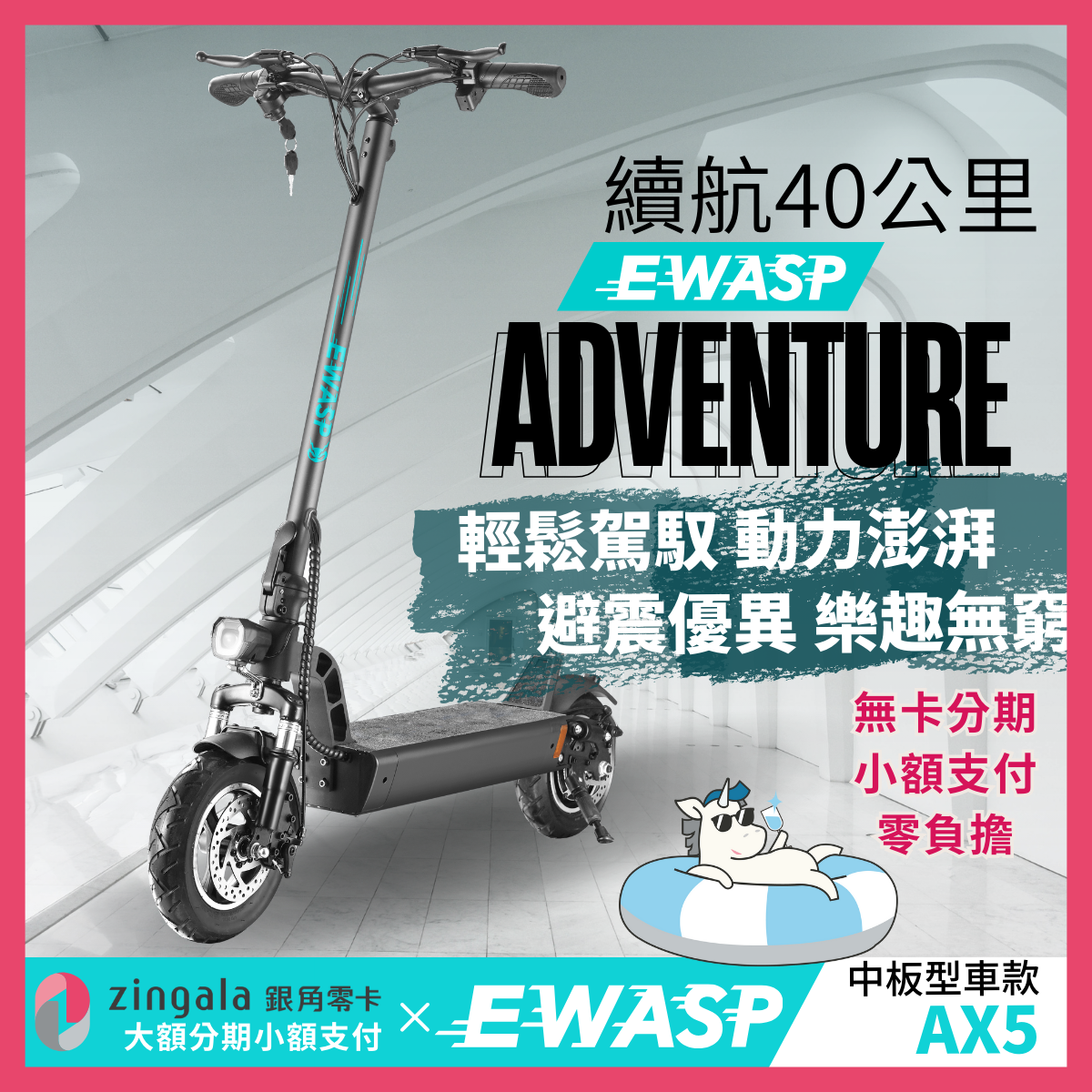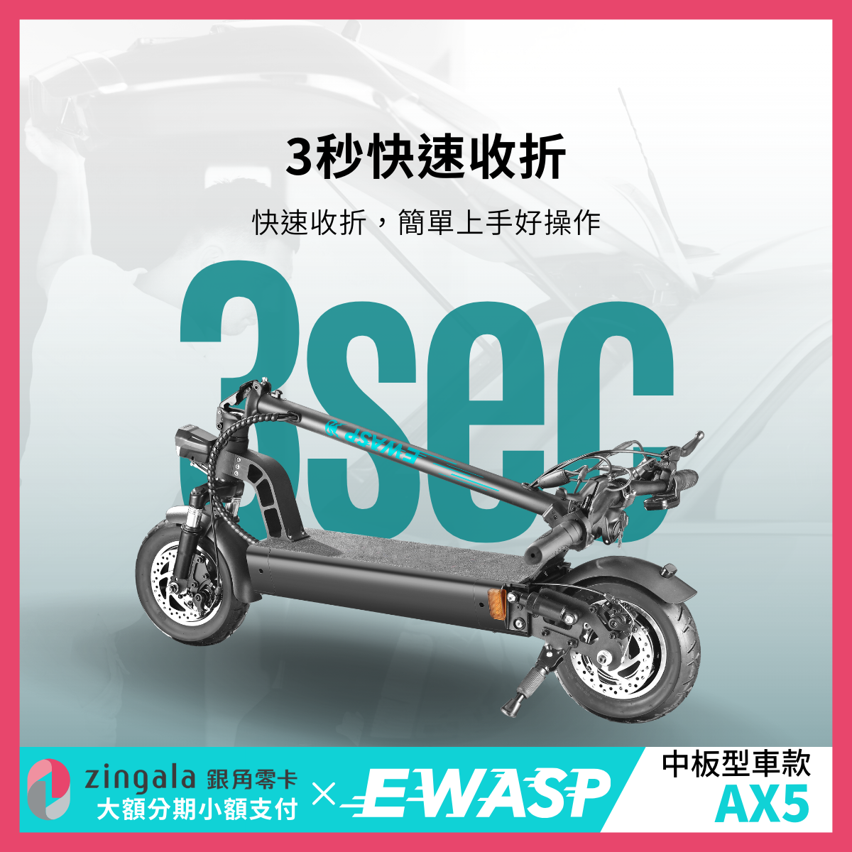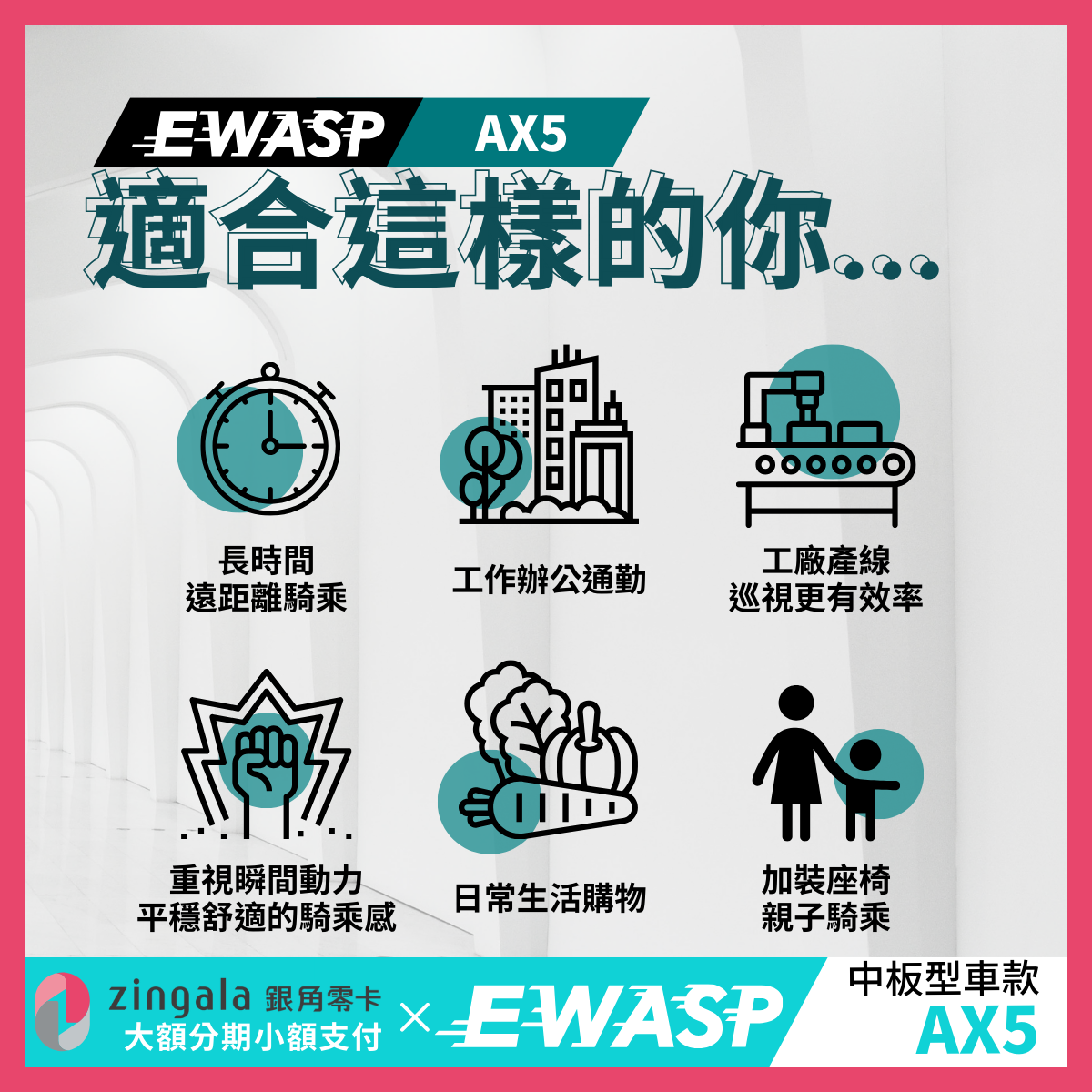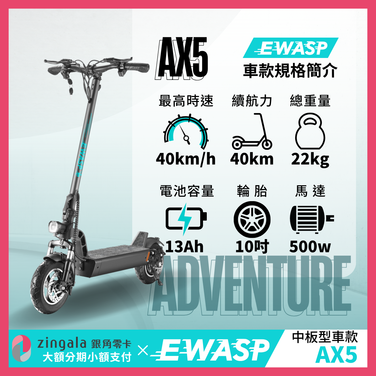 EWASP電動滑板車A系列的AX5中版型車款,為中型電動滑板車,續航力約40公里,特色為平穩路感、騎乘操控優異靈活、收折後方便攜帶、適合遠程往返代步。AX5適應的族群包含上班族通勤、電動滑板車代步、男女各族群、四處玩樂享受騎乘樂趣、結合大眾運輸交通工具,鄰近採購、河堤兜風、放在汽車後車廂代步等,EWASP有專業的團隊嚴格控管所有生產環節,一手包辦設計、製造、OEM代工、零售甚至是售後保固,以快速收折、輕巧移動、戶外活動的設計理念融入生活中。