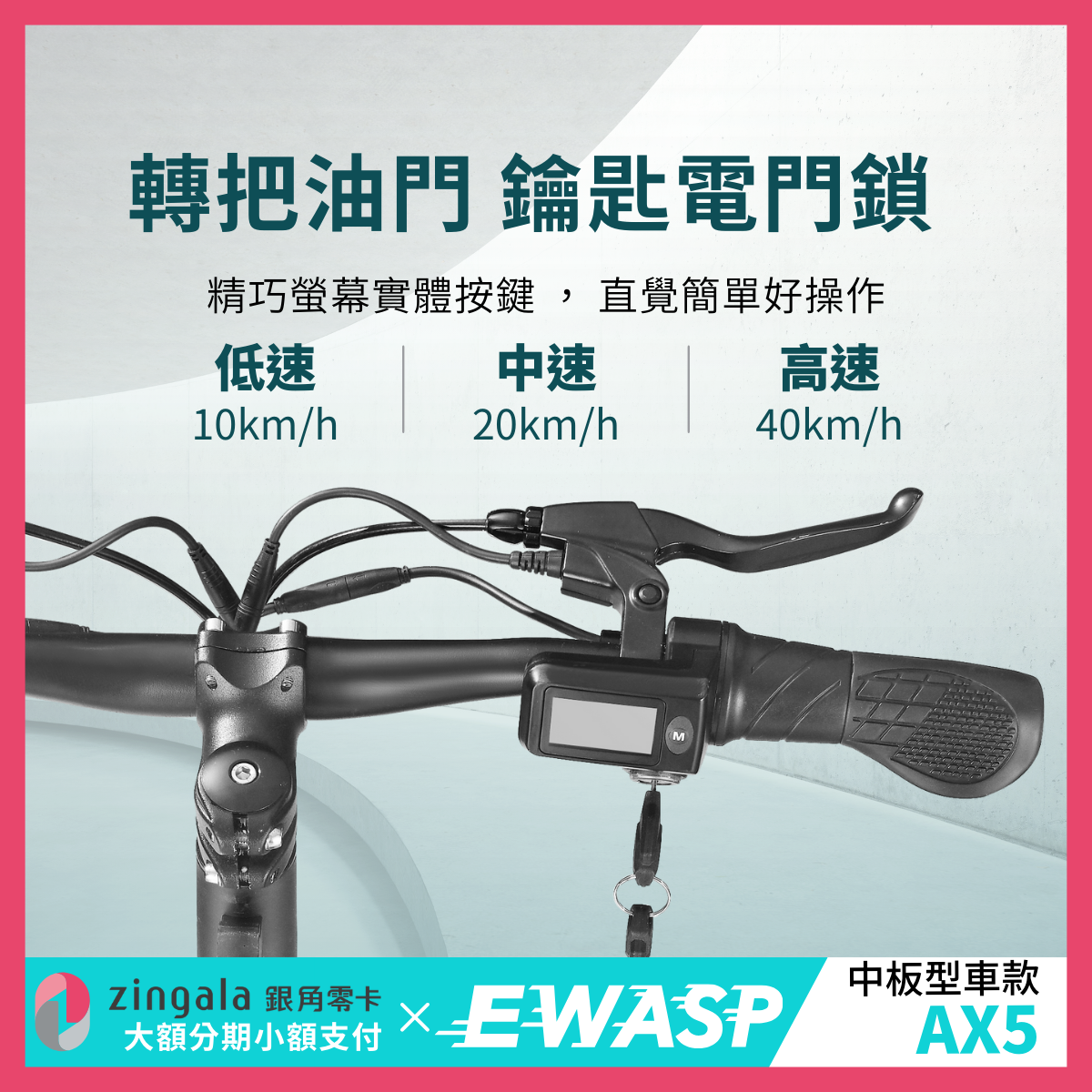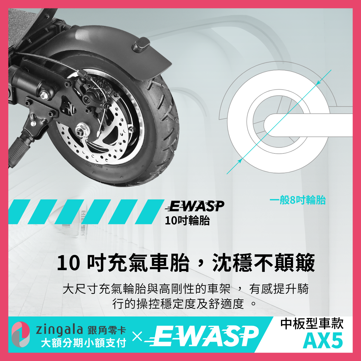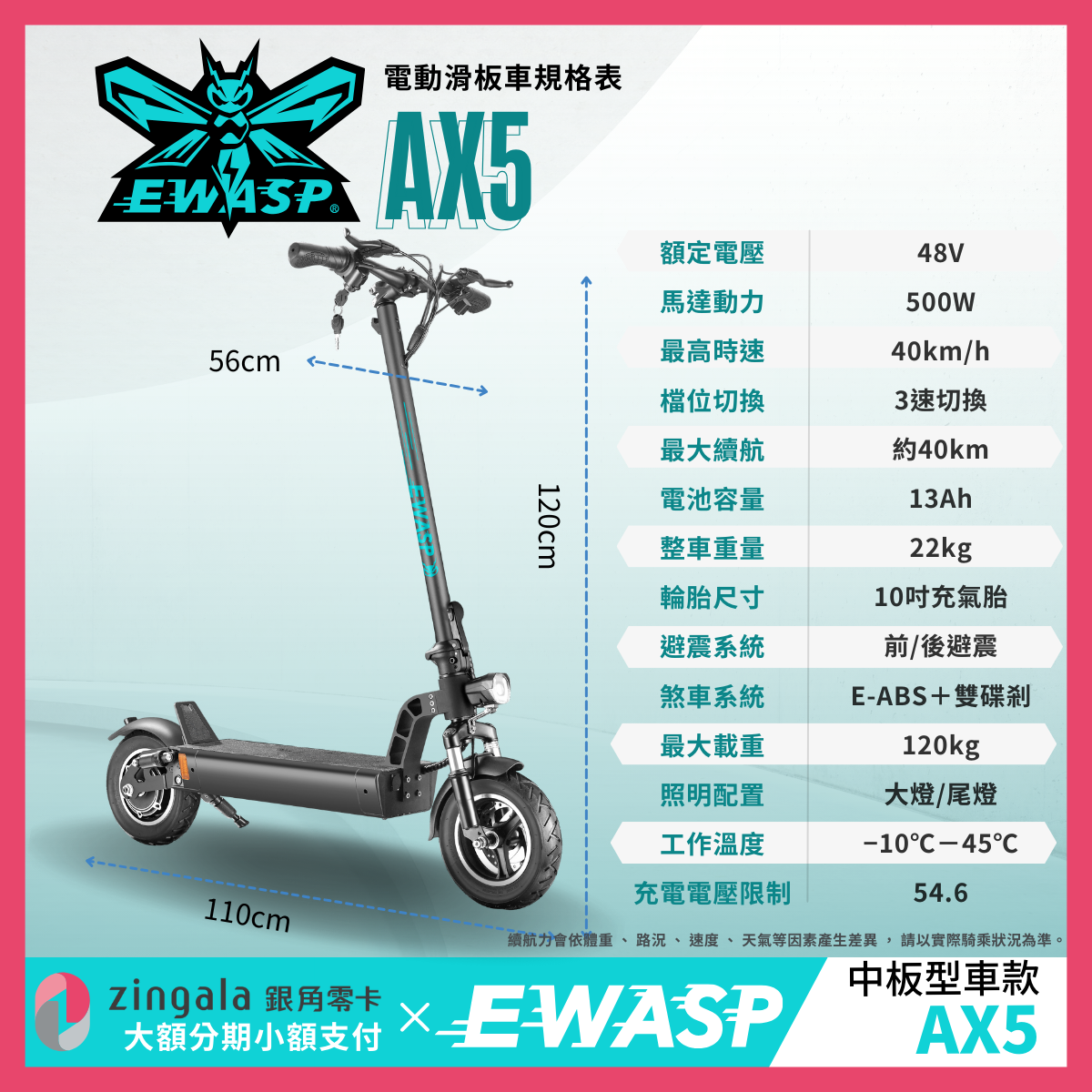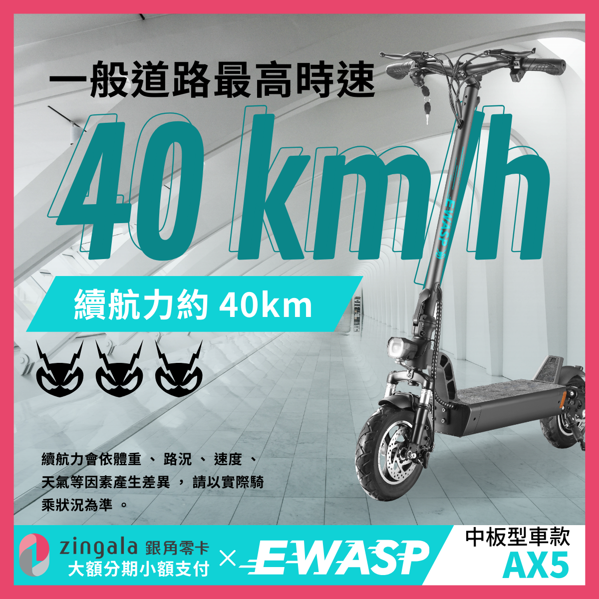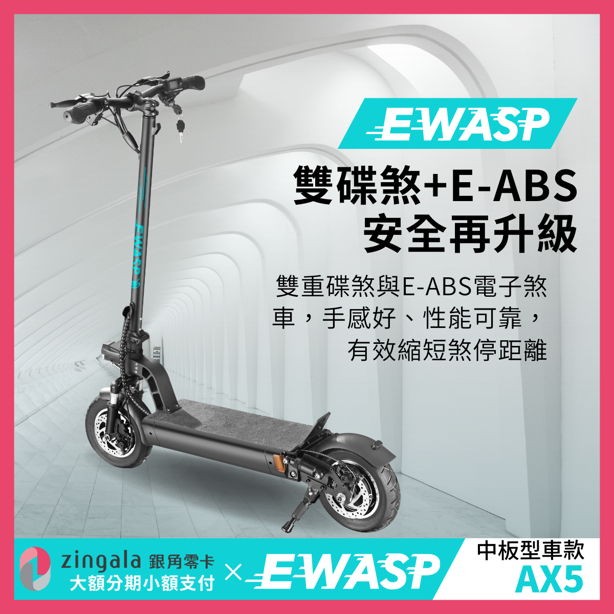 EWASP電動滑板車A系列的AX5中版型車款,為中型電動滑板車,續航力約40公里,特色為平穩路感、騎乘操控優異靈活、收折後方便攜帶、適合遠程往返代步。AX5適應的族群包含上班族通勤、電動滑板車代步、男女各族群、四處玩樂享受騎乘樂趣、結合大眾運輸交通工具,鄰近採購、河堤兜風、放在汽車後車廂代步等,EWASP有專業的團隊嚴格控管所有生產環節,一手包辦設計、製造、OEM代工、零售甚至是售後保固,以快速收折、輕巧移動、戶外活動的設計理念融入生活中。