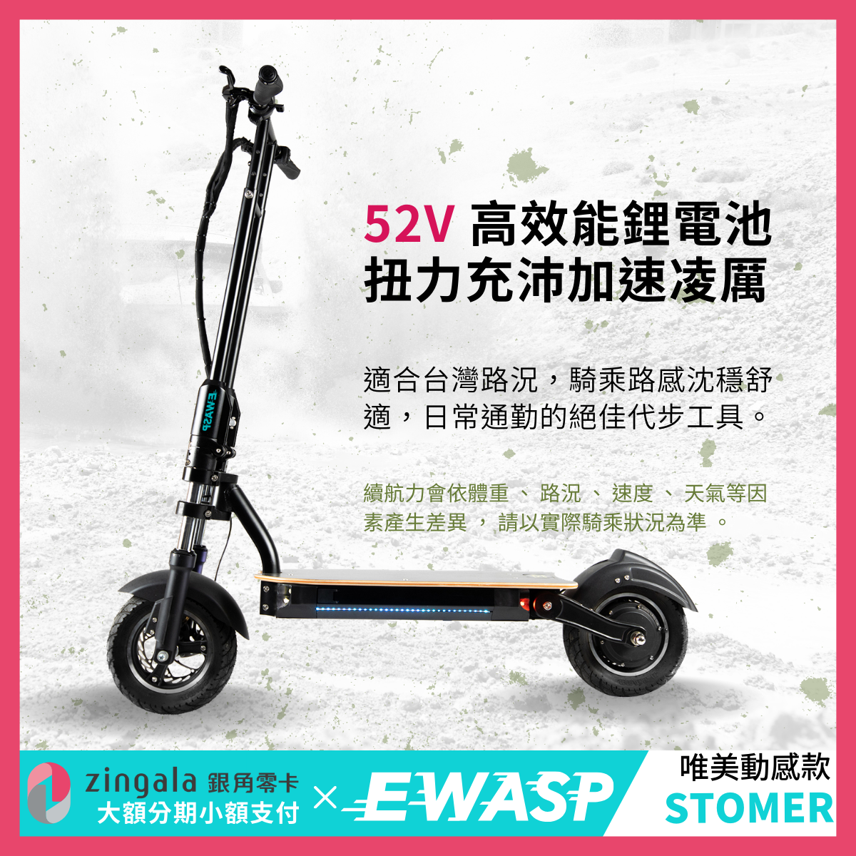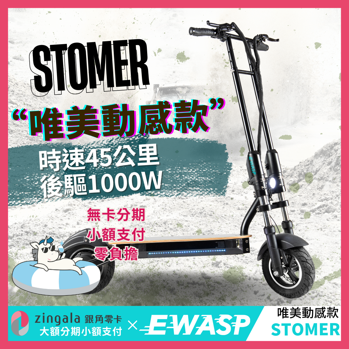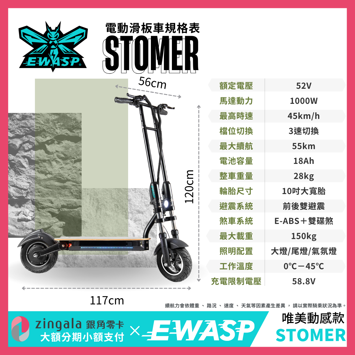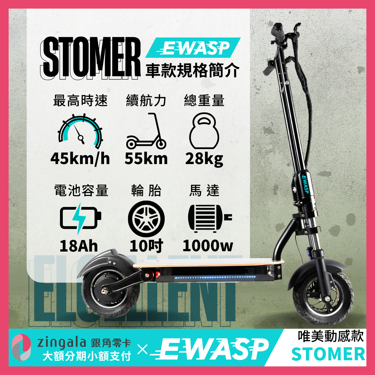 EWASP電動滑板車E系列的STOMER唯美動感款,為大型電動滑板車,續航力約55公里,特色為穩定度高、騎乘操控樂趣、快速收折後攜帶、適合遠程往返代步。STOMER適應的族群包含喜愛速度感通勤者、電動滑板車代步、享受騎乘樂趣、露營地代步、河堤兜風、結合大眾運輸交通工具。EWASP有專業的團隊嚴格控管所有生產環節,一手包辦設計、製造、OEM代工、零售甚至是售後保固,以快速收折、輕巧移動、戶外活動的設計理念融入生活中。