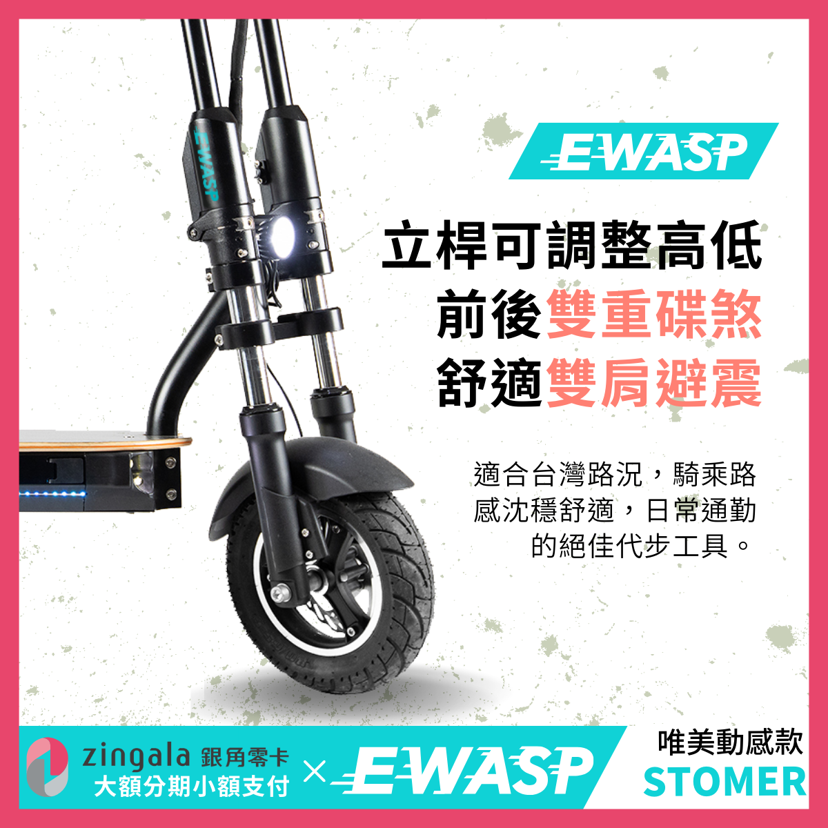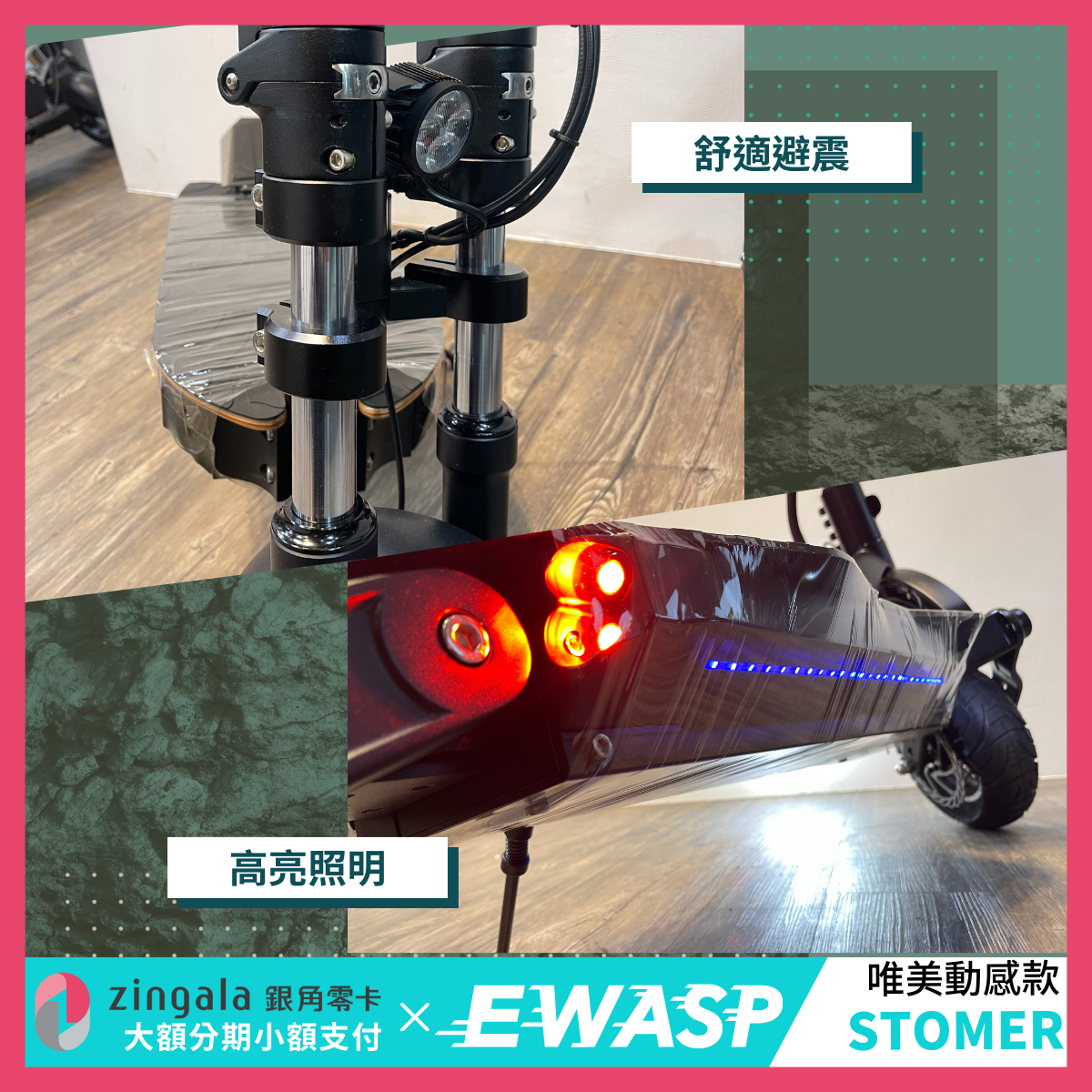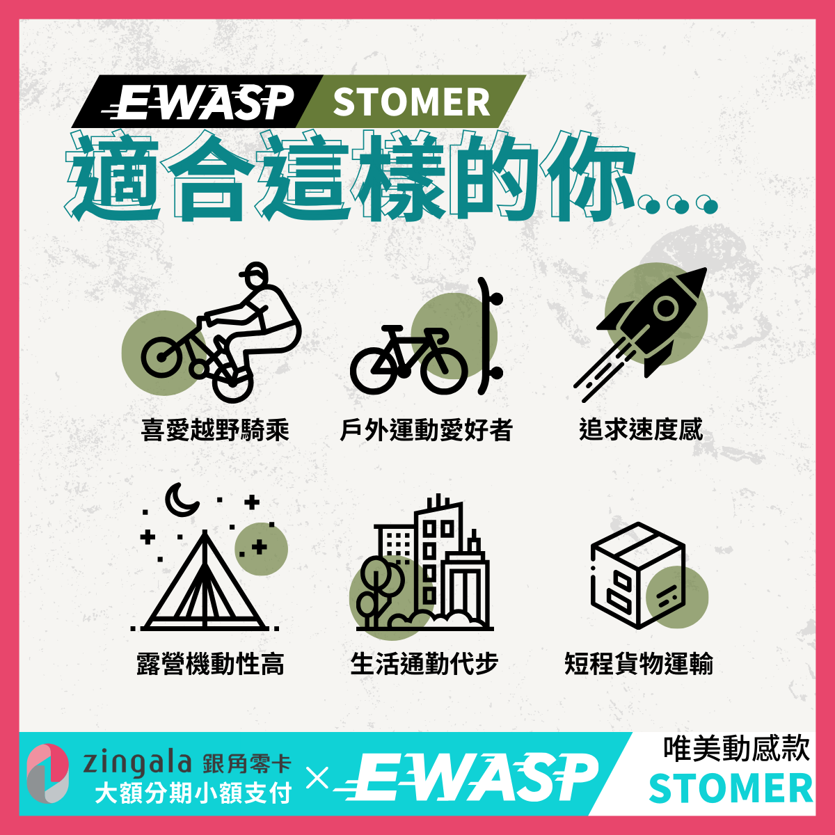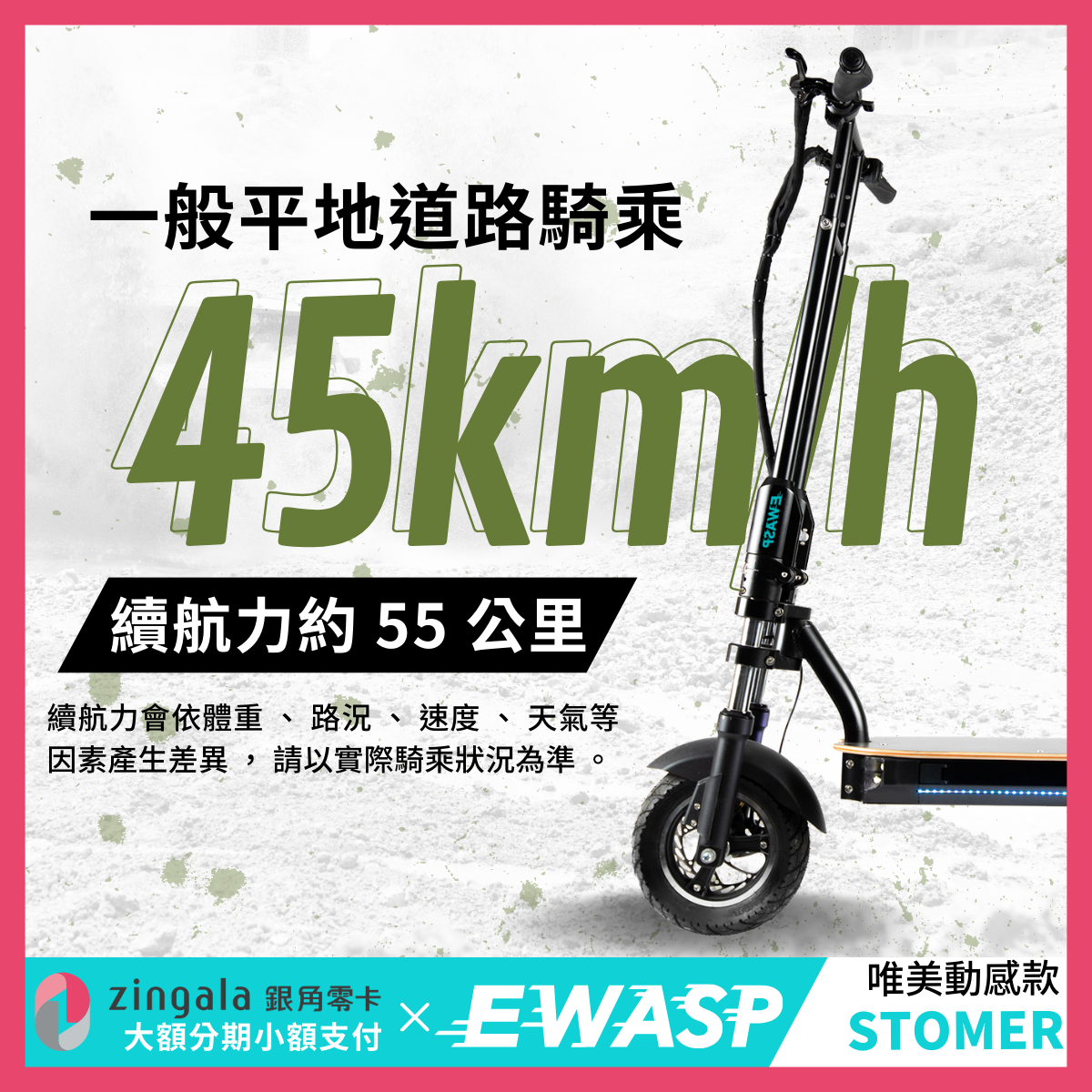 EWASP電動滑板車E系列的STOMER唯美動感款,為大型電動滑板車,續航力約55公里,特色為穩定度高、騎乘操控樂趣、快速收折後攜帶、適合遠程往返代步。STOMER適應的族群包含喜愛速度感通勤者、電動滑板車代步、享受騎乘樂趣、露營地代步、河堤兜風、結合大眾運輸交通工具。EWASP有專業的團隊嚴格控管所有生產環節,一手包辦設計、製造、OEM代工、零售甚至是售後保固,以快速收折、輕巧移動、戶外活動的設計理念融入生活中。