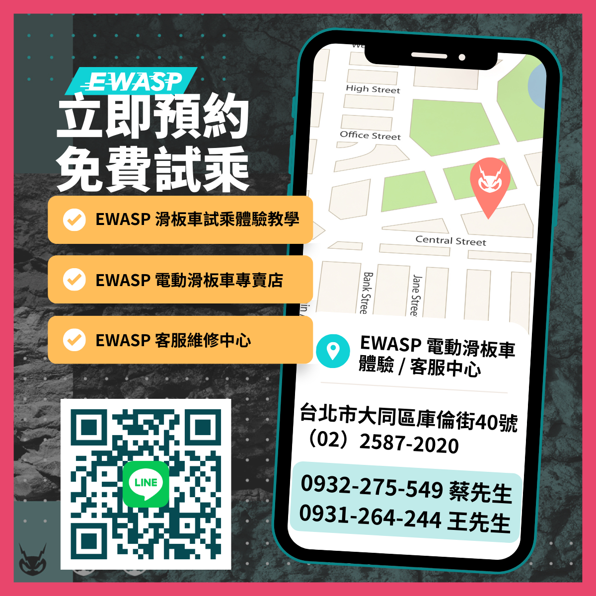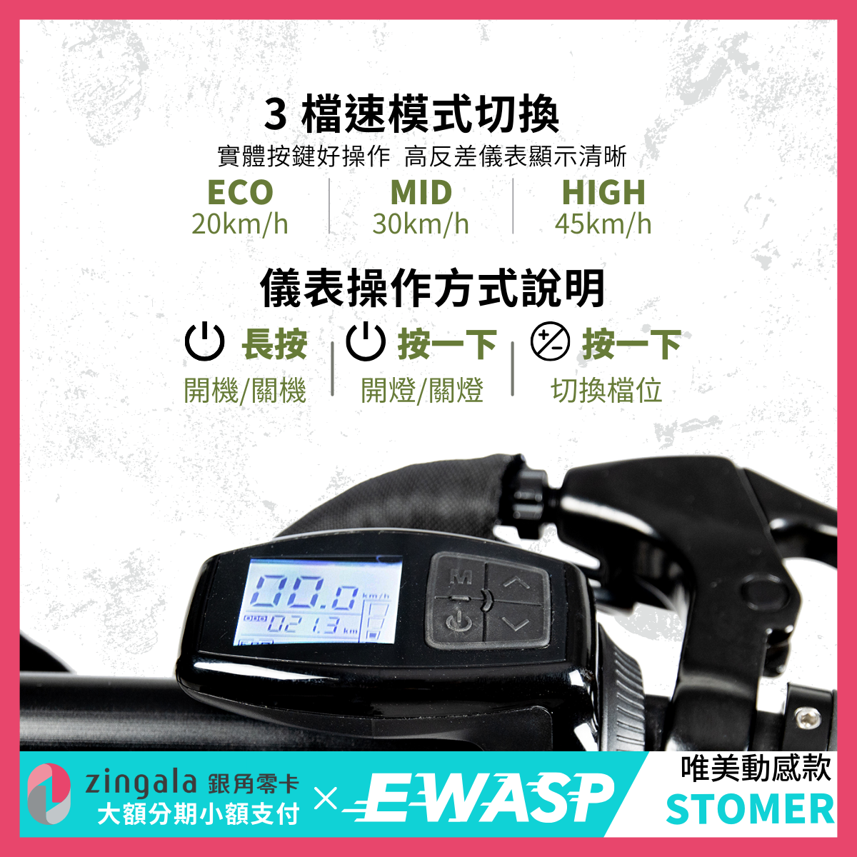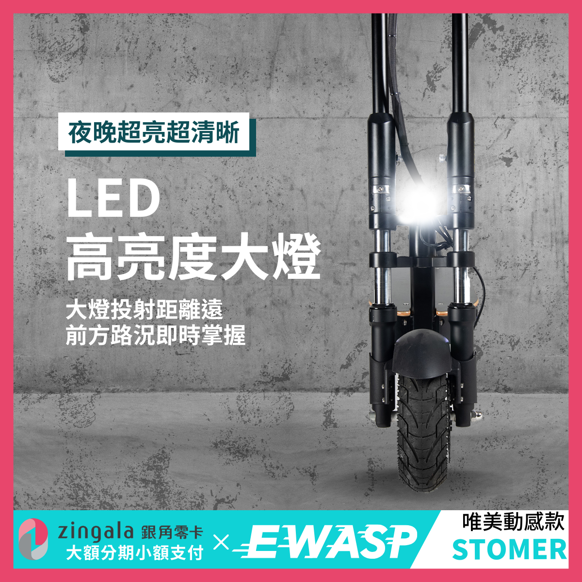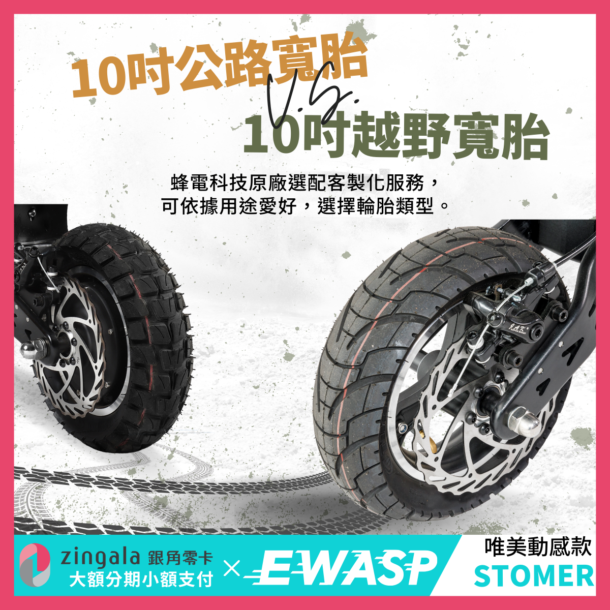 EWASP電動滑板車E系列的STOMER唯美動感款,為大型電動滑板車,續航力約55公里,特色為穩定度高、騎乘操控樂趣、快速收折後攜帶、適合遠程往返代步。STOMER適應的族群包含喜愛速度感通勤者、電動滑板車代步、享受騎乘樂趣、露營地代步、河堤兜風、結合大眾運輸交通工具。EWASP有專業的團隊嚴格控管所有生產環節,一手包辦設計、製造、OEM代工、零售甚至是售後保固,以快速收折、輕巧移動、戶外活動的設計理念融入生活中。