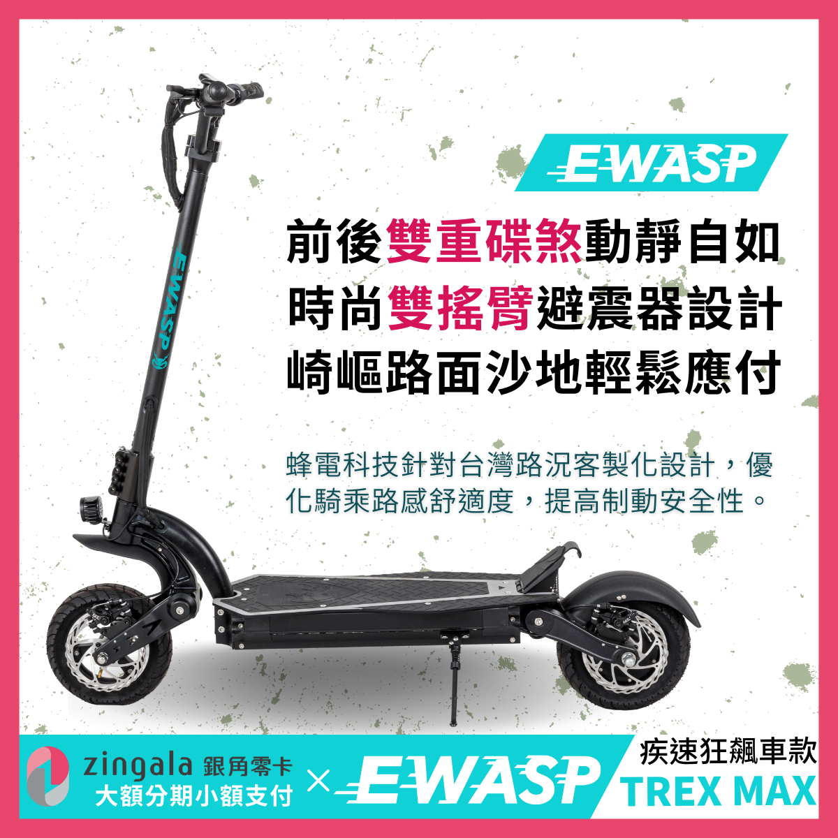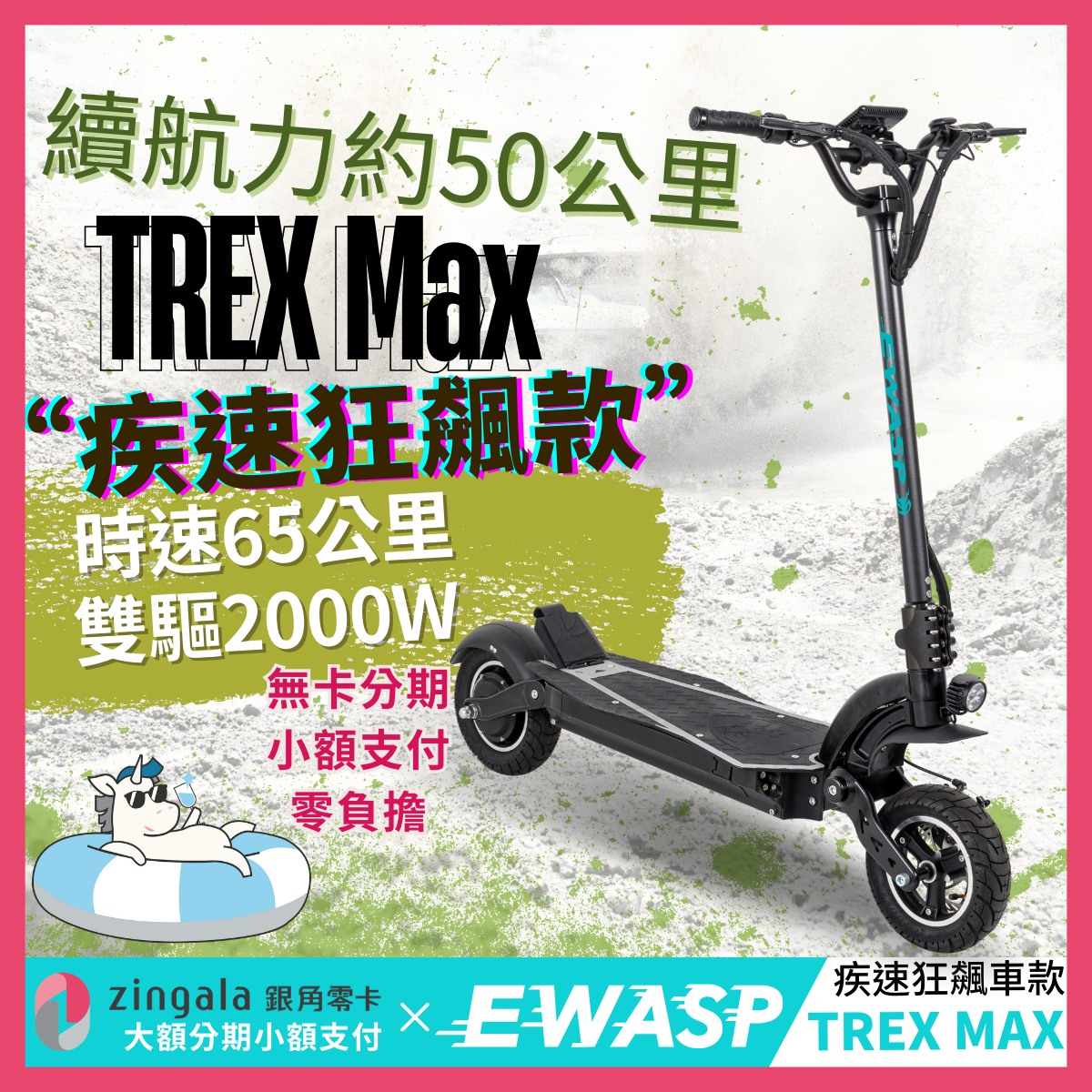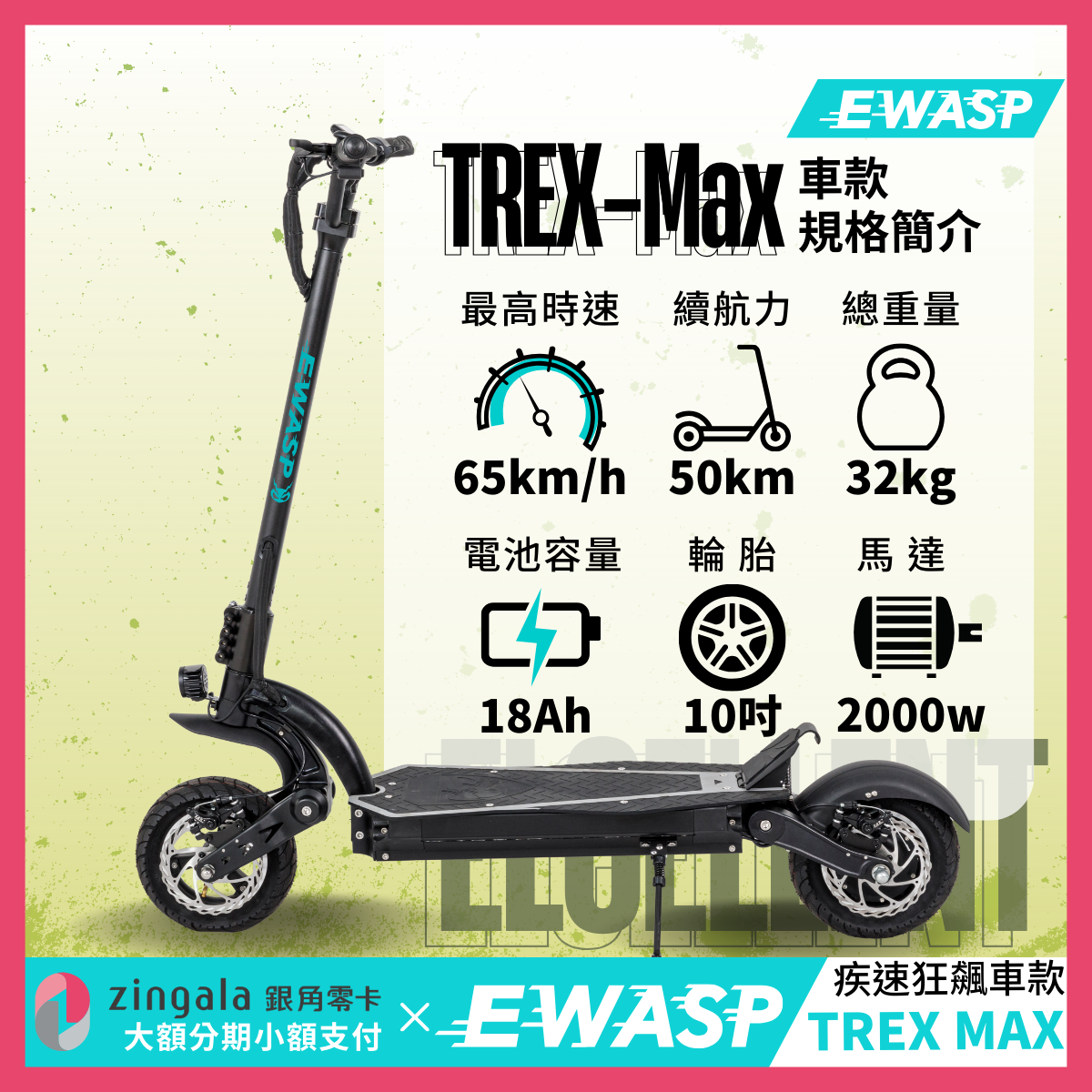 EWASP電動滑板車E系列的TREX Max疾速狂飆款,為大型電動滑板車,續航力約50公里,特色為穩定度高、騎乘操控樂趣、快速收折後攜帶、適合遠程往返代步。TREX Max適應的族群包含喜愛速度感玩樂者、電動滑板車代步、享受騎乘樂趣、露營區代步、河堤兜風、結合大眾運輸交通工具。EWASP有專業的團隊嚴格控管所有生產環節,一手包辦設計、製造、OEM代工、零售甚至是售後保固,以快速收折、輕巧移動、戶外活動的設計理念融入生活中。