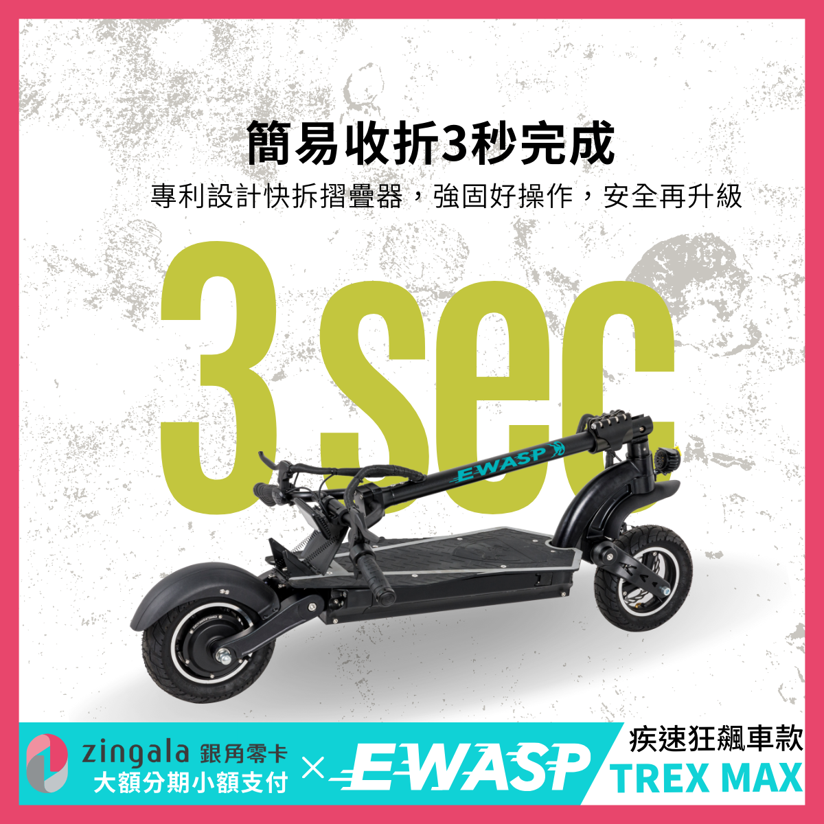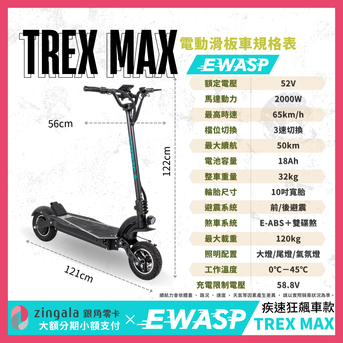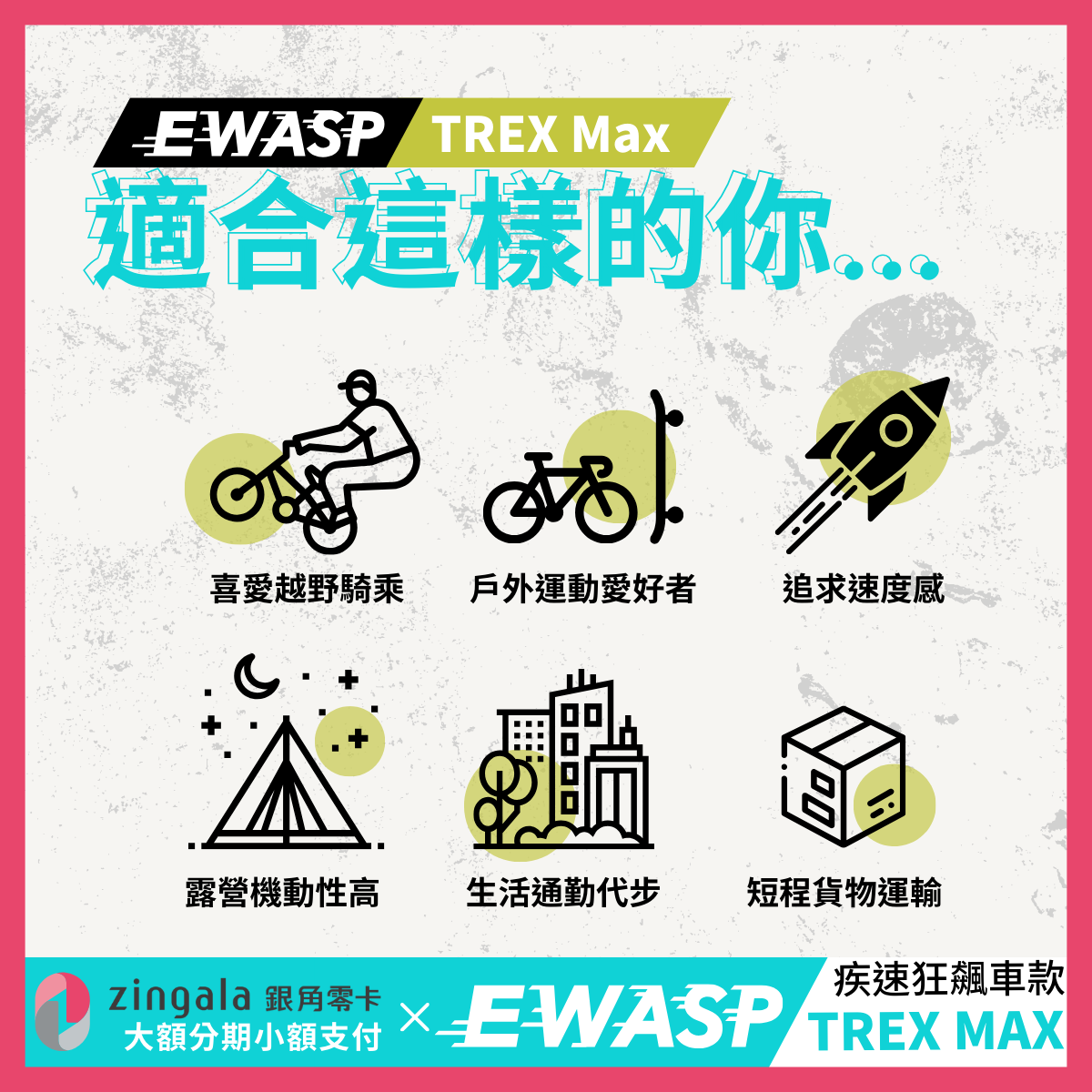 EWASP電動滑板車E系列的TREX Max疾速狂飆款,為大型電動滑板車,續航力約50公里,特色為穩定度高、騎乘操控樂趣、快速收折後攜帶、適合遠程往返代步。TREX Max適應的族群包含喜愛速度感玩樂者、電動滑板車代步、享受騎乘樂趣、露營區代步、河堤兜風、結合大眾運輸交通工具。EWASP有專業的團隊嚴格控管所有生產環節,一手包辦設計、製造、OEM代工、零售甚至是售後保固,以快速收折、輕巧移動、戶外活動的設計理念融入生活中。