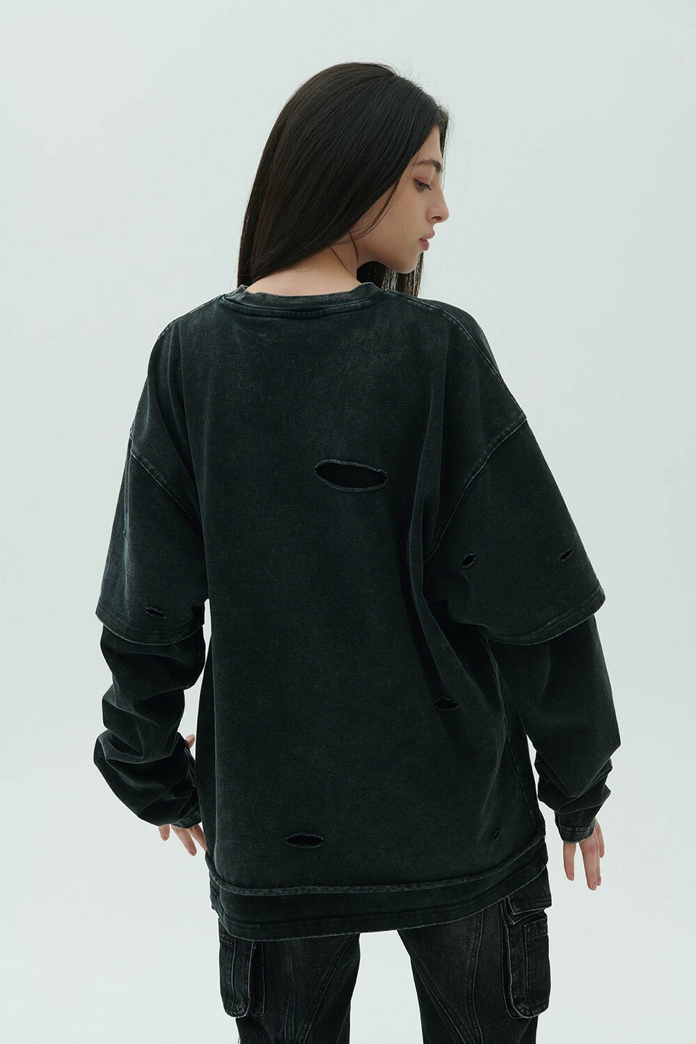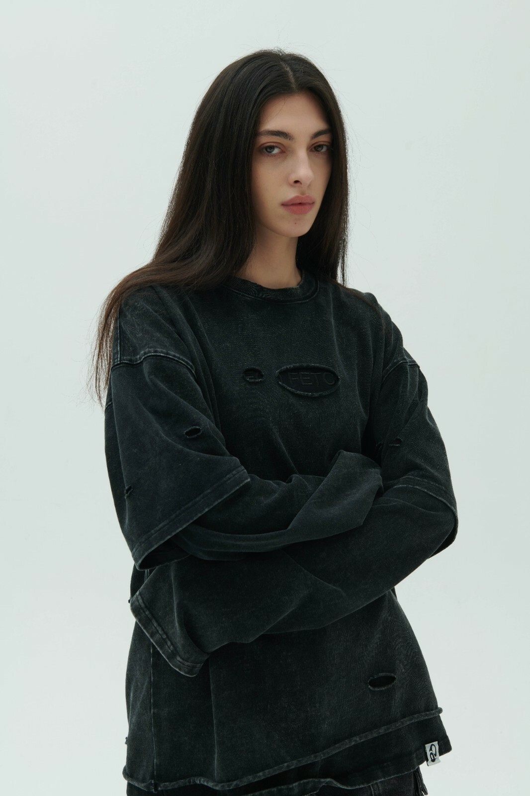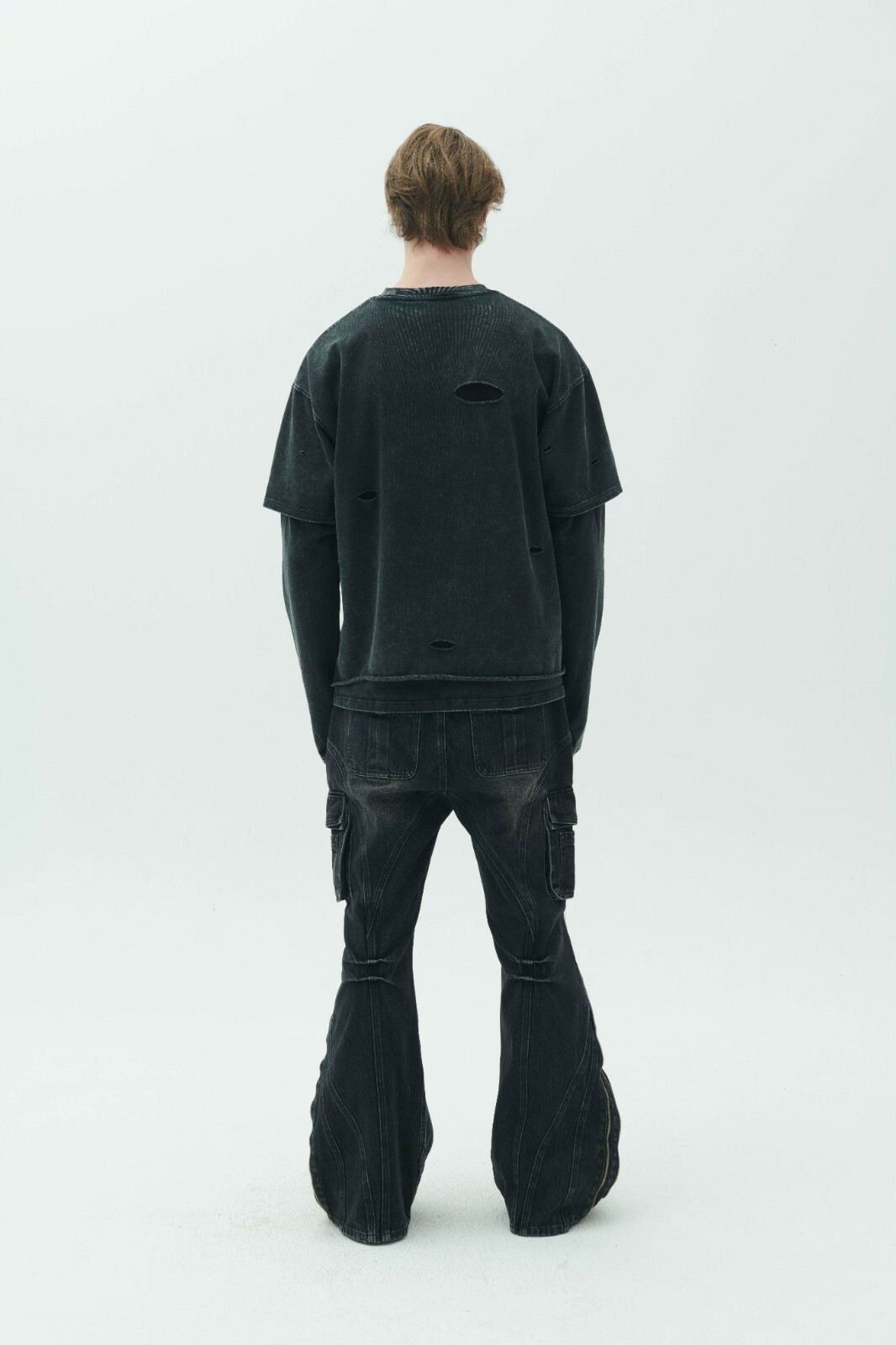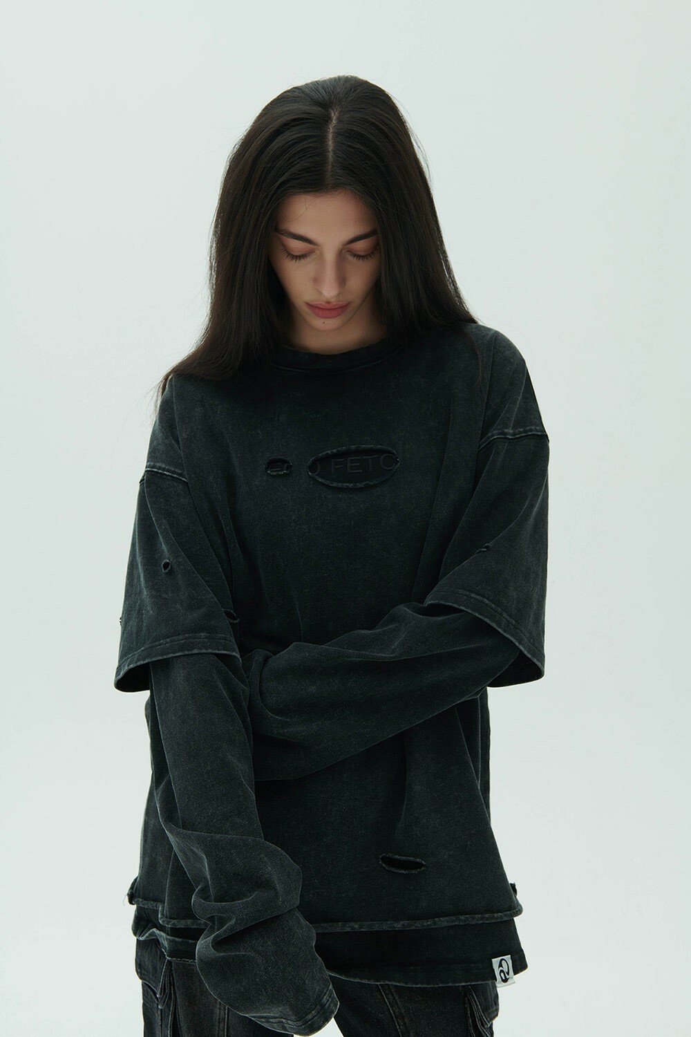 EGO FETCH Destroyed Two-Piece Long Sleeve T-Shirt 黑色 假兩件式破洞長T EGO24SSTTE068