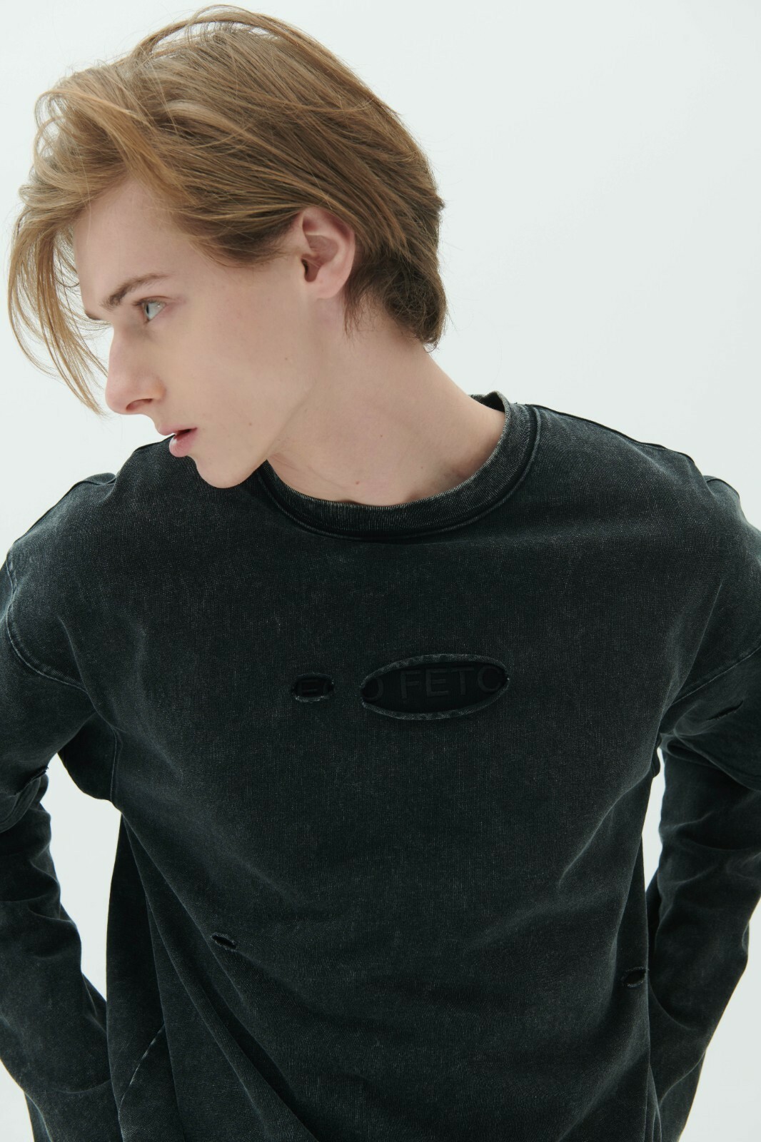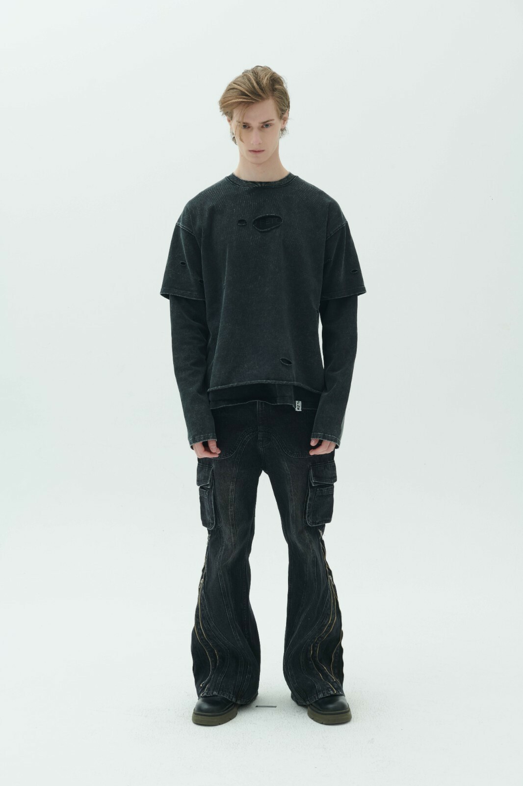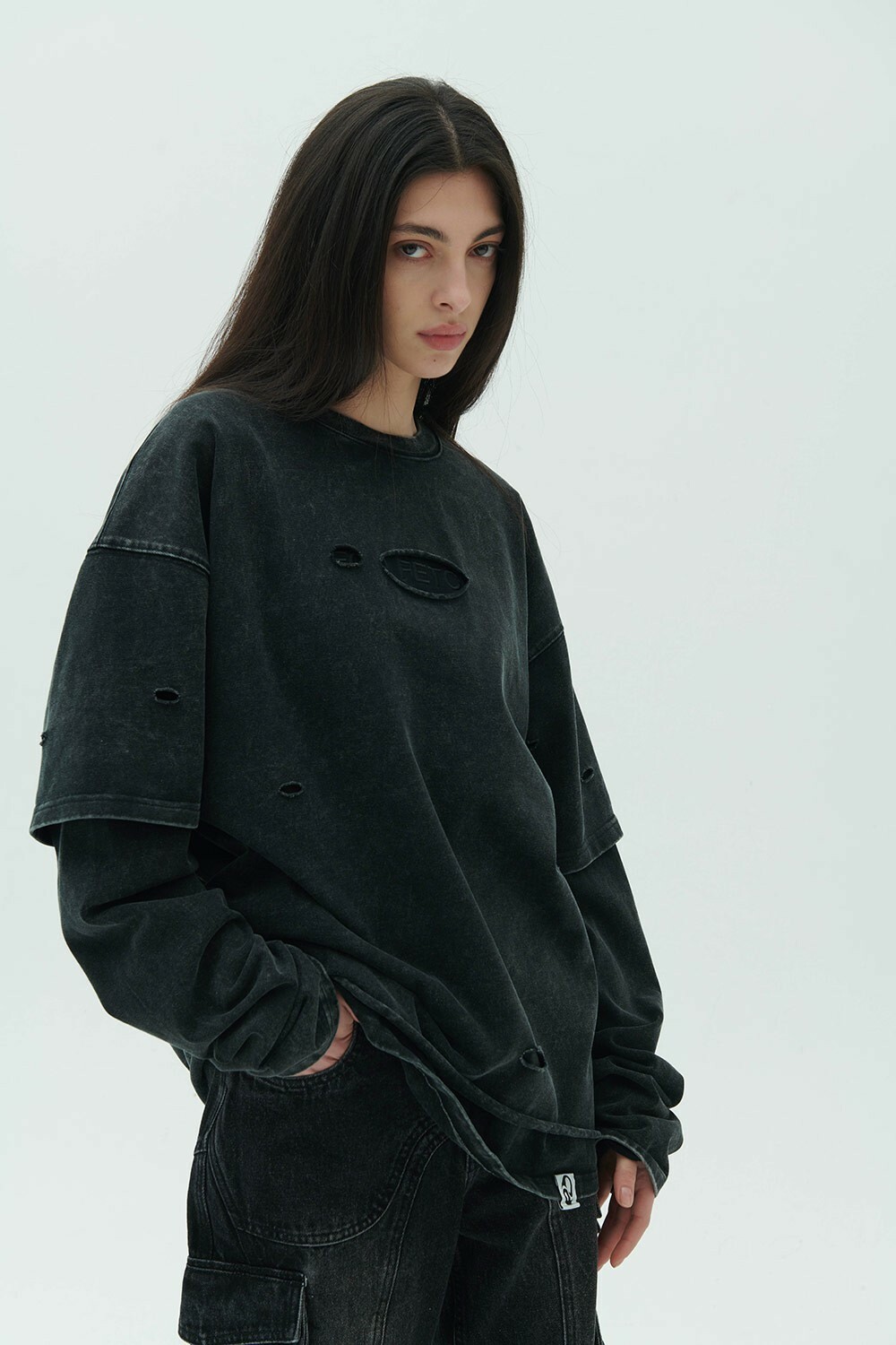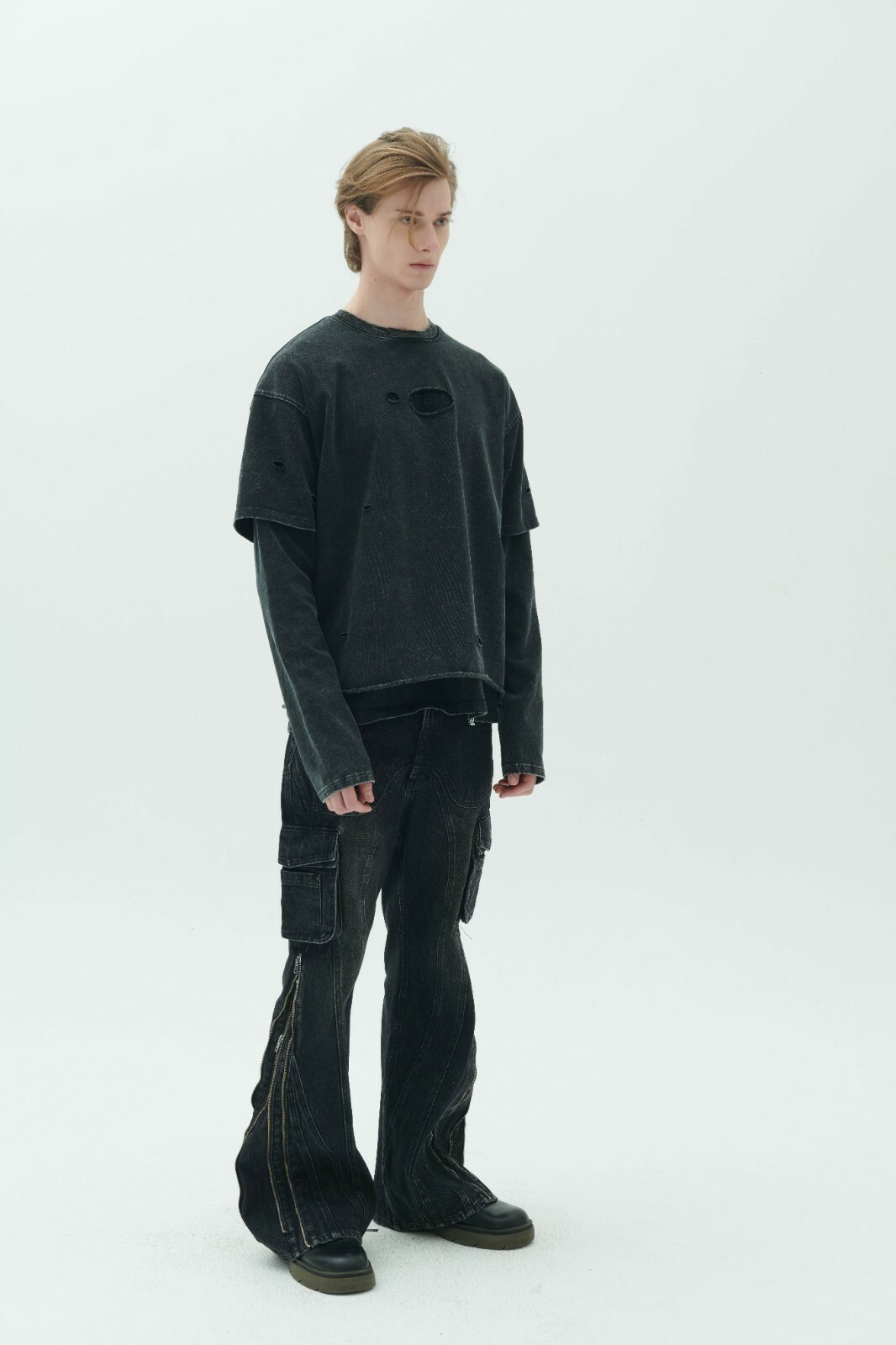EGO FETCH Destroyed Two-Piece Long Sleeve T-Shirt 黑色 假兩件式破洞長T EGO24SSTTE068