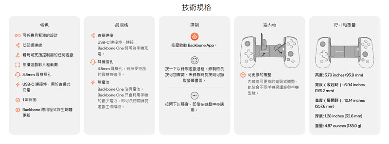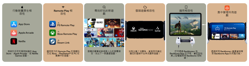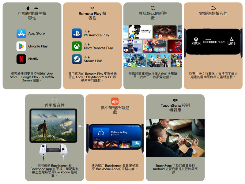 Backbone One 控制器 (USB-C) 與主流 USB-C 行動裝置相容,如 Apple、Samsung、Google、小米、Oppo、Vivo、華為、realme、Motorola,包括全新的 iPhone 16 系列。