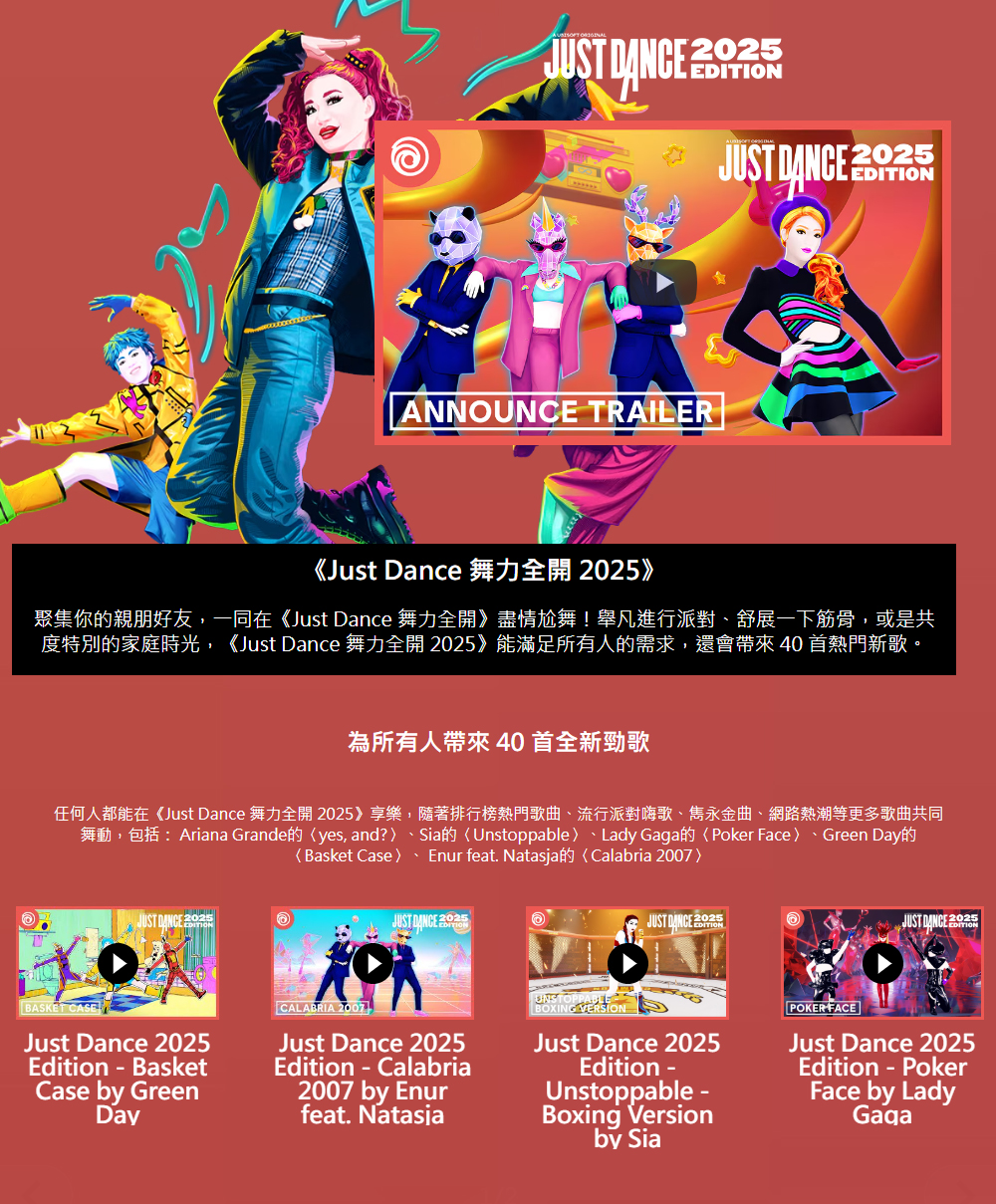 《Just Dance 舞力全開 2025》帶來幽默有趣的舞蹈動作,會根據玩家選擇的教練變換難度。收錄排行榜金曲乃至當今熱門勁歌,讓每位玩家都能找到適合自己的編舞。炒熱家庭聚會的氣氛,挑戰全家大小的舞技,甚至看見父母稱霸舞池。無論是獨自練習跳舞,還是邊娛樂邊鍛鍊身體,可追蹤卡路里消耗數以及跳舞時數的健身模式都能滿足需求。