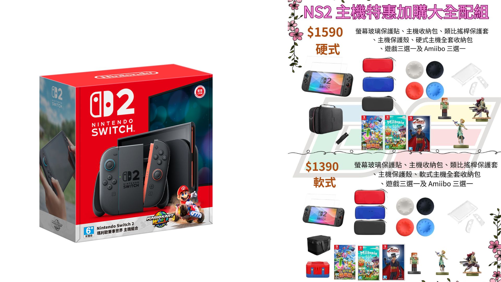 凡購買 NS2 瑪利歐賽車世界 主機 只要加購 $1390 即可獲得 螢幕玻璃保護貼乙片、主機收納包乙個、類比搖桿保護套乙組、主機保護殼乙組、硬式主機全套收納包乙套以及特選遊戲三選一和特選 Amiibo 三選一唷~