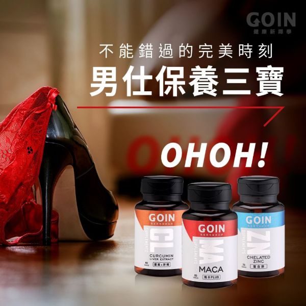 【GOIN 瑪卡PLUS】 。頂級專利MacaPro® 600%高濃度萃取頂級黑紅瑪卡 。超足量添加800mg 六倍還原可達4800mg 。黑紅馬卡 X 頂級鹿茸 X 螯合鋅 男性機能全面補足 【GOIN 薑黃+肝精】 。美國名廠C3 Complex®專利薑黃素,95%高濃度300mg薑黃素 。精胺酸 促進一氧化氮(NO)的生成,幫助新陳代謝,調整生理機能,增強體力,提升保護力。 。BIOPERINE®專利胡椒鹼,提高薑黃2000%保健效率 。專利FBL-1牛肝精粉,均衡充足營養補給食品 【GOIN 螯合鋅】 。美國專利甘胺酸鋅(螯合鋅)人體吸收率高達95% 。鋅是人體必需的微量元素 。有助於維持生長發育與生殖機能 。增進皮膚健康 。有助於維持能量正常代謝 。食品業者登錄字號 B-190289539-00000-4