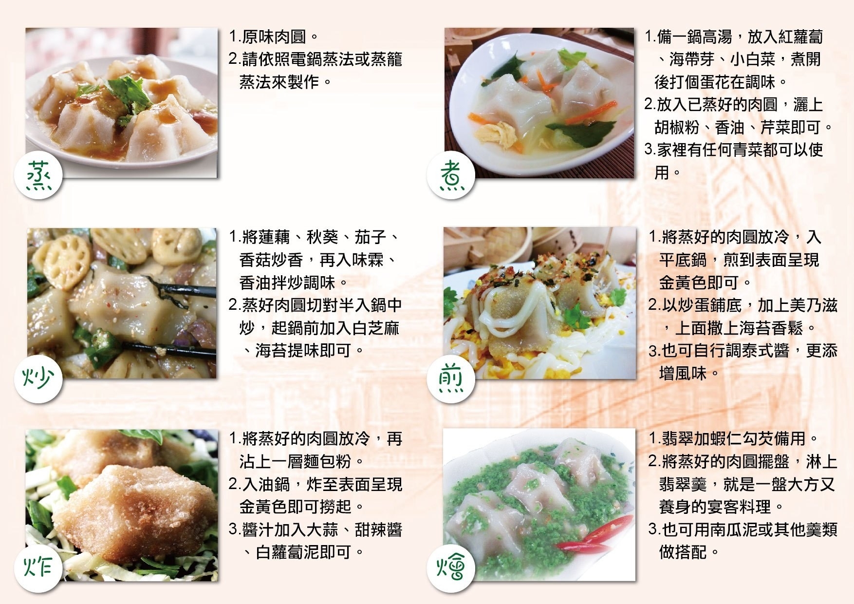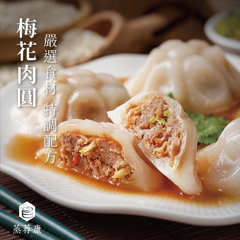❤️蒸荐康-梅花肉圓(55g/顆,10顆/盒) 產地:台灣 成分:外皮:在來米粉、肉圓粉(磷酸化磷酸二澱粉、辛烯基丁二酸鈉澱粉、磷酸二澱粉、樹薯澱粉、丁二酸鈉澱粉)。 內餡:豬肉(台灣)、醬油、高麗菜乾、蔥頭酥(蔥頭、大豆沙拉油)、水、大豆沙拉油、蔗糖、酵母精粉(酵母抽出物、鹽)、白胡椒、清香粉(肉桂粉,大茴香粉,桂圓粉,花椒粉,甘松粉,丁香粉)、鹽、可滋美粉(胺基酸)、蒜頭酥(蒜頭,大豆沙拉油)。 過敏原:本產品含有大豆及其製品,不適合其過敏體質者食用。 醬油包:醬油、蔗糖、香蒜粉、米麩、鹽、蕃薯粉。 辣椒包:辣椒包:黃豆、辣椒、水、乙醯化己二酸二澱粉、鹽、米、苯甲酸、食用黃色五號。 ※內含-醬油2包、辣椒醬2包、DIY手冊1張、蒸籠紙1張。 食用方法: 【電鍋蒸法】 1.放入少許水入電鍋中,再放一瓷碗或蒸網。 2.碗上放一個平盤,盤上擺上蒸籠紙,再擺上肉圓即可蒸。 3.電鍋跳起後悶一下,再掀開,肉圓呈現透明狀,表示已熟,取出後加入醬汁即可食用。 4.醬汁退冰後剪開入鍋中加熱,需攪拌均勻,可加入蒜泥及辣椒醬調味。 【蒸籠蒸法】 1.可於炒菜鍋上放置蒸籠,蒸籠內放置布巾。 2.水開後放入肉圓,大約蒸10分鐘即可食用。 - 1.肉圓從冰箱取出後直接入電鍋蒸,絕不可退冰,時間久會融化成米漿。 2.蒸好後肉圓呈透明狀表示已熟,剛蒸好很軟,回溫一下口感更佳。 3.肉圓請勿重疊。 保存方式:冷凍零下18 ℃以下。 保存期限:未拆封十二個月 ❤️蒸荐康-芋頭肉圓(55g/顆,10顆/盒) 產地:台灣 成分:肉圓外皮:在來米粉、肉圓粉(磷酸化磷酸二澱粉、辛烯基丁二酸鈉澱粉、磷酸二澱粉、樹薯澱粉、丁二酸鈉澱粉)。 肉圓內餡:豬肉、醬油、芋頭、蝦皮、蔥頭酥(紅蔥頭、大豆沙拉油)、水、大豆沙拉油、蔗糖、美力香味料(L-麩酸鈉、琥珀酸二鈉、5'-次黃嘌呤核苷磷酸二鈉、5'-鳥嘌呤核苷磷酸二鈉、DL-胺基丙酸)、健美鮮(食鹽、L-天門冬酸鈉、胺基乙酸DL-胺基丙酸、5'-次黃嘌呤核苷磷酸二鈉、5'-鳥嘌呤核苷磷酸二鈉、琥珀酸二鈉)、雞粉【鹽、麥芽糊精、L-麩酸鈉、糖、玉米澱粉、雞肉粉(含迷迭香萃取物)、香料、酵母萃取物(含鹽)、雞油(含迷迭香萃取物)、棕櫚油、調味劑(5'-次黃嘌呤核苷磷酸二鈉、5'-鳥嘌呤核苷磷酸二鈉)】、白胡椒粉【麩皮粉、麥芽糊精、綠辣椒、胡椒(11%)、玉米澱粉、雞心椒、茶枝、八角、當歸(調味用)﹝純素﹞】、清香粉(肉桂粉、大茴香粉、桂圓粉、花椒粉、甘松粉、丁香粉)、鹽、可滋美粉【胺基酸﹝水解動物蛋白(原料來源:魚)﹞】、蒜頭酥(蒜頭、大豆沙拉油)。 醬包:醬油、蔗糖、香蒜粉(麥芽糊精、蒜頭抽出物、二氧化矽)、米麩、鹽、蕃薯粉。 ※內含-醬油2包、辣椒醬2包、DIY手冊1張、蒸籠紙1張。 食用方法: 【電鍋蒸法】 1.放入少許水入電鍋中,再放一瓷碗或蒸網。 2.碗上放一個平盤,盤上擺上蒸籠紙,再擺上肉圓即可蒸。 3.電鍋跳起後悶一下,再掀開,肉圓呈現透明狀,表示已熟,取出後加入醬汁即可食用。 4.醬汁退冰後剪開入鍋中加熱,需攪拌均勻,可加入蒜泥及辣椒醬調味。 【蒸籠蒸法】 1.可於炒菜鍋上放置蒸籠,蒸籠內放置布巾。 2.水開後放入肉圓,大約蒸10分鐘即可食用。 - 1.肉圓從冰箱取出後直接入電鍋蒸,絕不可退冰,時間久會融化成米漿。 2.蒸好後肉圓呈透明狀表示已熟,剛蒸好很軟,回溫一下口感更佳。 3.肉圓請勿重疊。 保存方式:冷凍零下18 ℃以下。 保存期限:未拆封十二個月