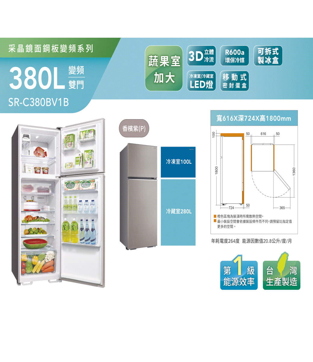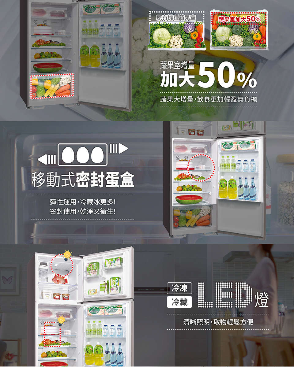 環保斷熱材冰盒 直流變頻壓縮機 R600a環保新冷媒 美背式設計 蔬果保鮮室 隱藏式手把 強化玻璃棚架