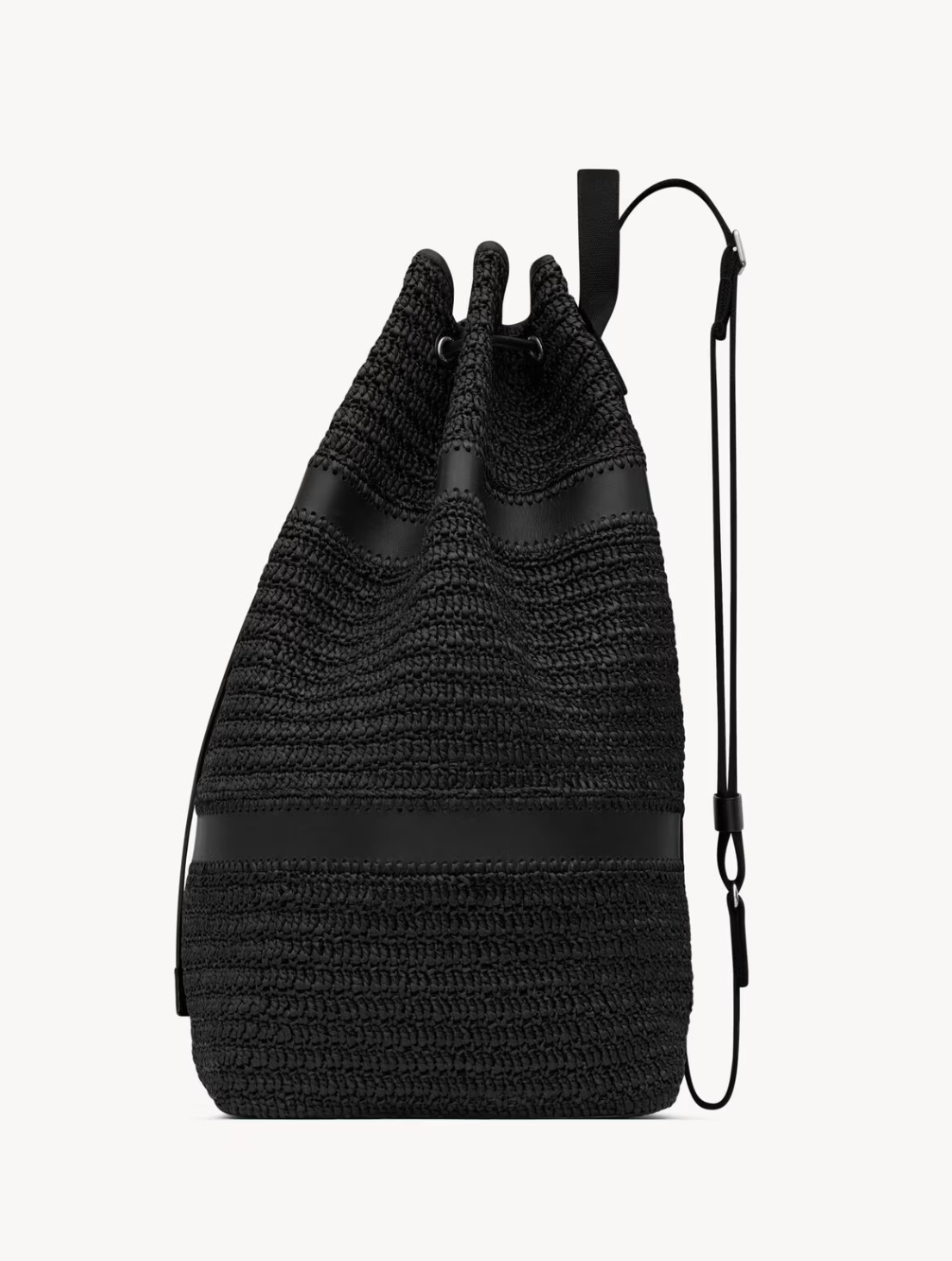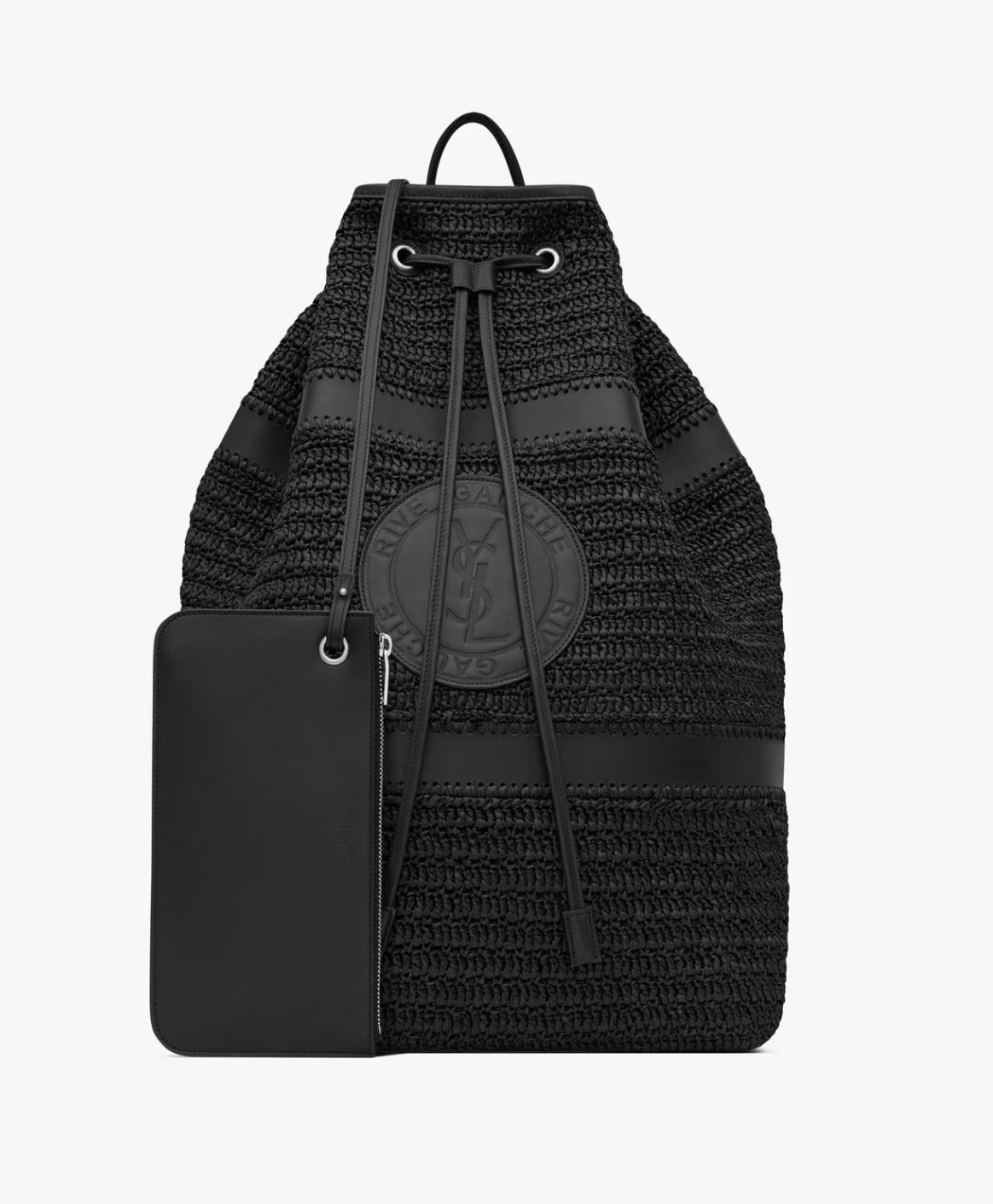 以拉菲草及鞣製皮革製成的吊帶袋,飾以皮製的CASSANDRE RIVE GAUCHE刺繡徽章。
