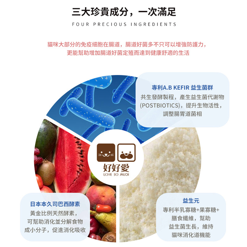主要成分|果寡糖、水溶性膳食纖維、專利半乳寡糖、專利AB.Kefir乳酸菌(嗜酸乳桿菌、長雙崎桿菌、副乾酪乳桿菌、鼠李糖桿菌、瑞士乳桿菌、嗜熱鏈球菌、發酵乳桿菌、克魯維酵母)日本BraziZyme®80種綜合蔬果酵素、鰹魚粉