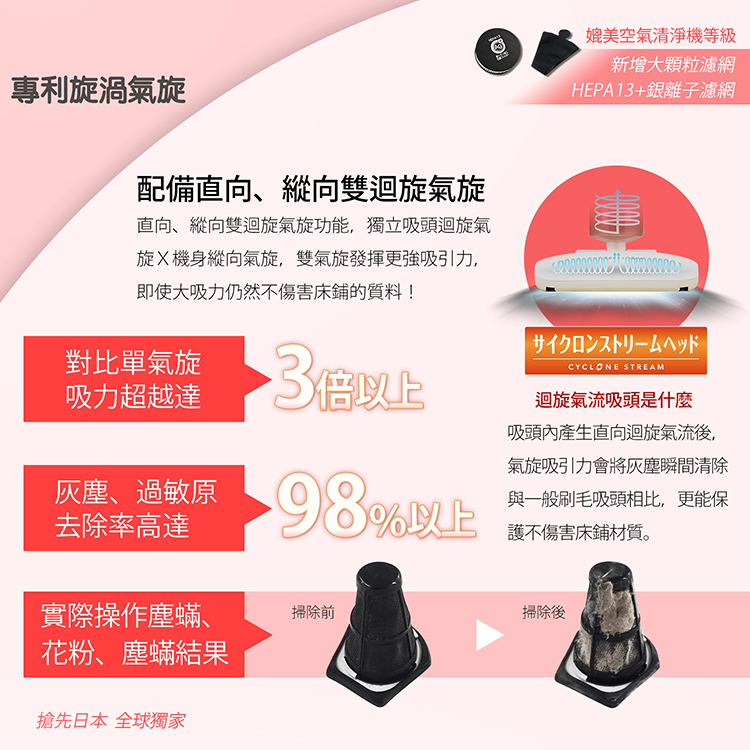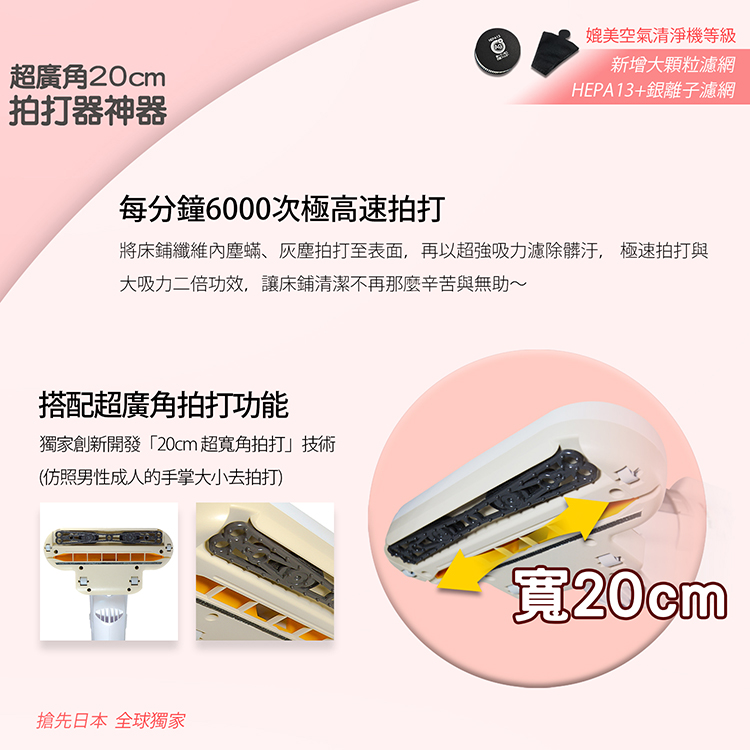 ◦ 每分鐘6000次拍打去除98%以上塵蟎灰塵