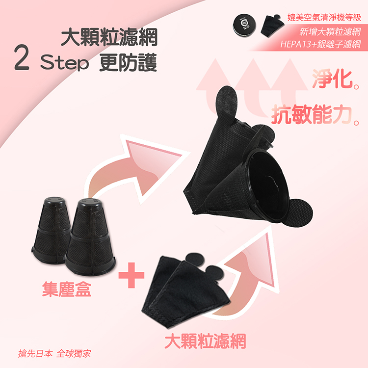 ◦ 商品內容物: 主機一台、說明書一本、HEPA13銀離子濾網一個、集塵盒兩個、一次性使用大顆粒過濾網(25入)