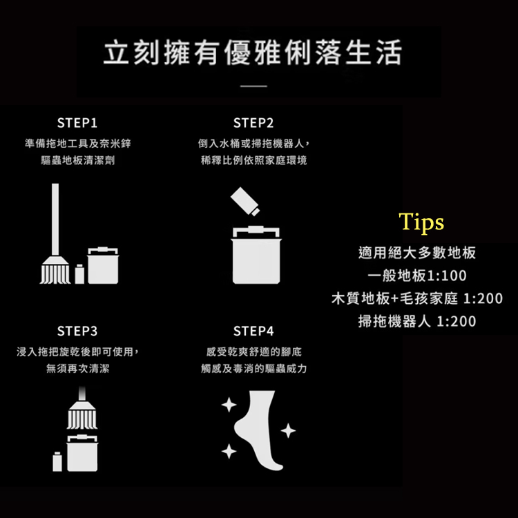 使用方式:一般地板,以1:100 稀釋進清水即可使用