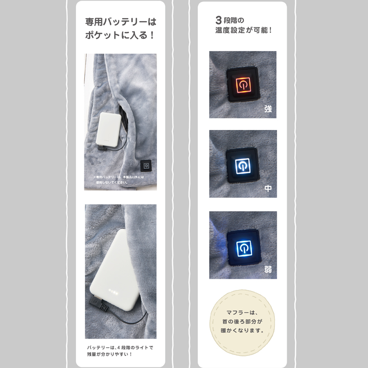 ・冬天最佳好夥伴充電式電熱圍巾 ・可有效率的讓脖子周圍暖活起來 ・附屬專用行動電源,最多可連續使用4小時