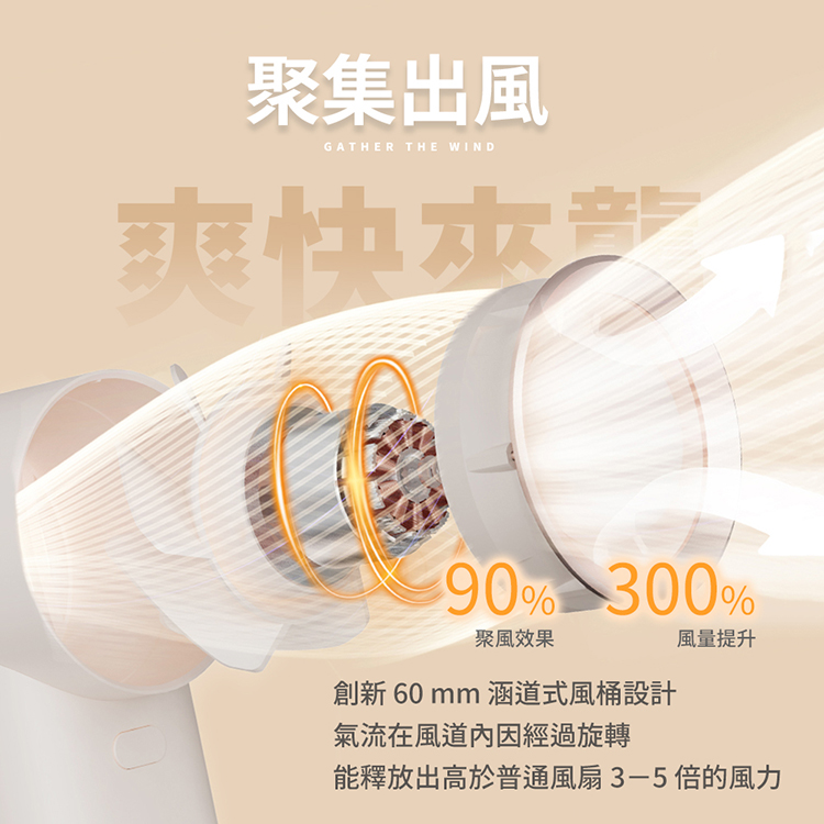 ✅ 60mm涵道式風桶設計,氣流在風道內旋轉,釋放高出於普通風扇更大風力