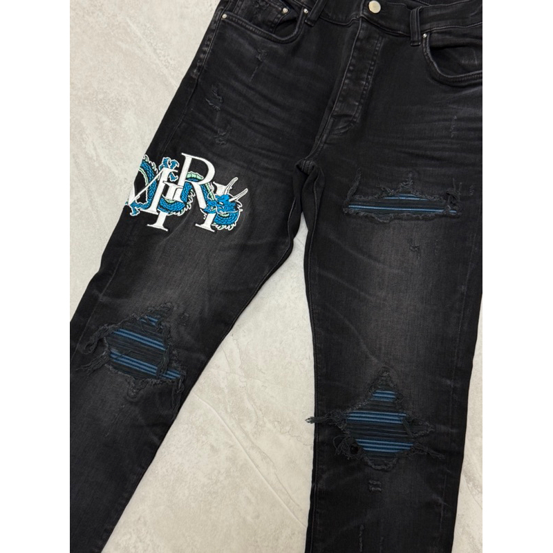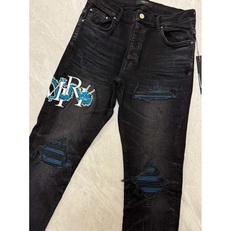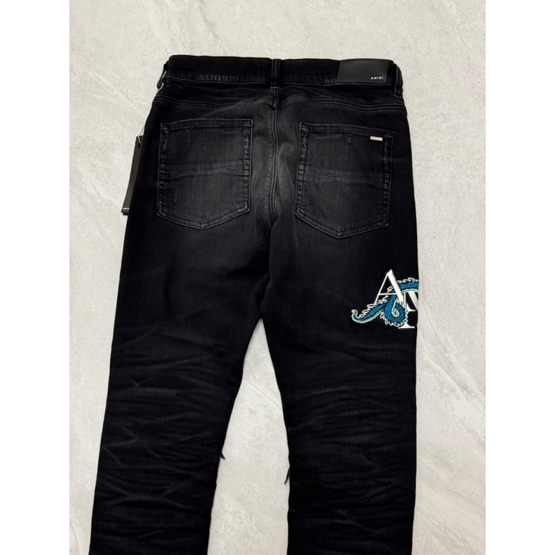AMIRI 經典 刺繡字母搭配龍 設計 黑藍色 牛仔褲