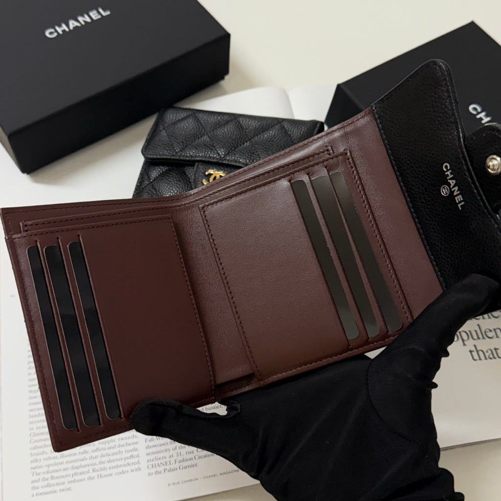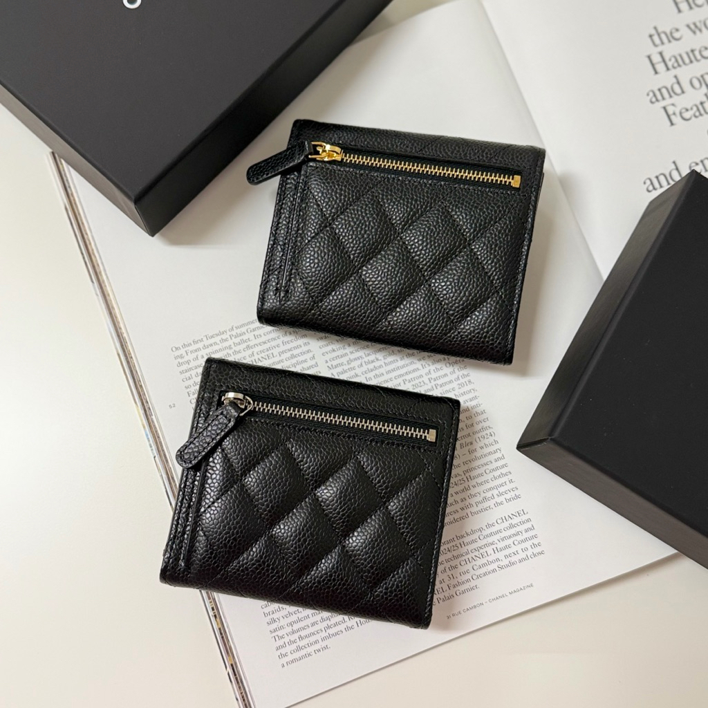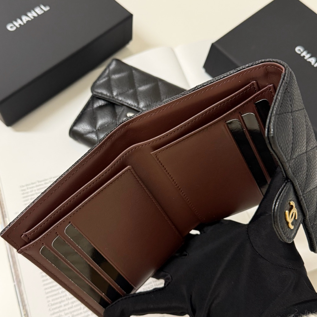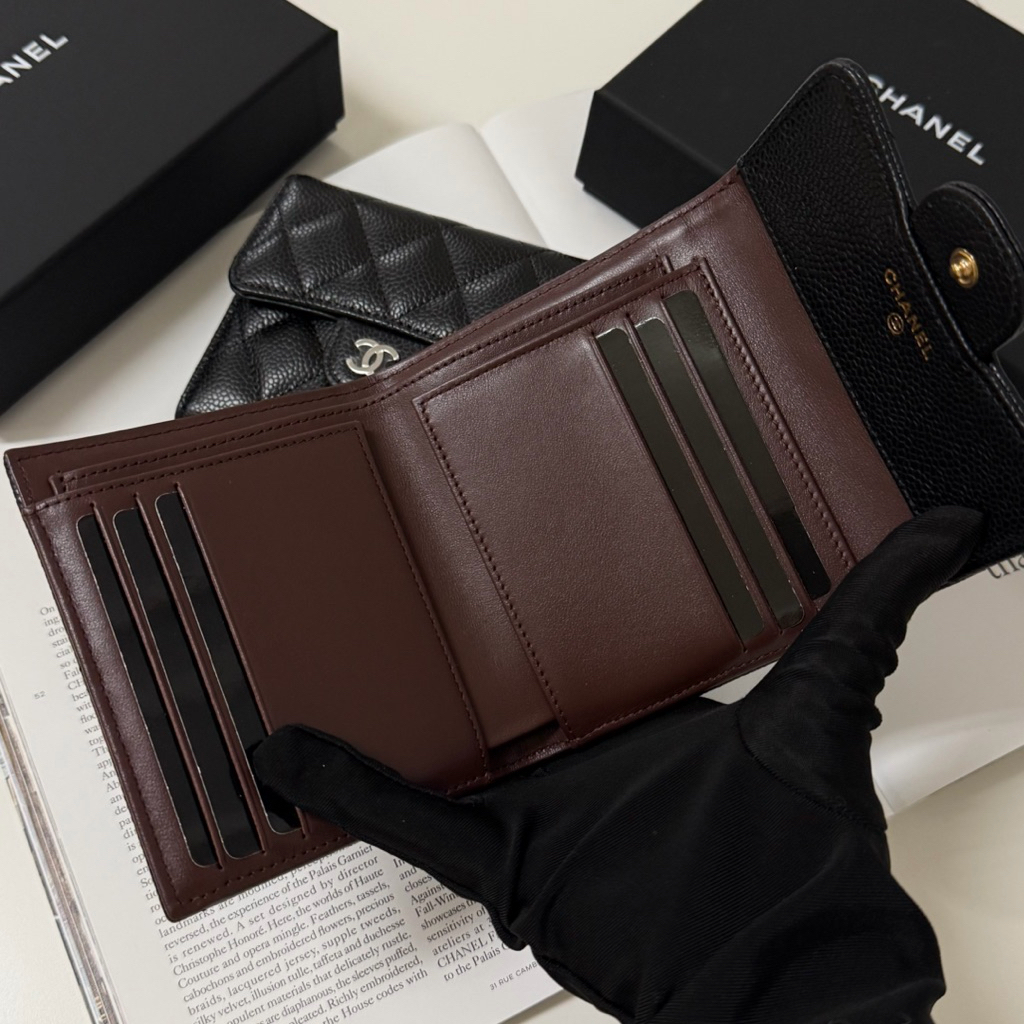 Chanel 香奈兒 菱格紋 荔枝皮革牛皮 黑銀扣 黑金扣 女生 女款 三折 皮夾 短夾