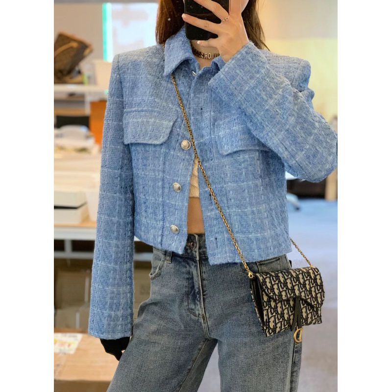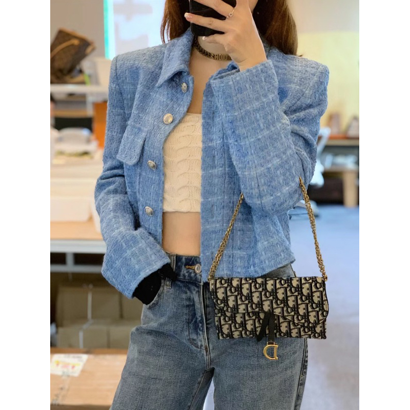 配有鏈帶的 Saddle 長型銀包以藍色 Dior Oblique 緹花製成,是設計時尚簡約的混搭精品。此款式綴以不對稱翻蓋及復古金色飾面金屬 D 形馬蹬。此銀包設有可拆卸鏈式肩帶,可肩背、斜孭或手提