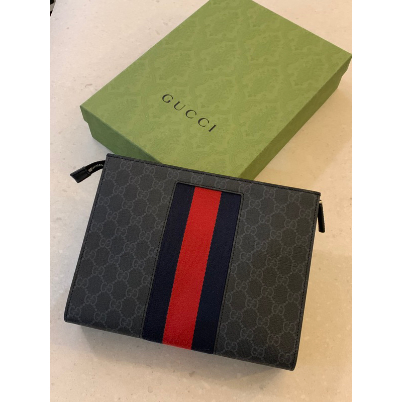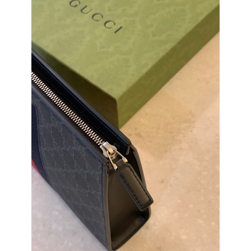 Gucci 經典黑灰色滿版老花Logo搭配藍紅織帶設計 男生 男款 防刮手拿包 預購
