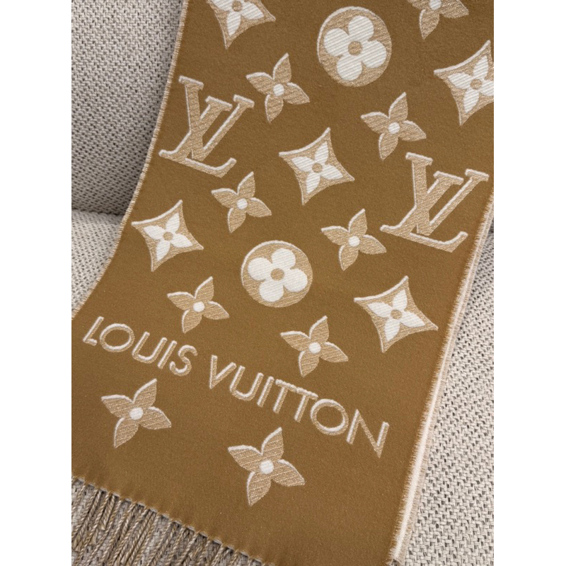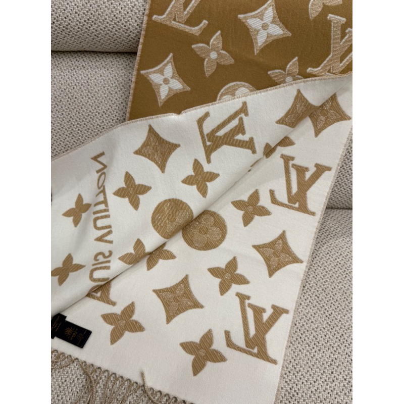 Louis Vuitton LV經典正反雙色搭配滿版Logo設計 雙面可使用 奶茶 金屬纖維 圍巾