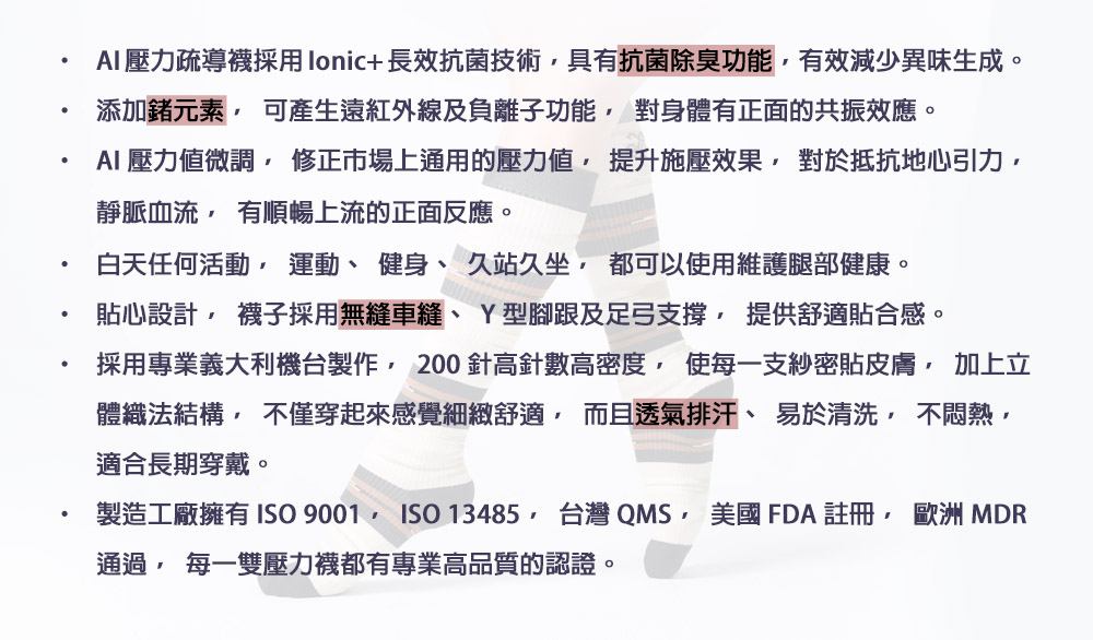 Lucas & Louis致力於以健康為核心,提供您健康全方位的解決方案,開發適合登山健走、運動、久站及久坐族群需求的壓力襪及護具,以及晚上修護身體的Alpha波睡眠衣,為您白天和晚上都有適當的健康紡織品維護您的身體。 我們的每一款產品都經過嚴格的設計和測試,確保其能夠有效支持和提升您的健康狀況。無論是日常保健還是運動防護,我們都希望能夠成為您的健康夥伴,讓每一天都充滿活力與舒適。 Lucas & Louis走在時代的最前端,運用AI計算醫學大數據,對於小腿每一段壓力值微調,不僅擁有全覆蓋式的舒適感,同時也對腿部循環有更正面的引導。對每一個產品,Lucas & Louis都是善用AI科技,務使達到最適化的功能狀態。
