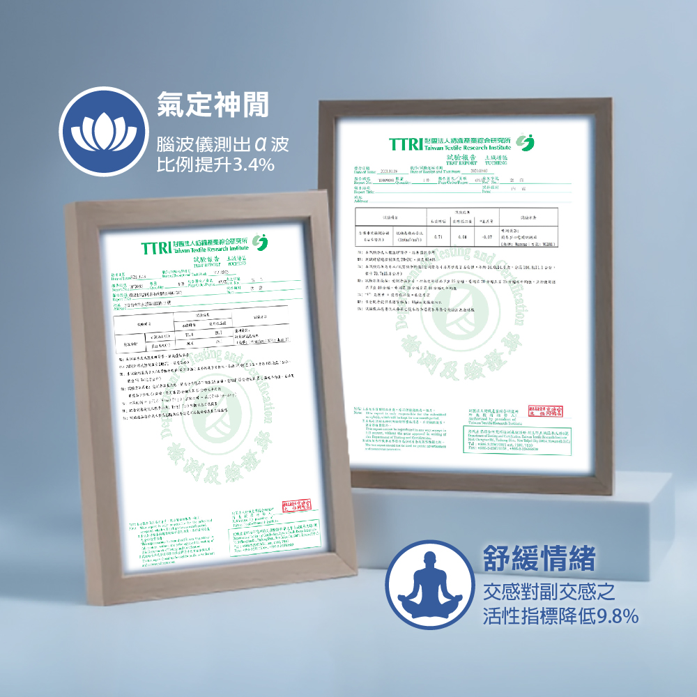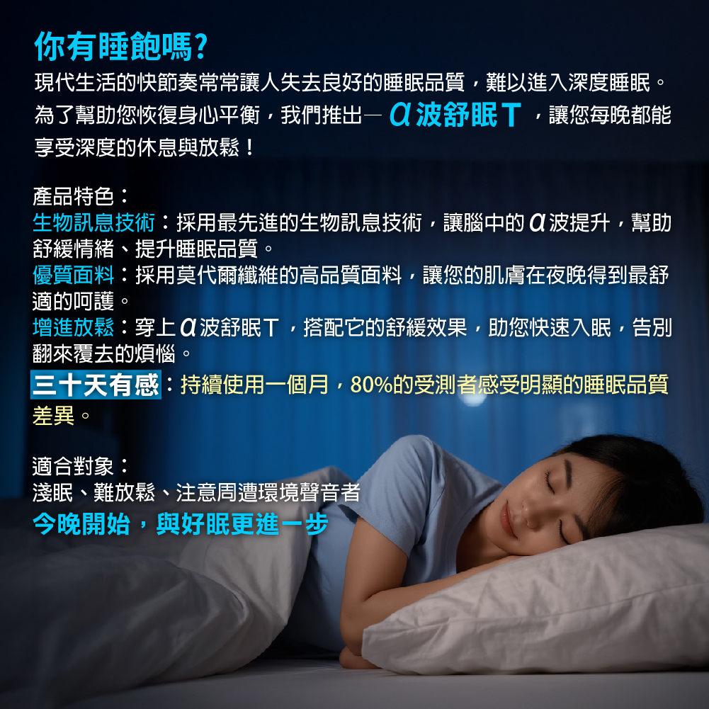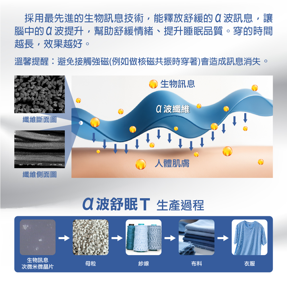 採用最先進的生物訊息技術,能釋放舒緩的α波訊息,讓 腦中的α波提升,幫助舒緩情緒、提升睡眠品質。穿的時間 越長、效果越好。
