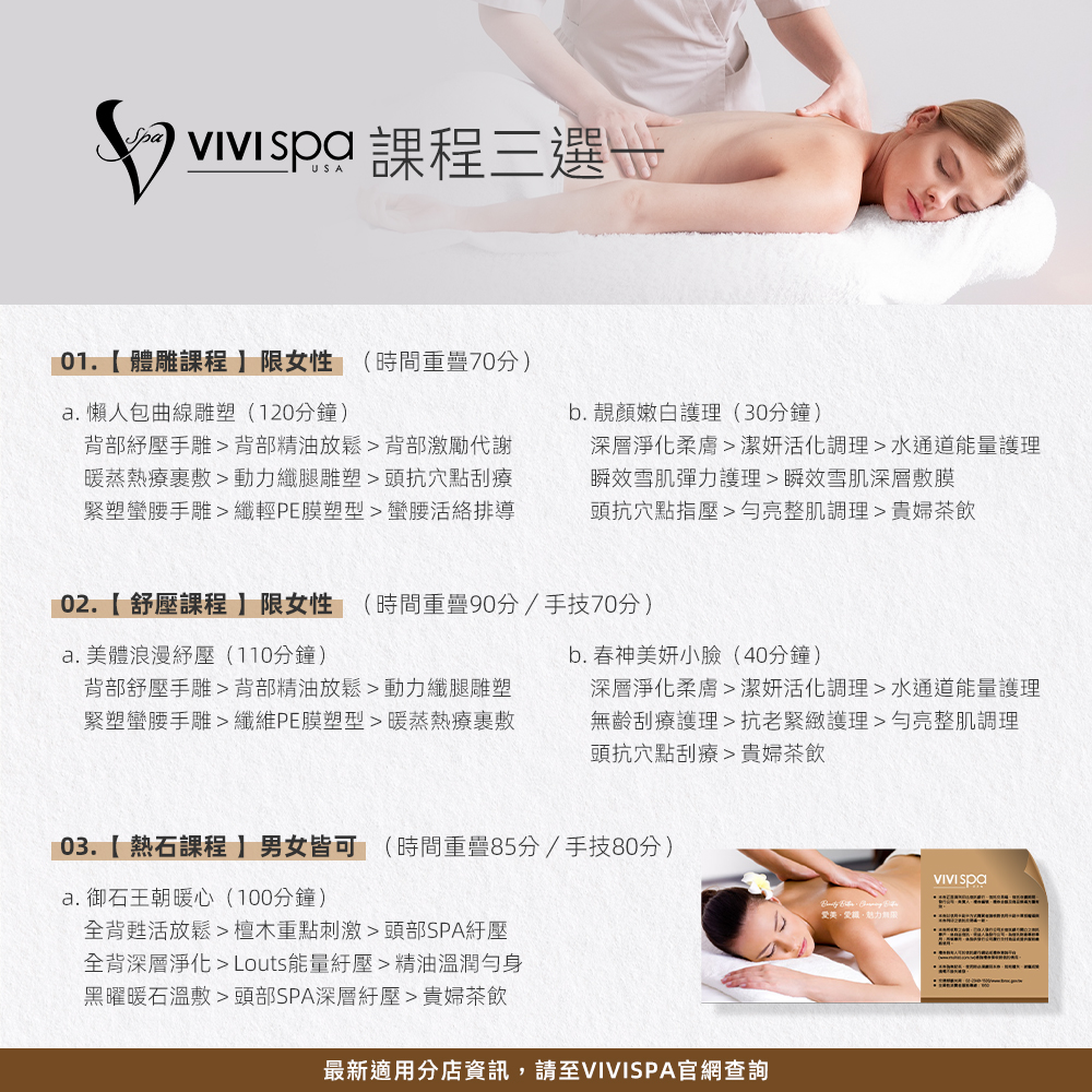 搭配非洲白茅屬植物萃取專利,瞬間於肌底儲存高含量水分,帶來特潤光滑好膚質,讓你24小時日夜水潤。 VIVISPA 頂級課程3選1,讓你從肌膚保養到全身舒壓,都能享受全方位的呵護。