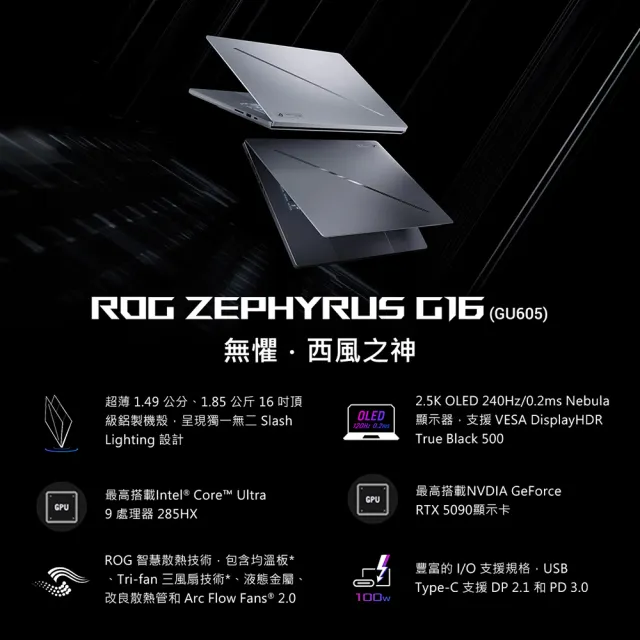 螢幕尺寸: OLED 16" 16:10(薄邊框) / 2.5K (2560 x 1600, WQXGA) / 240Hz / 0.2ms / 對比度 100萬:1 / DCI-P3 % 100% / G-Sync / Pantone 認證 / Dolby Vision HDR / ROG Nebula Display / 1080P FHD IR Camera GPU: NVIDIAR GeForce RTX 5070 Ti 12GB GDDR7 RAM: 64GB LPDDR5X on board 資料儲存應用: 1TB PCIeR 4.0 NVMe M.2 Performance SSD 作業系統: Windows 11 Home I/O連接埠: 1x 3.5mm Combo Audio Jack 1x HDMI 2.1 FRL 2x USB 3.2 Gen 2 Type-A 1x USB 3.2 Gen 2 Type-C 支援 DisplayPort? / power delivery / G-SYNC 1x Type-C USB 4 支援顯示器 / 電源充電 / Thunderbolt? 4 讀卡機 (SD) (UHS-II, 312MB/s) 光碟機:NO 網路功能: Wi-Fi 7(802.11be) (Triple band) 2*2 藍牙裝置: BluetoothR 5.4 Wireless Card 電池: 90WHrs, 4S1P, 4-cell Li-ion AC Adapter:Rectangle Conn, 240W AC Adapter, Output: 20V DC, 12A, 240W, Input: 100~240C AC 50/60Hz universal 尺寸: 35.4 x 24.6 x 1.49 ~ 1.74 cm 重量: 1.95 Kg 鍵盤: 全尺寸背光鍵盤 Touchpad 攝影機:1080P FHD IR Camera for Windows Hello 音效:Smart Amp Technology / Dolby Atmos / AI noise-canceling technology / Hi-Res certification (for headphone) / Built-in 3-microphone array / 4 喇叭(雙動力低音喇叭)系統 保固:2年保固 備註:規格僅供參考,如有任何問題,請依原廠公告為主。 注意事項: 1.根據消保法第19條規定,網路購物消費者均享有商品到貨七天鑑賞期(非試用期)之權益。如欲試用請至原廠展示中心試用;3C商品如電腦、印表機、耗材類(碳粉匣、墨水匣、專用紙儲存媒體如光碟片、磁帶)及軟體類等商品,購買後一經拆封使用或安裝恕不退換,購買前應詳閱原廠之商品規格說明,本公司不接受購買試用後不滿意商品之理由退貨。購買前請務必確認機型是否為您所需! 2.若商品本身瑕疵則可於收到貨品後7日內與我們聯繫換貨。從商品收訖起十天內為退換貨保證期,若超過此期間視同驗收完成不得退換貨。 3.若您所訂購之商品無問題而您欲退貨,退回的商品必須是全新狀態(無拆封),包括主要商品、使用手冊、註冊回函、週邊零件,否則我們有權拒絕接收退貨。 4.若商品因消費者個人不當使用拆卸產生人為因素造成故障、損毀、磨損、擦傷、刮傷、髒汙、包裝破損不完整者,或是發票、附配件不齊者,恕不接受退貨。 5.由於物流公司每日貨量及交通因素,故無法指定到貨時間,確切配達時間皆以物流公司實際可配送時間為主。 6.廠商保留出貨與否之權利,如遇商品缺貨、斷貨或其他不可抗拒之因素。 7.商品說明文案為原廠(供應商)所提供,若有變更敬請參照實際商品為準。 8.建議使用原廠耗材,以免失去保固資格。