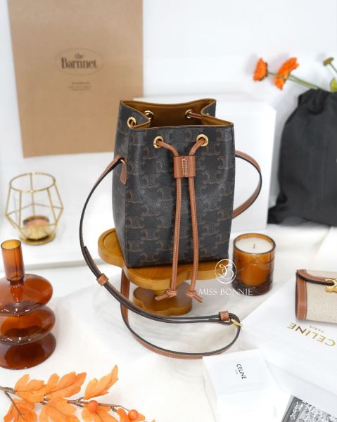 CELINE 凱旋門印花Micro抽繩水桶包-棕色老花(預購)