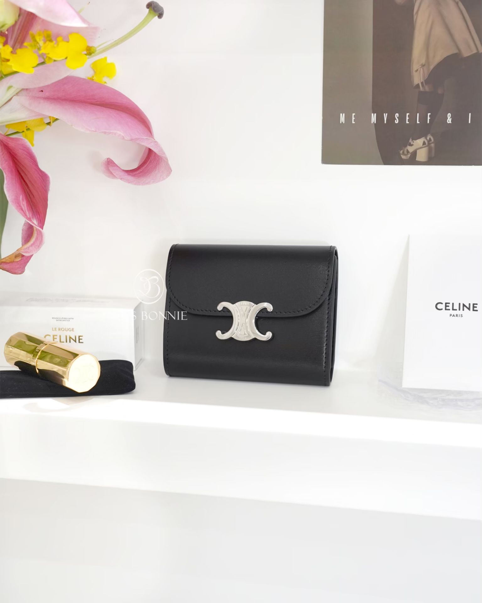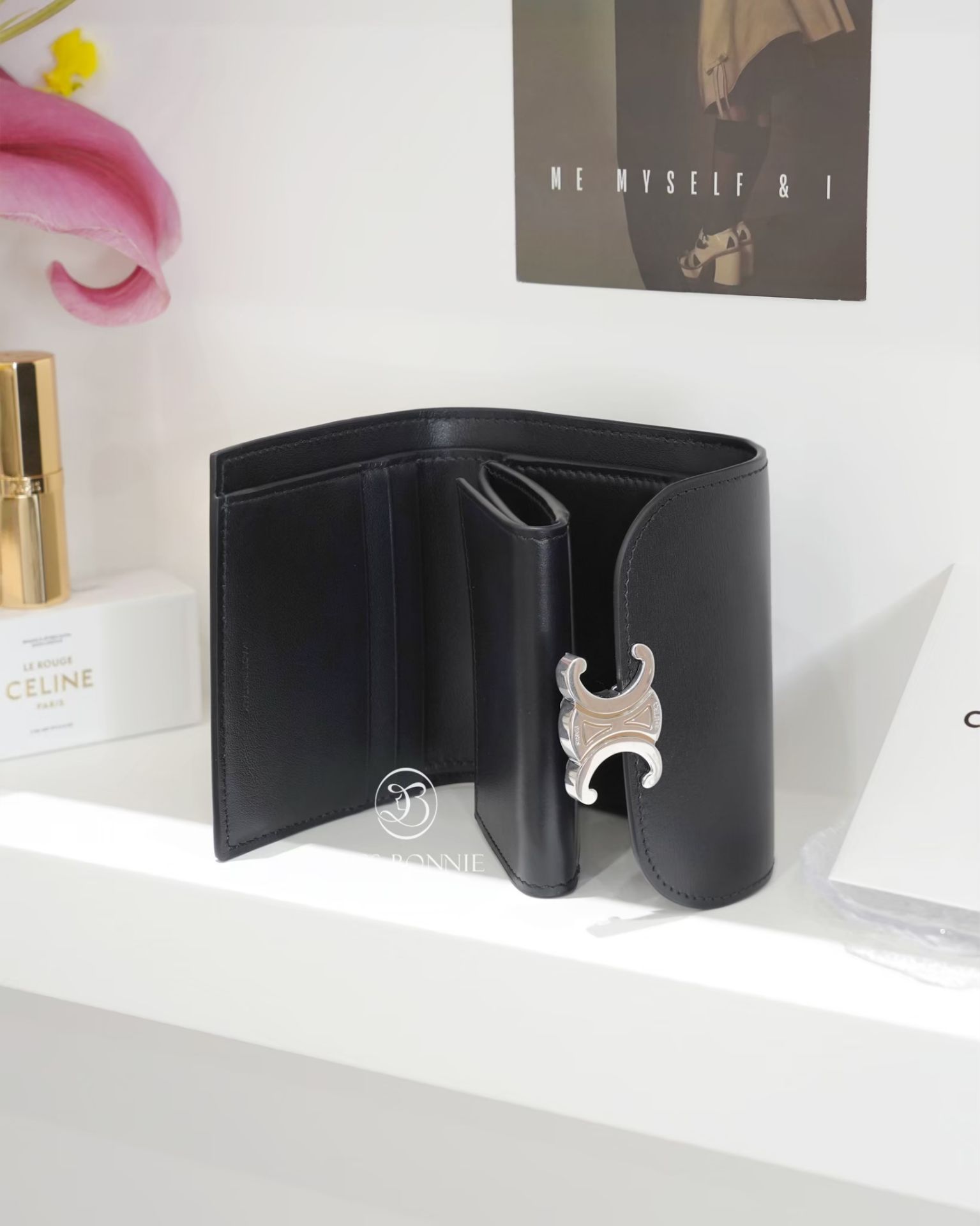 CELINE 凱旋門釦小牛皮短夾-黑色/銀釦(預購)