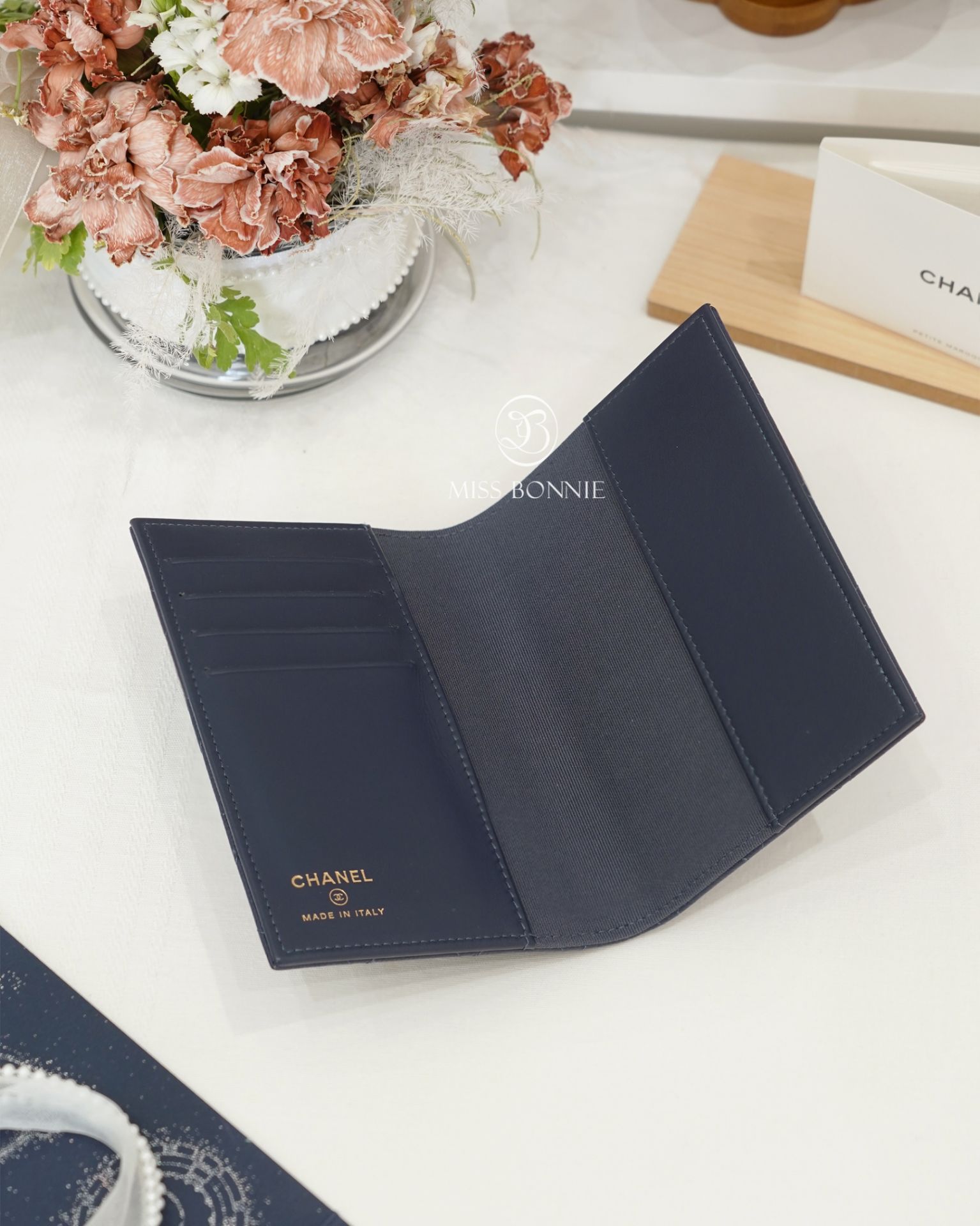 CHANEL 季節款雙C半鑽護照套-深藍色/淡金釦