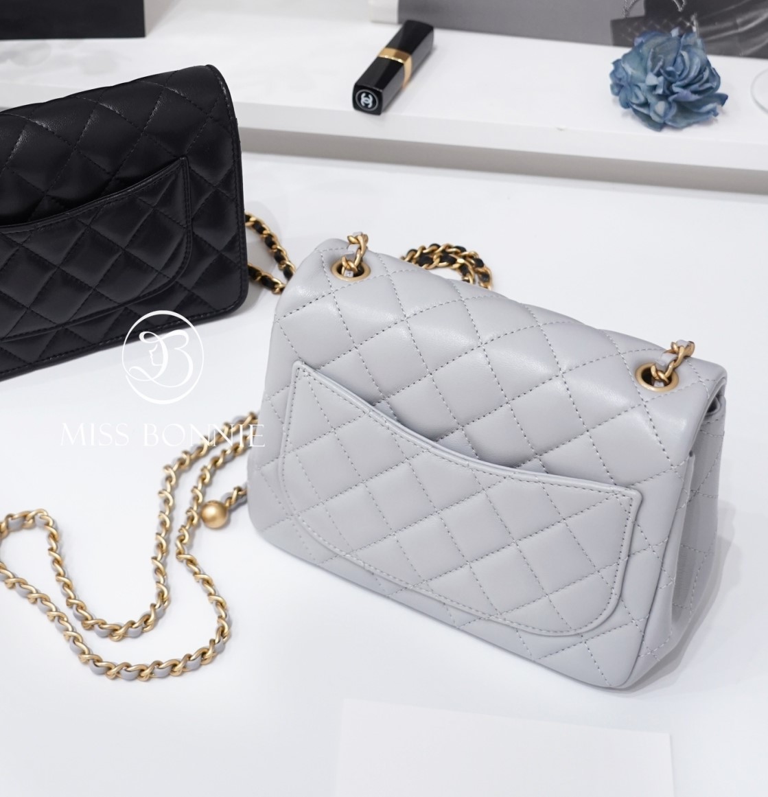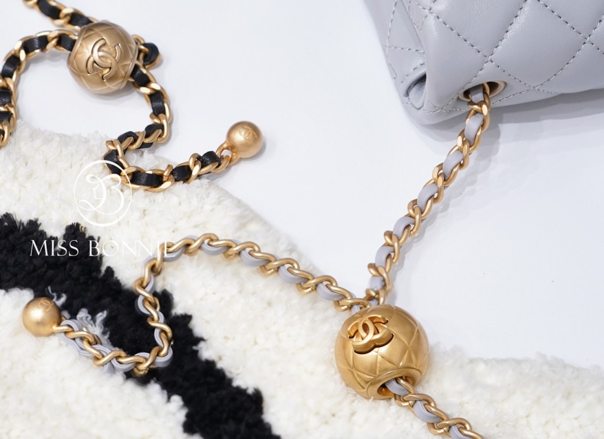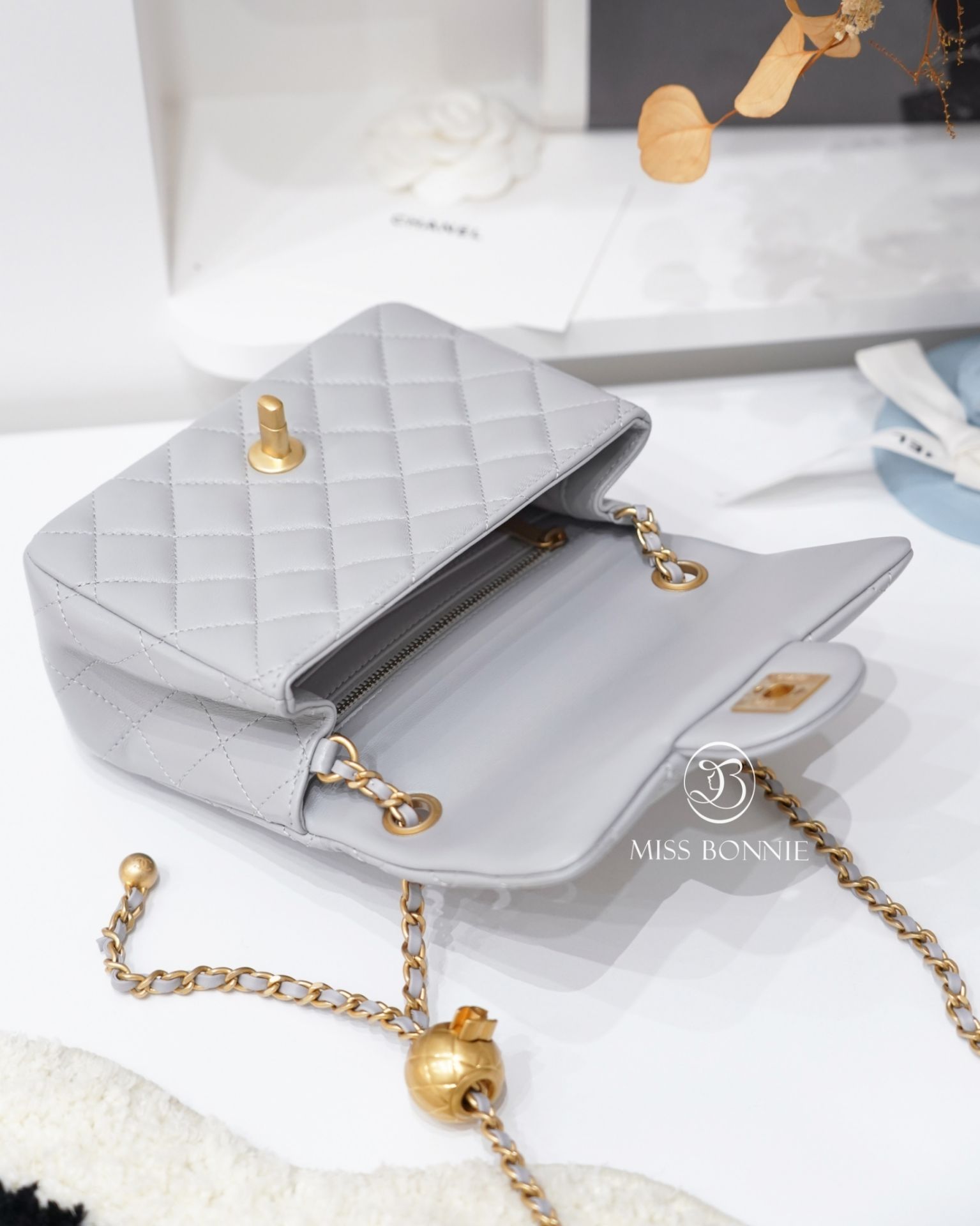 CHANEL Coco小羊皮金球方胖包-灰色/金釦-
